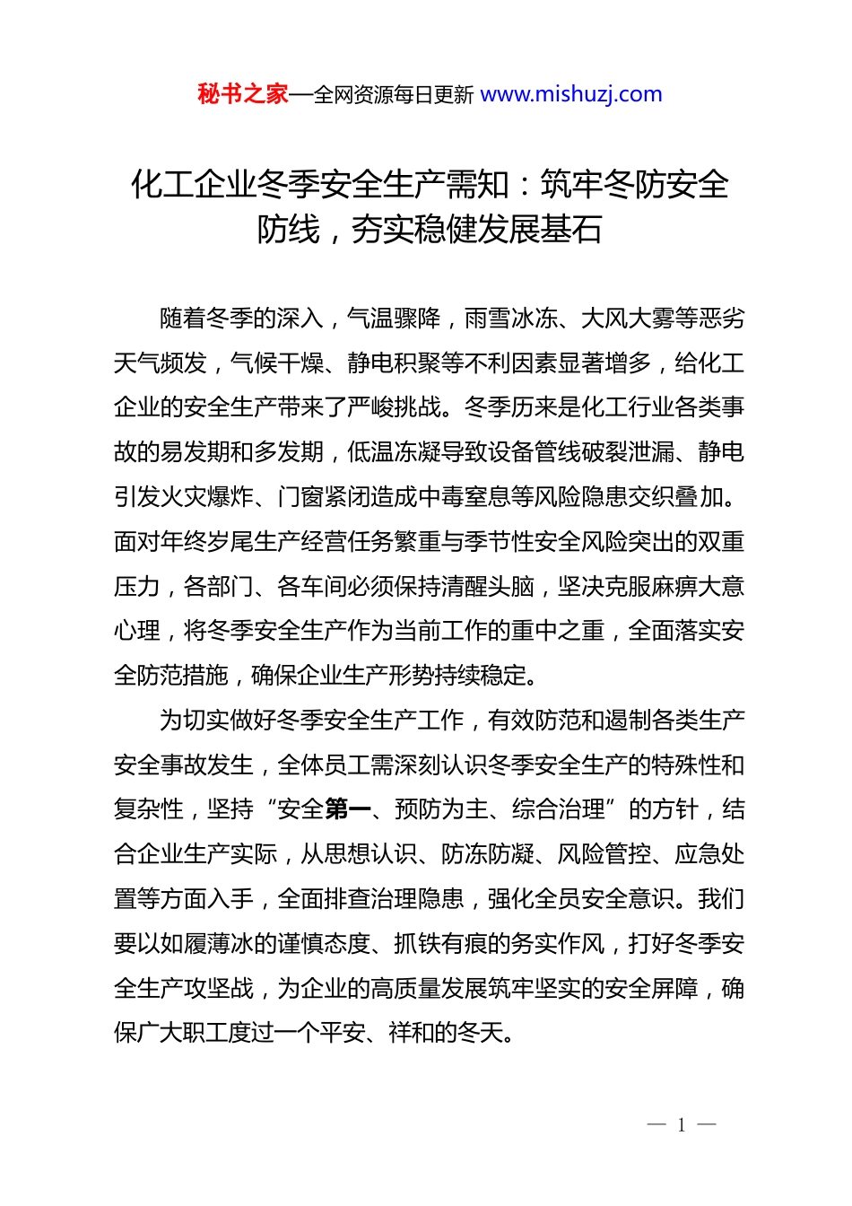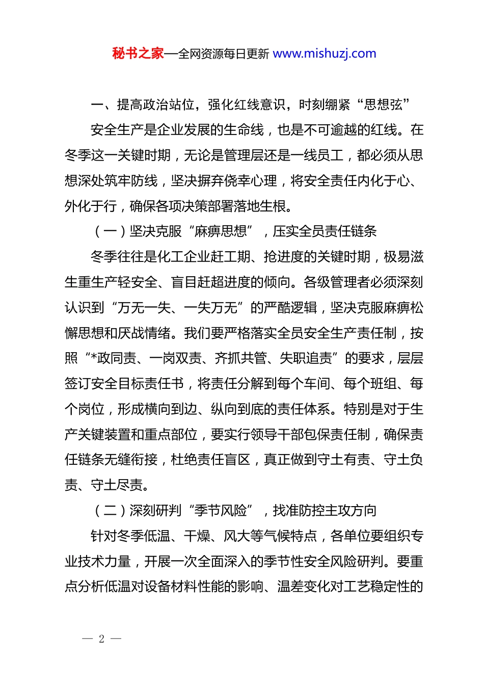 秘书之家—全网资源每日更新 www.mishuzj.com化工企业冬季安全生产需知:筑牢冬防安全防线,夯实稳健发展基石随着冬季的深入,气温骤降,雨雪冰冻、大风大雾等恶劣天气频发,气候干燥、静电积聚等不利因素显著增多,给化工企业的安全生产带来了严峻挑战。冬季历来是化工行业各类事故的易发期和多发期,低温冻凝导致设备管线破裂泄漏、静电引发火灾爆炸、门窗紧闭造成中毒窒息等风险隐患交织叠加。面对年终岁尾生产经营任务繁重与季节性安全风险突出的双重压力,各部门、各车间必须保持清醒头脑,坚决克服麻痹大意心理,将冬季安全生产作为当前工作的重中之重,全面落实安全防范措施,确保企业生产形势持续稳定。为切实做好冬季安全生产工作,有效防范和遏制各类生产安全事故发生,全体员工需深刻认识冬季安全生产的特殊性和复杂性,坚持“安全第一、预防为主、综合治理”的方针,结合企业生产实际,从思想认识、防冻防凝、风险管控、应急处置等方面入手,全面排查治理隐患,强化全员安全意识。我们要以如履薄冰的谨慎态度、抓铁有痕的务实作风,打好冬季安全生产攻坚战,为企业的高质量发展筑牢坚实的安全屏障,确保广大职工度过一个平安、祥和的冬天。— 1 —秘书之家—全网资源每日更新 www.mishuzj.com一、提高政治站位,强化红线意识,时刻绷紧“思想弦”安全生产是企业发展的生命线,也是不可逾越的红线。在冬季这一关键时期,无论是管理层还是一线员工,都必须从思想深处筑牢防线,坚决摒弃侥幸心理,将安全责任内化于心、外化于行,确保各项决策部署落地生根。(一)坚决克服“麻痹思想”,压实全员责任链条冬季往往是化工企业赶工期、抢进度的关键时期,极易滋生重生产轻安全、盲目赶超进度的倾向。各级管理者必须深刻认识到“万无一失、一失万无”的严酷逻辑,坚决克服麻痹松懈思想和厌战情绪。我们要严格落实全员安全生产责任制,按照“*政同责、一岗双责、齐抓共管、失职追责”的要求,层层签订安全目标责任书,将责任分解到每个车间、每个班组、每个岗位,形成横向到边、纵向到底的责任体系。特别是对于生产关键装置和重点部位,要实行领导干部包保责任制,确保责任链条无缝衔接,杜绝责任盲区,真正做到守土有责、守土负责、守土尽责。(二)深刻研判“季节风险”,找准防控主攻方向针对冬季低温、干燥、风大等气候特点,各单位要组织专业技术力量,开展一次全面深入的季节性安全风险研判。要重点分析低温对设备材料性能的影响、温差变化对工艺稳定性的— 2 —秘书之家—全网资源每日更新 www.mishuzj.com干扰以及静电积聚带来的火灾隐患,建立完善的“风险清单”。通过运用 hazop 分析(危险与可操作性分析)、jsa(工作安全分析)等工具,对生产工艺、设备设施、作业环境进行全方位扫描,精准识别潜在的风险点。在此基础上,制定针对性的分级管控措施,明确管控层级、责任人和具体措施,实现风险的动态监测和有效预警,确保将隐患消灭在萌芽状态,牢牢把握安全生产的主动权。(三)严格落实“规章制度”,提升本质安全水平制度的生命力在于执行。在冬季恶劣天气下,严格执行各项安全规章制度显得尤为重要。我们要深入开展反“三违”(违章指挥、违章操作、违反劳动纪律)专项行动,加大现场监督检查力度,对习惯性违章行为保持“零容忍”的高压态势。特别是要强化工艺纪律和劳动纪律的刚性约束,严格执行操作规程,严禁超温、超压、超负荷运行。同时,要建立健全隐患排查治理“闭环管理”机制,对检查发现的问题,按照“五定原则”(定整改方案、定资金来源、定项目负责人、定整改期限、定预案)限期整改到位,坚决杜绝带病运行,从根本上提升企业的本质安全水平。二、聚焦防冻防凝,细化管控措施,织密织牢“防护网”防冻防凝是化工企业冬季安全生产的核心任务,直接关系— 3 —秘书之家—全网资源每日更新 www.mishuzj.com到装置的连续稳定运行。低温环境极易导致管线冻堵、仪表失灵、阀门冻裂,进而引发物料泄漏等严重后果,必须采取细致入微的管控措施,确保设备设施安然过冬。(一)全面排查“盲区死角”,确保设备完好运行各车间要立即开展以防冻...