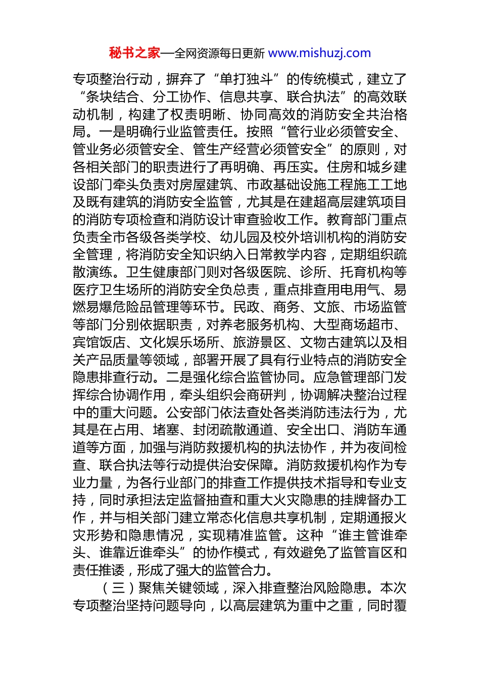 秘书之家—全网资源每日更新 www.mishuzj.com局机关 2025 年消防安全专项整治工作总结为深入贯彻落实市委、市政府关于加强当前安全生产和消防安全工作的决策部署,深刻汲取近期国内外火灾事故教训,xx 市安全生产委员会办公室于 2025 年 xx 月起,在全市范围内组织开展了为期一个月的消防安全专项整治行动。本次行动旨在有效防范化解重大消防安全风险,坚决遏制重特大火灾事故发生,切实保障人民群众生命财产安全,维护全市社会大局持续稳定。现将本次专项整治工作情况总结报告如下。一、基本情况本次专项整治行动坚持高位推动、统筹谋划,聚焦重点、精准发力,部门联动、社会共治,取得了显著成效,全市消防安全形势总体平稳可控。(一)提高思想认识,周密部署专项行动。市委、市政府高度重视当前消防安全工作,主要领导多次作出重要批示,要求各级各部门清醒认识当前消防安全面临的严峻复杂形势,以“时时放心不下”的责任感抓好各项防范工作。2025 年 xx 月 xx 日,按照市委、市政府的统一安排,市安委办迅速响应,印发了《关于扎实开展当前消防安全防范工作的通知》,对全市的专项整治工作进行了全面、细致的部署。为确保行动落到实处,市安委办成立了由主要负责同志任组长,相关部门分管负责同志为成员的专项工作领导小组,负责统筹协调、督导检查。市级财政投入专项经费约 320 万元,用于隐患排查、技术支持、宣传教育及应急装备补充等方面。全市各县区、各部门参照市级模式,迅速成立相应工作机构,制定具体实施方案,形成了“一级抓一级、层层抓落实”的强大工作合力,为专项整治的顺利开展提供了坚实的组织保障和物资支持。(二)强化部门联动,构建齐抓共管工作格局。本次秘书之家—全网资源每日更新 www.mishuzj.com专项整治行动,摒弃了“单打独斗”的传统模式,建立了“条块结合、分工协作、信息共享、联合执法”的高效联动机制,构建了权责明晰、协同高效的消防安全共治格局。一是明确行业监管责任。按照“管行业必须管安全、管业务必须管安全、管生产经营必须管安全”的原则,对各相关部门的职责进行了再明确、再压实。住房和城乡建设部门牵头负责对房屋建筑、市政基础设施工程施工工地及既有建筑的消防安全监管,尤其是在建超高层建筑项目的消防专项检查和消防设计审查验收工作。教育部门重点负责全市各级各类学校、幼儿园及校外培训机构的消防安全管理,将消防安全知识纳入日常教学内容,定期组织疏散演练。卫生健康部门则对各级医院、诊所、托育机构等医疗卫生场所的消防安全负总责,重点排查用电用气、易燃易爆危险品管理等环节。民政、商务、文旅、市场监管等部门分别依据职责,对养老服务机构、大型商场超市、宾馆饭店、文化娱乐场所、旅游景区、文物古建筑以及相关产品质量等领域,部署开展了具有行业特点的消防安全隐患排查行动。二是强化综合监管协同。应急管理部门发挥综合协调作用,牵头组织会商研判,协调解决整治过程中的重大问题。公安部门依法查处各类消防违法行为,尤其是在占用、堵塞、封闭疏散通道、安全出口、消防车通道等方面,加强与消防救援机构的执法协作,并为夜间检查、联合执法等行动提供治安保障。消防救援机构作为专业力量,为各行业部门的排查工作提供技术指导和专业支持,同时承担法定监督抽查和重大火灾隐患的挂牌督办工作,并与相关部门建立常态化信息共享机制,定期通报火灾形势和隐患情况,实现精准监管。这种“谁主管谁牵头、谁靠近谁牵头”的协作模式,有效避免了监管盲区和责任推诿,形成了强大的监管合力。(三)聚焦关键领域,深入排查整治风险隐患。本次专项整治坚持问题导向,以高层建筑为重中之重,同时覆秘书之家—全网资源每日更新 www.mishuzj.com盖社会面各类重点场所,以“拉网式”“地毯式”的排查,确保风险隐患无处遁形。首先,高层建筑火灾风险专项整治成效显著。针对高层建筑体量大、功能复杂、火灾扑救难度大等特点,行动聚焦四个关键方面开展了深入整治。一是在外墙改造施工环节,重点排查了新装外墙保温系统是否采用易燃可燃材料,以及是否违规使用竹(木)脚手架、非阻燃型密目式安全网...