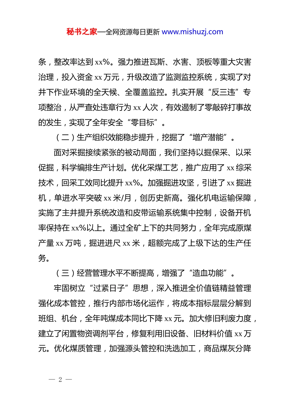 秘书之家—全网资源每日更新 www.mishuzj.com煤矿 2026 年职代会报告:筑牢安全基石深化提质增效各位代表、同志们:现在,我代表矿经营管理班子向大会作工作报告,请予审议,并请列席会议的同志提出意见。本次职代会的主要任务是:坚持以**************思想为指导,全面贯彻落实上级公司和矿*委的各项决策部署,回顾总结 2025 年工作,分析研判当前形势,安排部署 2026 年重点任务,动员全矿干部职工凝心聚力、攻坚克难,为推动矿井高质量发展而努力奋斗。一、回顾 2025 年工作:承压奋进,在克难攻坚中交出“合格答卷”2025 年,是极不平凡的一年。面对地质条件复杂、采掘接续紧张、煤炭市场波动等多重挑战,我们坚持稳中求进工作总基调,统筹发展和安全,圆满完成了各项年度目标任务。(一)安全生产形势持续平稳,守住了“生命防线”。我们始终把安全生产作为压倒一切的政治任务,深入开展“安全生产治本攻坚”三年行动。严格落实全员安全生产责任制,健全完善了“双重预防”机制,全年排查治理各类隐患 xx— 1 —秘书之家—全网资源每日更新 www.mishuzj.com条,整改率达到 xx%。强力推进瓦斯、水害、顶板等重大灾害治理,投入资金 xx 万元,升级改造了监测监控系统,实现了对井下作业环境的全天候、全覆盖监控。扎实开展“反三违”专项整治,从严查处违章行为 xx 人次,有效遏制了零敲碎打事故的发生,实现了全年安全“零目标”。(二)生产组织效能稳步提升,挖掘了“增产潜能”。面对采掘接续紧张的被动局面,我们坚持以掘保采、以采促掘,科学编排生产计划。优化采煤工艺,推广应用了 xx 综采技术,回采工效同比提升 xx%。加强掘进攻坚,引进了 xx 掘进机,单进水平突破 xx 米/月,创历史新高。强化机电运输保障,实施了主井提升系统改造和皮带运输系统集中控制,设备开机率保持在 xx%以上。通过全矿上下的共同努力,全年完成原煤产量 xx 万吨,掘进进尺 xx 米,超额完成了上级下达的生产任务。(三)经营管理水平不断提高,增强了“造血功能”。牢固树立“过紧日子”思想,深入推进全价值链精益管理强化成本管控,推行内部市场化运作,将成本指标层层分解到班组、机台,全年吨煤成本同比下降 xx 元。加大修旧利废力度,建立了闲置物资调剂平台,修复利用旧设备、旧材料价值 xx 万元。优化煤质管理,加强源头管控和洗选加工,商品煤灰分降— 2 —秘书之家—全网资源每日更新 www.mishuzj.com低 xx%,发热量提高 xx 大卡,全年实现利润 xx 万元,经济效益创近年来最好水平。(四)民生福祉持续改善,凝聚了“奋进力量”。坚持发展成果与职工共享,千方百计为职工办实事、解难事。全年投入民生资金 xx 万元,完成了职工食堂改造、公寓楼修缮等“暖心工程”,改善了职工食宿条件。提高了全员安全生产奖标准,职工年人均收入增长 xx%。深入开展“金秋助学”“大病救助”等帮扶活动,救助困难职工 xx 人次,发放救助金 xx 万元。丰富职工文化生活,举办了职工运动会、文艺汇演等活动,矿区和谐稳定局面进一步巩固。在肯定成绩的同时,我们也要清醒地认识到,矿井发展还面临不少困难和问题:一是深部开采地质条件更加复杂,安全管理难度加大;二是采掘接续依然紧张,稳产增产压力较大;三是智能化建设步伐不够快,减人提效成果不明显;四是部分干部职工思想观念陈旧,创新意识和担当精神不足。对于这些问题,我们必须高度重视,采取有力措施加以解决。二、展望 2026 年形势:审时度势,在机遇挑战中明确“进取方向”2026 年,是“十五五”规划谋篇布局的启动之年,也是我矿转型升级、高质量发展的关键之年。从宏观形势看,国家能— 3 —秘书之家—全网资源每日更新 www.mishuzj.com源安全战略持续深入实施,煤炭作为主体能源的地位短期内不会改变,煤炭市场虽有波动但总体保持平稳,这为我们提供了稳定的外部环境。从内部条件看,经过多年的积淀,我们拥有了一支技术精湛、作风过硬的职工队伍,具备了较为完善的安全生产管理体系,特别是随着智能化建设的推进,矿井抗风险能力和核心竞争力将进一步增强。但我们也要看到...