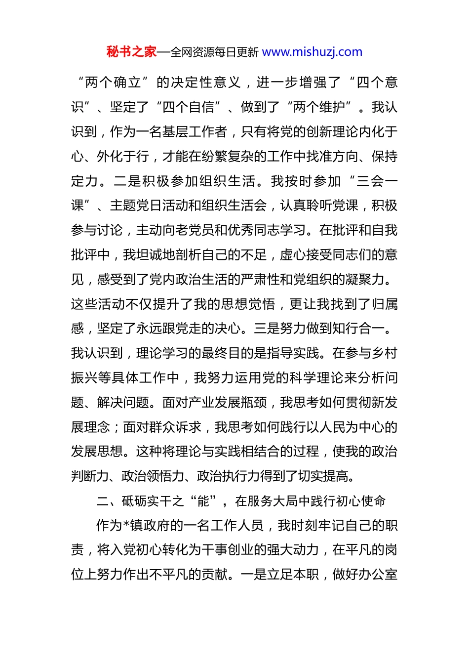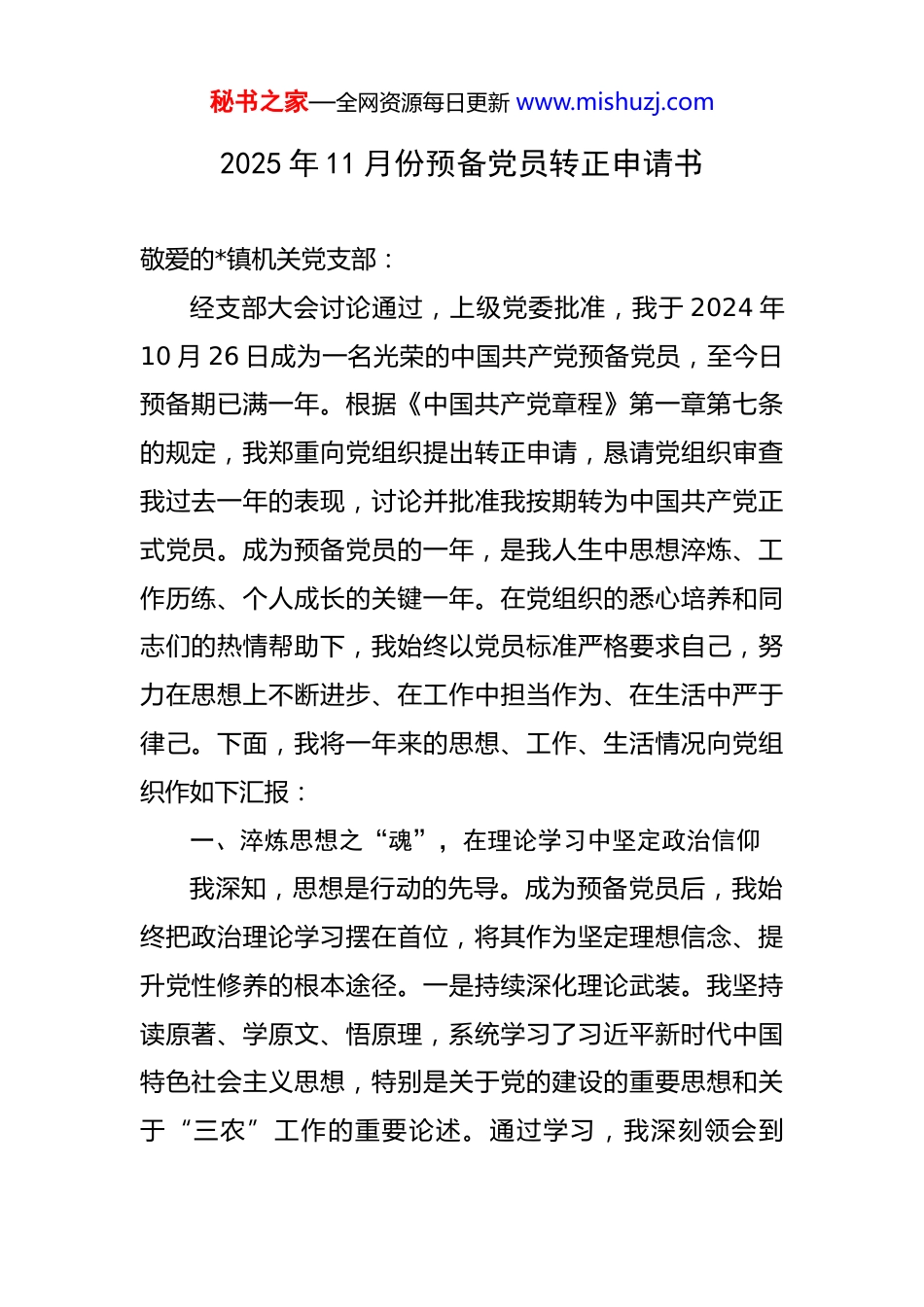 秘书之家—全网资源每日更新 www.mishuzj.com2025 年 11 月份预备党员转正申请书 敬爱的*镇机关党支部:经支部大会讨论通过,上级党委批准,我于 2024 年10 月 26 日成为一名光荣的中国共产党预备党员,至今日预备期已满一年。根据《中国共产党章程》第一章第七条的规定,我郑重向党组织提出转正申请,恳请党组织审查我过去一年的表现,讨论并批准我按期转为中国共产党正式党员。成为预备党员的一年,是我人生中思想淬炼、工作历练、个人成长的关键一年。在党组织的悉心培养和同志们的热情帮助下,我始终以党员标准严格要求自己,努力在思想上不断进步、在工作中担当作为、在生活中严于律己。下面,我将一年来的思想、工作、生活情况向党组织作如下汇报:一、淬炼思想之“魂”,在理论学习中坚定政治信仰我深知,思想是行动的先导。成为预备党员后,我始终把政治理论学习摆在首位,将其作为坚定理想信念、提升党性修养的根本途径。一是持续深化理论武装。我坚持读原著、学原文、悟原理,系统学习了习近平新时代中国特色社会主义思想,特别是关于党的建设的重要思想和关于“三农”工作的重要论述。通过学习,我深刻领会到秘书之家—全网资源每日更新 www.mishuzj.com“两个确立”的决定性意义,进一步增强了“四个意识”、坚定了“四个自信”、做到了“两个维护”。我认识到,作为一名基层工作者,只有将党的创新理论内化于心、外化于行,才能在纷繁复杂的工作中找准方向、保持定力。二是积极参加组织生活。我按时参加“三会一课”、主题党日活动和组织生活会,认真聆听党课,积极参与讨论,主动向老党员和优秀同志学习。在批评和自我批评中,我坦诚地剖析自己的不足,虚心接受同志们的意见,感受到了党内政治生活的严肃性和党组织的凝聚力。这些活动不仅提升了我的思想觉悟,更让我找到了归属感,坚定了永远跟党走的决心。三是努力做到知行合一。我认识到,理论学习的最终目的是指导实践。在参与乡村振兴等具体工作中,我努力运用党的科学理论来分析问题、解决问题。面对产业发展瓶颈,我思考如何贯彻新发展理念;面对群众诉求,我思考如何践行以人民为中心的发展思想。这种将理论与实践相结合的过程,使我的政治判断力、政治领悟力、政治执行力得到了切实提高。二、砥砺实干之“能”,在服务大局中践行初心使命作为*镇政府的一名工作人员,我时刻牢记自己的职责,将入党初心转化为干事创业的强大动力,在平凡的岗位上努力作出不平凡的贡献。一是立足本职,做好办公室秘书之家—全网资源每日更新 www.mishuzj.com综合服务。在办公室工作期间,我始终保持严谨细致、踏实勤勉的工作作风。对于文稿起草、信息报送、会务保障等工作,我兢兢业业、任劳任怨,力求做到零差错、高效率。我深知办公室是承上启下、协调各方的枢纽,我的每一项工作都关系到镇政府的运转效率和整体形象。因此,我主动加班加点,圆满完成了各项交办任务,为全镇工作的顺利开展提供了坚实的后勤保障,工作表现也得到了领导和同事们的认可。二是投身一线,助力乡村全面振兴。我积极响应组织号召,主动参与到全镇的乡村振兴工作中,成为镇乡村振兴办公室的一员。根据我镇乡村振兴办公室的职责要求,我重点参与了巩固拓展脱贫攻坚成果同乡村振兴有效衔接、农村人居环境整治、特色产业发展规划等工作。在 2025 年上半年,我全程参与了“*村美丽乡村示范带建设”项目,深入田间地头,与村干部和群众座谈交流超过 30 次,收集意见建议 50 余条,为项目方案的优化提供了第一手资料。我参照《推进乡村全面振兴典型案例 2025》中的先进经验,结合*村实际,提出了“农旅融合”发展的建议并被采纳。截至 2025 年 9 月,该项目主体工程已全面完工,项目完成率达到 100%,在近期的群众满意度测评中获得了 96%的支持率。通过参与这项工作,我不仅提升了解决农村实际问题的能力,更深刻体会秘书之家—全网资源每日更新 www.mishuzj.com到作为一名共产党员,必须深入基层、心系群众,为群众办 实 事 、 解 难 题 。 三 是 严 守 规 矩 , 服 务 村 级 组 织 换届。2025 年是全县...