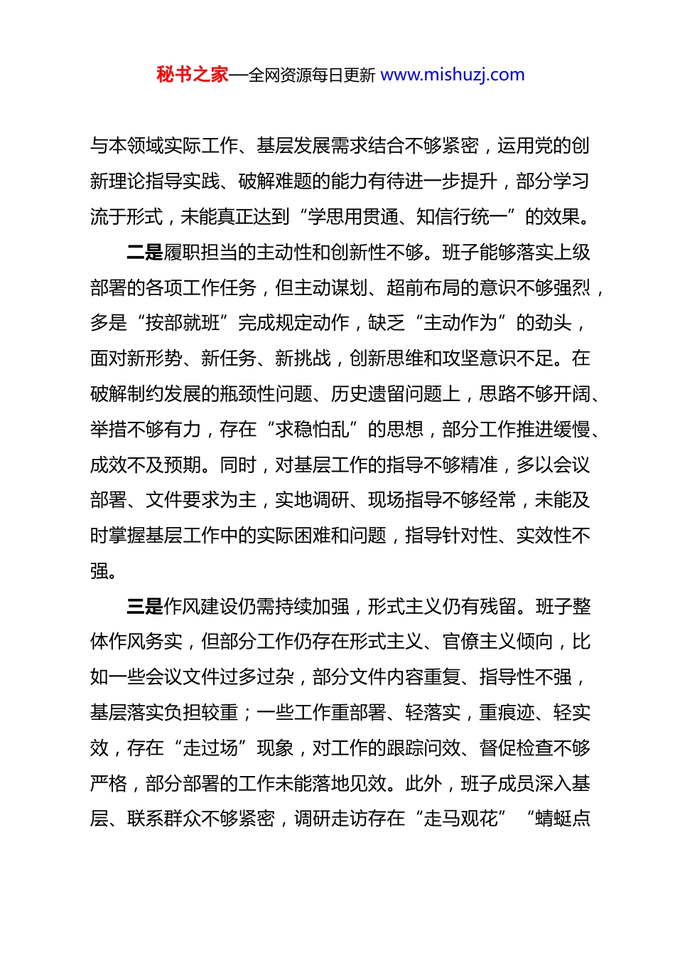 秘书之家—全网资源每日更新 www.mishuzj.com2025 年民主生活会对上级班子及成员的批评意见建议 为深入贯彻落实全面从严治党要求,切实加强上下级协同联动,推动各项工作高质量发展,结合日常工作接触、调研了解情况,本着实事求是、客观公正、坦诚相见、促进提升的原则,现就上级班子及成员履职尽责、作风建设、服务基层等方面存在的不足,提出以下批评意见建议,共计 1600 余字,供上级班子及成员参考。一、对上级班子的整体批评意见建议上级班子整体政治立场坚定,能够坚决贯彻落实党中央决策部署和上级工作要求,履职尽责、担当作为,在统筹推进各项重点工作、破解发展难题、保障民生福祉等方面取得了显著成效,班子凝聚力、战斗力较强。但对照新时代党的建设总要求和高质量发展需要,仍存在一些薄弱环节,具体如下:一是政治理论学习深度和转化力度不足。班子重视政治理论学习,但学习多以传达上级文件、开展集中研讨为主,对习近平新时代中国特色社会主义思想的系统性学习不够深入,对核心要义、精神实质、丰富内涵和实践要求的钻研不够透彻,存在“学用脱节”现象。学习成果转化不够明显,将理论学习秘书之家—全网资源每日更新 www.mishuzj.com与本领域实际工作、基层发展需求结合不够紧密,运用党的创新理论指导实践、破解难题的能力有待进一步提升,部分学习流于形式,未能真正达到“学思用贯通、知信行统一”的效果。二是履职担当的主动性和创新性不够。班子能够落实上级部署的各项工作任务,但主动谋划、超前布局的意识不够强烈,多是“按部就班”完成规定动作,缺乏“主动作为”的劲头,面对新形势、新任务、新挑战,创新思维和攻坚意识不足。在破解制约发展的瓶颈性问题、历史遗留问题上,思路不够开阔、举措不够有力,存在“求稳怕乱”的思想,部分工作推进缓慢、成效不及预期。同时,对基层工作的指导不够精准,多以会议部署、文件要求为主,实地调研、现场指导不够经常,未能及时掌握基层工作中的实际困难和问题,指导针对性、实效性不强。三是作风建设仍需持续加强,形式主义仍有残留。班子整体作风务实,但部分工作仍存在形式主义、官僚主义倾向,比如一些会议文件过多过杂,部分文件内容重复、指导性不强,基层落实负担较重;一些工作重部署、轻落实,重痕迹、轻实效,存在“走过场”现象,对工作的跟踪问效、督促检查不够严格,部分部署的工作未能落地见效。此外,班子成员深入基层、联系群众不够紧密,调研走访存在“走马观花”“蜻蜓点秘书之家—全网资源每日更新 www.mishuzj.com水”的情况,未能真正深入群众、倾听群众呼声、了解群众诉求,对基层群众反映的急难愁盼问题回应不够及时、解决不够彻底,党群干群关系仍有提升空间。四是党建与业务工作融合不够紧密,“两张皮”问题未能根本解决。班子重视党建工作,但在实际工作中,仍存在“重业务、轻党建”的倾向,党建工作多注重完成上级部署的规定动作,缺乏主动谋划、创新推进的意识,党建工作与业务工作衔接不够顺畅、协同不够有力,未能将党建工作有效融入业务工作的各个环节,未能充分发挥党建引领作用。部分党建活动形式单一、内容空洞,与业务工作结合不够紧密,吸引力和感染力不足,党员先锋模范作用发挥不够充分,党建工作服务业务发展的成效不够明显。五是党风廉政建设细节管控不够严格。班子能够落实党风廉政建设主体责任,加强党风廉政教育,但廉政教育形式较为单一,多以观看警示教育片、传达通报案例为主,结合本领域、本岗位实际的针对性警示教育不够,部分干部纪律意识、规矩意识仍需提升。同时,对廉政风险的排查不够全面、不够细致,尤其是对重点岗位、关键环节的廉政风险防控措施不够完善,监督管理不够严格,存在廉政风险隐患。此外,对干部的日常教育管理不够严格,谈心谈话不够经常,对干部身上出现的苗秘书之家—全网资源每日更新 www.mishuzj.com头性、倾向性问题,提醒不够、批评不够,未能及时纠正,抓早抓小、防微杜渐的力度不够。二、对上级班子成员的个人批评意见建议结合班子成员分工履职情况,本着“红脸出汗、排毒治病”的原则,对每位班子成员提出针对性批评意...