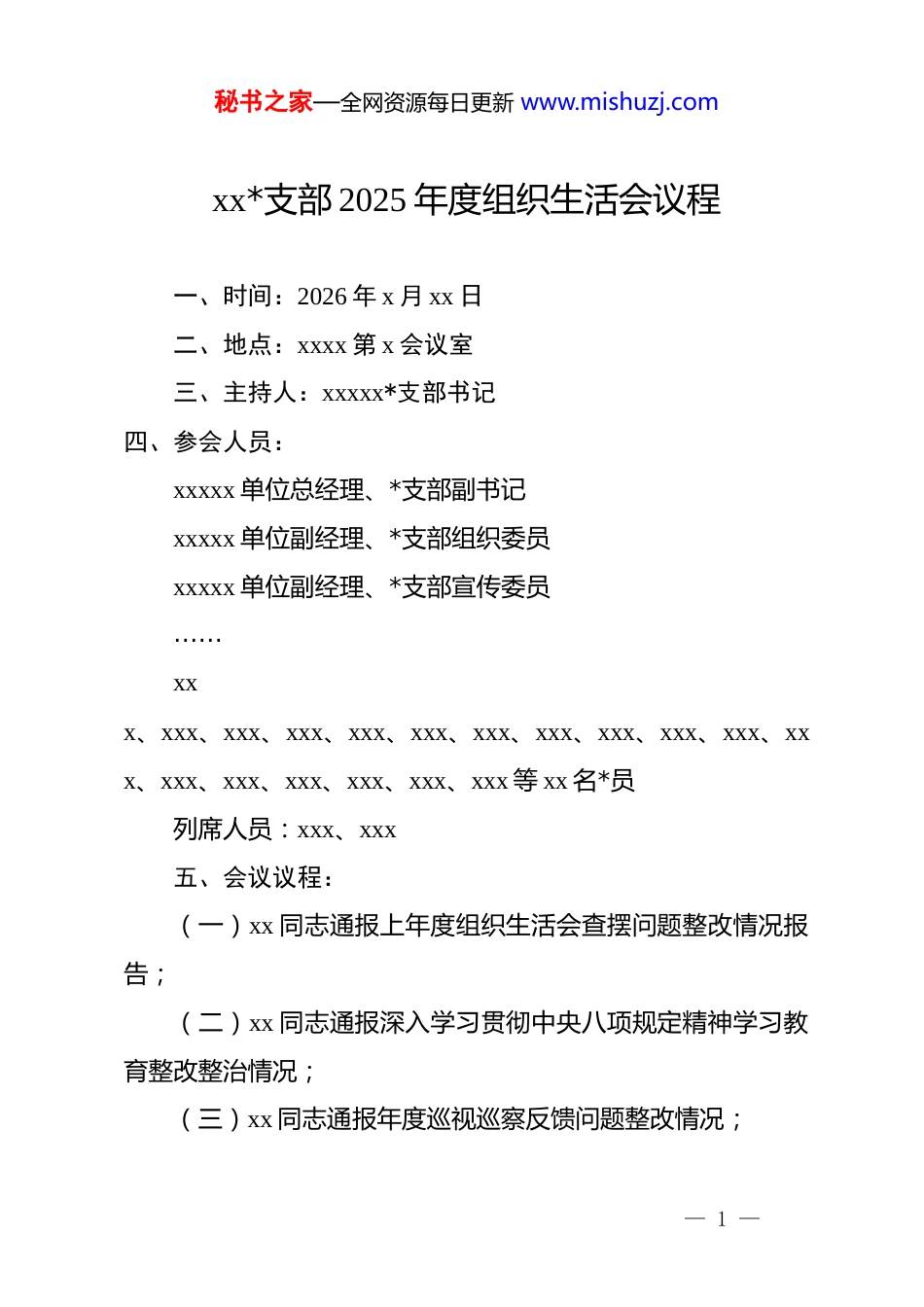 秘书之家—全网资源每日更新 www.mishuzj.comxx*支部 2025 年度组织生活会议程一、时间:2026 年 x 月 xx 日二、地点:xxxx 第 x 会议室三、主持人:xxxxx*支部书记四、参会人员:xxxxx 单位总经理、*支部副书记xxxxx 单位副经理、*支部组织委员xxxxx 单位副经理、*支部宣传委员……xxx、xxx、xxx、xxx、xxx、xxx、xxx、xxx、xxx、xxx、xxx、xxx、xxx、xxx、xxx、xxx、xxx、xxx 等 xx 名*员列席人员:xxx、xxx五、会议议程:(一)xx 同志通报上年度组织生活会查摆问题整改情况报告;(二)xx 同志通报深入学习贯彻中央八项规定精神学习教育整改整治情况;(三)xx 同志通报年度巡视巡察反馈问题整改情况;— 1 —秘书之家—全网资源每日更新 www.mishuzj.com(四)xx 同志通报组织生活会征求意见情况;(五)xx 同志通报本年度组织生活会准备情况报告;(六)xx 同志代表支部委员会作对照检查;(七)支部*员逐一开展自评,作自我批评。每名*员发言后,其他*员对其提出批评意见。发言顺序为:×××、×××、×××、×××、×××;(八)全体*员填写测评表,开展民主评议*员工作;(九)上级领导点评;(如有)(十)×××同志进行会议总结。情况 2:*员人数较多xx*支部2025 年度组织生活会议程一、时间:2026 年 x 月 xx 日二、地点:xxxx 第 x 会议室三、主持人:xxxxx*支部书记四、参会人员:xxxxx 单位总经理、*支部副书记xxxxx 单位副经理、*支部组织委员xxxxx 单位副经理、*支部宣传委员……— 2 —秘书之家—全网资源每日更新 www.mishuzj.comxxx、xxx、xxx、xxx、xxx、xxx、xxx、xxx、xxx、xxx、xxx、xxx、xxx、xxx、xxx、xxx、xxx、xxx 等 xx 名*员列席人员:xxx、xxx五、会议议程:(一)xx 同志通报上年度组织生活会查摆问题整改情况报告;(二)xx 同志通报深入学习贯彻中央八项规定精神学习教育整改整治情况;(三)xx 同志通报年度巡视巡察反馈问题整改情况;(四)xx 同志通报组织生活会征求意见情况;(五)xx 同志通报本年度组织生活会准备情况报告;(六)xx 同志代表支部委员会作对照检查;(七)*支部书记通报各个*小组开展个人自评和*员互评情况;(八)全体*员填写测评表,开展民主评议*员工作;(九)上级领导点评;(如有)(十)×××同志进行会议总结。xx*支部 xx*小组在组织生活会前开展个人自评、*员互评— 3 —秘书之家—全网资源每日更新 www.mishuzj.com议程一、时间:2026 年 x 月 xx 日二、地点:xxxx 第 x 会议室三、主持人:*小组长 xxx四、参会人员:xxx、xxx、xxx、xxx、xxx五、会议议程:(一)*小组长提出民主评议*员的要求,并对个人自评、*员互评的程序进行说明;(二)小组全体*员逐一开展自评,作自我批评。每名*员发 言 后 , 其 他 * 员 对 其 提 出 批 评 意 见 。 发 言 顺 序 为 :xxx、xxx、xxx、xxx、xxx;(三)*小组长对个人自评、*员互评情况进行总结。— 4 —