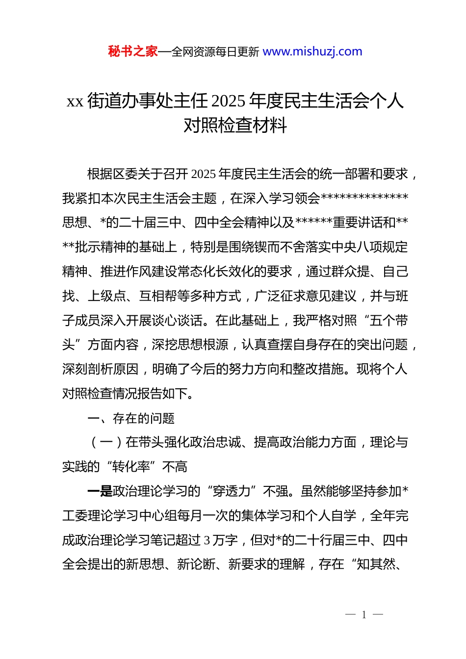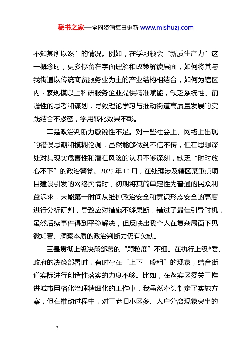 秘书之家—全网资源每日更新 www.mishuzj.comxx 街道办事处主任 2025 年度民主生活会个人对照检查材料根据区委关于召开 2025 年度民主生活会的统一部署和要求,我紧扣本次民主生活会主题,在深入学习领会**************思想、*的二十届三中、四中全会精神以及******重要讲话和****批示精神的基础上,特别是围绕锲而不舍落实中央八项规定精神、推进作风建设常态化长效化的要求,通过群众提、自己找、上级点、互相帮等多种方式,广泛征求意见建议,并与班子成员深入开展谈心谈话。在此基础上,我严格对照“五个带头”方面内容,深挖思想根源,认真查摆自身存在的突出问题,深刻剖析原因,明确了今后的努力方向和整改措施。现将个人对照检查情况报告如下。一、存在的问题(一)在带头强化政治忠诚、提高政治能力方面,理论与实践的“转化率”不高一是政治理论学习的“穿透力”不强。虽然能够坚持参加*工委理论学习中心组每月一次的集体学习和个人自学,全年完成政治理论学习笔记超过 3 万字,但对*的二十行届三中、四中全会提出的新思想、新论断、新要求的理解,存在“知其然、— 1 —秘书之家—全网资源每日更新 www.mishuzj.com不知其所以然”的情况。例如,在学习领会“新质生产力”这一概念时,更多停留在字面理解和政策解读层面,如何将其与我街道以传统商贸服务业为主的产业结构相结合,如何为辖区内 2 家规模以上科研服务企业提供精准赋能,缺乏系统性、前瞻性的思考和谋划,导致理论学习与推动街道高质量发展的实践结合不紧密,学用转化效果不彰。二是政治判断力敏锐性不足。对一些社会上、网络上出现的错误思潮和模糊论调,虽然能够做到不信不传,但在思想深处对其现实危害性和潜在风险的认识不够深刻,缺乏“时时放心不下”的政治警觉。2025 年 10 月,在处理涉及辖区某重点项目建设引发的网络舆情时,初期将其简单定性为普通的民众利益诉求,未能第一时间从维护政治安全和意识形态安全的高度进行分析研判,导致应对措施不够果断,错过了最佳引导时机,虽然后续事件得到平稳解决,但反映出我个人在复杂局面下见微知著、洞察本质的政治判断力仍有欠缺。三是贯彻上级决策部署的“颗粒度”不细。在执行上级*委、政府的决策部署时,有时存在“上下一般粗”的现象,结合街道实际进行创造性落实的力度不够。比如,在落实区委关于推进城市网格化治理精细化的工作中,我虽然牵头制定了实施方案,但在推动过程中,对于老旧小区多、人户分离现象突出的— 2 —秘书之家—全网资源每日更新 www.mishuzj.comxx 社区和商业楼宇集中、流动人口管理难度大的 xx 社区,未能拿出更具针对性的“一区一策”管理办法,导致全街道网格员平均上报事件处置效率虽然达到 92%,但上述两个社区的处置效率仅为 86%,拖了整体后腿,说明我在将宏观政策精准滴灌到“神经末梢”的环节上思考不深、用力不足。(二)在带头固本培元、增强*性方面,*性与俗务的“平衡点”不准一是理想信念的“总开关”拧得不紧。作为在*旗下成长起来的干部,对*的忠诚是毋庸置疑的。但随着工作阅历的增长,有时会不自觉地产生“船到码头车到站”的松懈思想,革命意志和奋斗精神有所消减。面对街道繁重的日常事务所带来的压力,有时会产生“多做多错、少做少错”的念头,习惯于用事务工作的繁忙代替*性锻炼的坚韧,导致在攻坚克难时,那股“敢教日月换新天”的闯劲和锐气有所退化,共产*人应有的精神追求蒙上了一层“事务主义”的尘埃。二是*性修养的自觉性主动性不够。在日常工作中,过多地关注经济指标、民生项目等“显性”任务的完成情况,对自身*性修养这一“隐性”工程的投入时间和精力不足。满足于按时参加组织生活,但在“吾日三省吾身”的主动性上做得不好。例如,在“三会一课”中,更多的是以领导身份作要求、提希— 3 —秘书之家—全网资源每日更新 www.mishuzj.com望,而以普通*员身份把自己摆进去,进行深刻的*性分析和灵魂叩问不够,缺乏闻过则喜、动真碰硬的思想自觉,导致自我净化、自我完善的能力提升缓慢。三是*章*规 dj 的学习内化不足。对*章*规 dj 的学习,有时存在“要我...