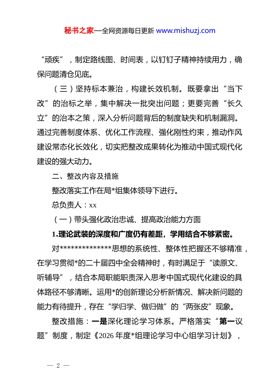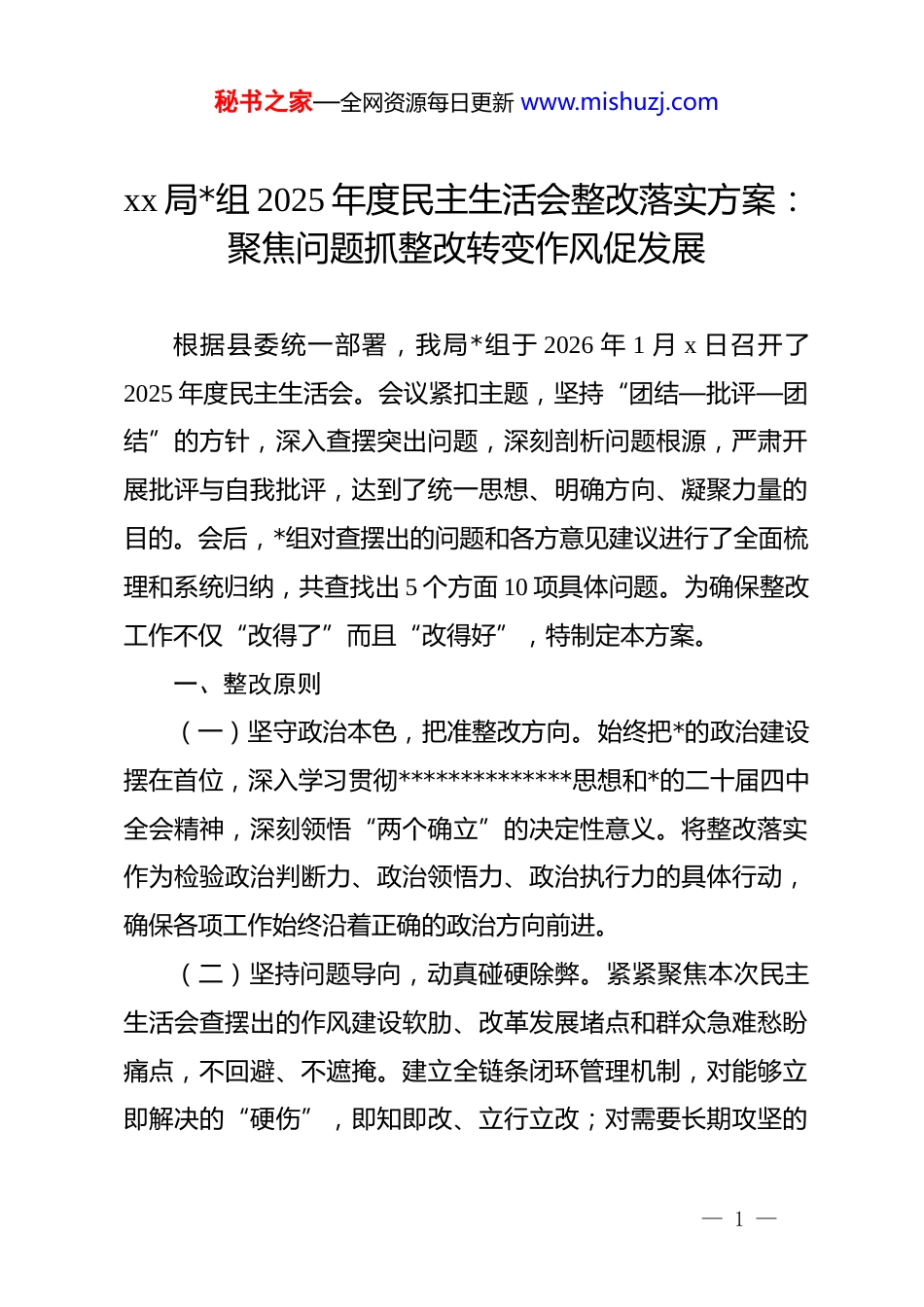 秘书之家—全网资源每日更新 www.mishuzj.comxx 局*组 2025 年度民主生活会整改落实方案:聚焦问题抓整改转变作风促发展根据县委统一部署,我局*组于 2026 年 1 月 x 日召开了2025 年度民主生活会。会议紧扣主题,坚持“团结—批评—团结”的方针,深入查摆突出问题,深刻剖析问题根源,严肃开展批评与自我批评,达到了统一思想、明确方向、凝聚力量的目的。会后,*组对查摆出的问题和各方意见建议进行了全面梳理和系统归纳,共查找出 5 个方面 10 项具体问题。为确保整改工作不仅“改得了”而且“改得好”,特制定本方案。一、整改原则(一)坚守政治本色,把准整改方向。始终把*的政治建设摆在首位,深入学习贯彻**************思想和*的二十届四中全会精神,深刻领悟“两个确立”的决定性意义。将整改落实作为检验政治判断力、政治领悟力、政治执行力的具体行动,确保各项工作始终沿着正确的政治方向前进。(二)坚持问题导向,动真碰硬除弊。紧紧聚焦本次民主生活会查摆出的作风建设软肋、改革发展堵点和群众急难愁盼痛点,不回避、不遮掩。建立全链条闭环管理机制,对能够立即解决的“硬伤”,即知即改、立行立改;对需要长期攻坚的— 1 —秘书之家—全网资源每日更新 www.mishuzj.com“顽疾”,制定路线图、时间表,以钉钉子精神持续用力,确保问题清仓见底。(三)坚持标本兼治,构建长效机制。既要拿出“当下改”的治标之举,集中解决一批突出问题;更要完善“长久立”的治本之策,深入分析问题背后的制度缺失和机制漏洞。通过完善制度体系、优化工作流程、强化刚性约束,推动作风建设常态化长效化,切实把整改成果转化为推动中国式现代化建设的强大动力。二、整改内容及措施整改落实工作在局*组集体领导下进行。总负责人:xx(一)带头强化政治忠诚、提高政治能力方面1.理论武装的深度和广度仍有差距,学用结合不够紧密。对**************思想的系统性、整体性把握还不够精准,在学习贯彻*的二十届四中全会精神时,有时满足于“读原文、听辅导”,结合本局职能职责深入思考中国式现代化建设的具体路径不够清晰。运用*的创新理论分析新情况、解决新问题的能力有待提升,存在“学归学、做归做”的“两张皮”现象。整改措施:一是深化理论学习体系。严格落实“第一议题”制度,制定《2026 年度*组理论学习中心组学习计划》,— 2 —秘书之家—全网资源每日更新 www.mishuzj.com采取“专家授课+集中研讨+现场调研”相结合的方式,每季度至少开展 1 次专题研讨,确保*的二十届四中全会精神入脑入心。二是强化学用转化机制。坚持“带着问题学、奔着问题去”,班子成员每年至少牵头 1 个重点课题调研,撰写 1-2 篇高质量的理论调研文章,切实将学习成果转化为推动工作的具体思路和举措。三是开展政治能力提升轮训。分批次组织*员干部参加政治轮训,重点提升政治判断力、领悟力、执行力,确保在重大原则问题上头脑清醒、立场坚定。责任领导:局领导班子成员牵头单位:xx 科室责任单位:各科室、下属单位完成时限:即知即改并长期坚持2.贯彻落实上级决策部署有时存在“温差”和“落差”。在落实*中央及省、市、县委关于作风建设和改革发展的决策部署时,有时存在传达部署多、督促落实少的情况。对一些周期长、难度大的工作,缺乏“一竿子插到底”的韧劲,导致政策传导在“最后一公里”出现衰减,部分工作成效与上级要求和群众期待相比还有差距。整改措施:一是实行清单化闭环管理。对上级重要会议、文件精神和决策部署,建立“任务清单+责任清单+进度清— 3 —秘书之家—全网资源每日更新 www.mishuzj.com单”,明确具体措施、责任人和完成时限,实行挂图作战、销号管理。二是强化全过程跟踪督办。完善督查督办机制,采取“四不两直”方式定期开展专项督查,对推进缓慢、落实不力的及时通报约谈,确保政令畅通、令行禁止。三是建立定期“回头看”机制。每半年对贯彻落实情况进行一次全面复盘,查漏补缺,总结经验,确保各项决策部署落地生根、开花结果。责任领导:局领导班子成员牵头单位:xx 科室责任单位:各科室、下属单位完成时限:2026 年...