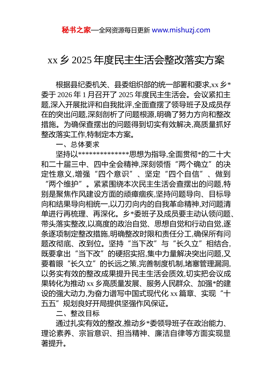 秘书之家—全网资源每日更新 www.mishuzj.comxx 乡 2025 年度民主生活会整改落实方案根据县纪委机关、县委组织部的统一部署和要求,xx 乡*委于 2026 年 1 月召开了 2025 年度民主生活会。会议紧扣主题,深入开展批评和自我批评,全面查摆了领导班子及成员存在的突出问题,深刻剖析了问题根源,明确了努力方向和整改措施。为确保查摆出的问题得到切实有效解决,高质量抓好整改落实工作,特制定本方案。一、总体要求坚持以**************思想为指导,全面贯彻*的二十大和二十届三中、四中全会精神,深刻领悟“两个确立”的决定性意义,增强“四个意识”、坚定“四个自信”、做到“两个维护”。紧紧围绕本次民主生活会查摆出的问题,特别是聚焦作风建设方面的顽瘴痼疾,坚持问题导向、目标导向和结果导向相统一,以刀刃向内的自我革命精神,对问题清单进行再梳理、再深化。乡*委班子及成员要主动认领问题、带头落实整改,以高度的政治自觉、思想自觉和行动自觉,逐条逐项制定整改措施,明确整改时限和责任分工,确保所有问题改彻底、改到位。坚持“当下改”与“长久立”相结合,既要拿出“当下改”的硬招实招,集中力量解决突出问题,又要着眼“长久立”的长远之策,完善制度机制,堵塞管理漏洞,以务实有效的整改成果提升民主生活会质效,切实把会议成果转化为推动 xx 乡高质量发展、服务人民群众、加强*的建设的强大动力,为奋力谱写中国式现代化 xx 篇章、实现“十五五”规划良好开局提供坚强作风保证。二、整改目标通过扎实有效的整改,推动乡*委领导班子在政治能力、理论素养、宗旨意识、担当精神、廉洁自律等方面实现显著提升。秘书之家—全网资源每日更新 www.mishuzj.com——政治站位进一步提高。班子成员的政治判断力、政治领悟力、政治执行力持续增强,贯彻落实*中央决策部署和上级*委工作要求的自觉性、坚定性更加牢固。——理论武装进一步深化。运用***新***********思想指导实践、破解难题的能力显著增强,学思用贯通、知信行统一的水平迈上新台阶。——宗旨意识进一步牢固。密切联系群众的制度机制更加完善,解决群众急难愁盼问题的能力和效率有效提升,*群干群关系更加融洽。——担当作为精神进一步激发。干事创业的精气神更加饱满,攻坚克难的斗争精神更加顽强,推动高质量发展的思路更宽、举措更实,发展成效更加彰显。——作风建设进一步夯实。形式主义、官僚主义等突出问题得到有力整治,中央八项规定及其实施细则精神在全乡落地生根,风清气正的政治生态持续巩固。——管*治*责任进一步压实。全面从严治*体系更加健全,班子成员履行“一岗双责”的政治自觉和行动自觉全面增强,为全乡各项事业发展提供坚强纪律保障。三、存在问题、整改措施、责任分工及整改时限(一)在带头强化政治忠诚、提高政治能力方面存在问题:一是政治理论学习与地方发展实践结合不够紧密。班子在组织理论学习时,对中央、省、市关于高质量发展的宏观政策解读较多,但在如何将其精准转化为符合 xx乡实际、具有可操作性的发展战略和具体项目方面,思考谋划的深度和广度尚显不足。例如,在学习领会中央关于发展新质生产力的论述时,如何结合我乡的农业基础和生态资源,培育具有地方特色的新产业新业态,缺乏系统性的研究和前瞻性的布局。二是政治执行的穿透力有待加强。在执行上级决策部署时,有时存在“中转站”现象,满足于开会传达、发文部署,但在后续的跟踪问效、督促检查环节抓得不够紧、不够实,导致一些好的政策在“最后一公里”落实效果打了秘书之家—全网资源每日更新 www.mishuzj.com折扣。比如,在推进巩固拓展脱贫攻坚成果同乡村振兴有效衔接工作中,对部分产业项目的长期效益和风险评估跟踪不及时,存在一定的路径依赖,创新突破力度不足。三是政治风险防范意识仍需强化。对意识形态领域的复杂性认识不足,对网络舆情、社会思潮等潜在风险的分析研判和应对处置能力有待提升。在面对一些涉及群众切身利益的敏感问题时,未能做到第一时间发声引导、有效化解,存在一定的被动应对情况。整改措施:1.深化理论武装,提升转化运用能力。坚持并优化*委理论学习中心组“第一议题”制度,每次学习至少安排一名班子成员结合分管领域工...