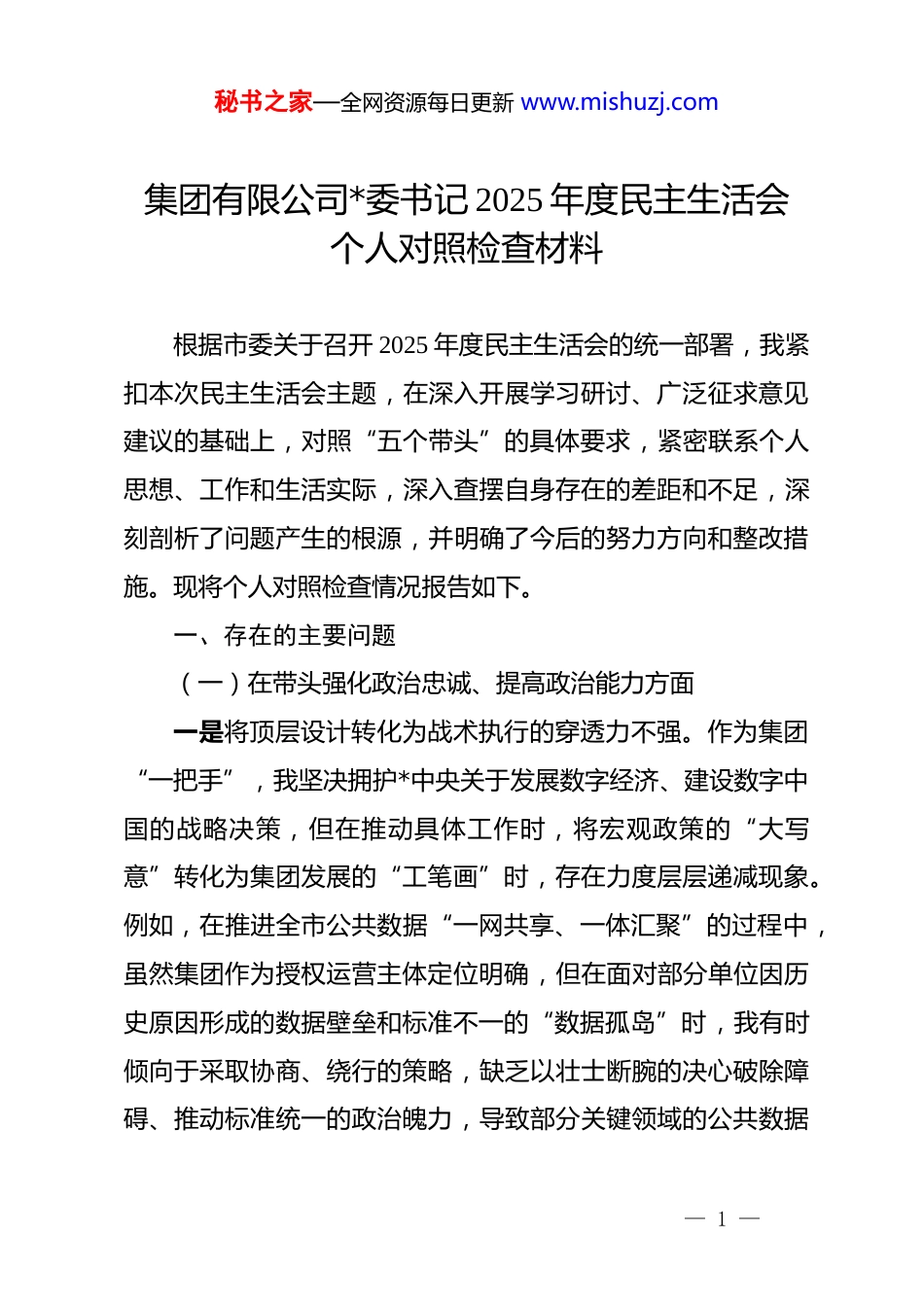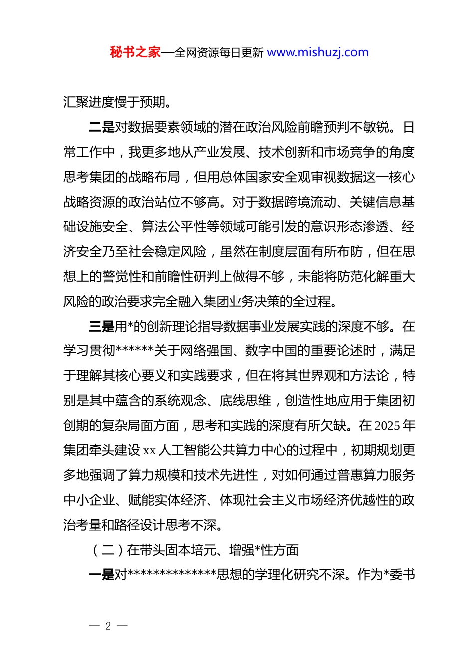 秘书之家—全网资源每日更新 www.mishuzj.com集团有限公司*委书记 2025 年度民主生活会个人对照检查材料根据市委关于召开 2025 年度民主生活会的统一部署,我紧扣本次民主生活会主题,在深入开展学习研讨、广泛征求意见建议的基础上,对照“五个带头”的具体要求,紧密联系个人思想、工作和生活实际,深入查摆自身存在的差距和不足,深刻剖析了问题产生的根源,并明确了今后的努力方向和整改措施。现将个人对照检查情况报告如下。一、存在的主要问题(一)在带头强化政治忠诚、提高政治能力方面一是将顶层设计转化为战术执行的穿透力不强。作为集团“一把手”,我坚决拥护*中央关于发展数字经济、建设数字中国的战略决策,但在推动具体工作时,将宏观政策的“大写意”转化为集团发展的“工笔画”时,存在力度层层递减现象。例如,在推进全市公共数据“一网共享、一体汇聚”的过程中,虽然集团作为授权运营主体定位明确,但在面对部分单位因历史原因形成的数据壁垒和标准不一的“数据孤岛”时,我有时倾向于采取协商、绕行的策略,缺乏以壮士断腕的决心破除障碍、推动标准统一的政治魄力,导致部分关键领域的公共数据— 1 —秘书之家—全网资源每日更新 www.mishuzj.com汇聚进度慢于预期。二是对数据要素领域的潜在政治风险前瞻预判不敏锐。日常工作中,我更多地从产业发展、技术创新和市场竞争的角度思考集团的战略布局,但用总体国家安全观审视数据这一核心战略资源的政治站位不够高。对于数据跨境流动、关键信息基础设施安全、算法公平性等领域可能引发的意识形态渗透、经济安全乃至社会稳定风险,虽然在制度层面有所布防,但在思想上的警觉性和前瞻性研判上做得不够,未能将防范化解重大风险的政治要求完全融入集团业务决策的全过程。三是用*的创新理论指导数据事业发展实践的深度不够。在学习贯彻******关于网络强国、数字中国的重要论述时,满足于理解其核心要义和实践要求,但在将其世界观和方法论,特别是其中蕴含的系统观念、底线思维,创造性地应用于集团初创期的复杂局面方面,思考和实践的深度有所欠缺。在 2025 年集团牵头建设 xx 人工智能公共算力中心的过程中,初期规划更多地强调了算力规模和技术先进性,对如何通过普惠算力服务中小企业、赋能实体经济、体现社会主义市场经济优越性的政治考量和路径设计思考不深。(二)在带头固本培元、增强*性方面一是对**************思想的学理化研究不深。作为*委书— 2 —秘书之家—全网资源每日更新 www.mishuzj.com记,我能够坚持带头学习、先学一步,但学习方式上偏重于领会结论、掌握要求,满足于“知其然”,但在“知其所以然”上下的功夫不够。特别是对其中蕴含的马克思主义立场、观点、方法,缺乏系统性、学理化的深入研究和思考。导致在面对集团发展的新问题、新挑战时,偶尔会感觉理论储备不足,运用*的创新理论解决复杂问题的能力有待进一步提升,理论学习成果向坚定理想信念、锤炼坚强*性的转化效果不明显。二是在应对初创期挑战时自我革命精神有所钝化。集团成立至今,取得了一些从“0 到 1”的突破,面对成绩,内心深处有时会滋生一丝自满情绪和“松口气”的想法,艰苦奋斗、迎难而上的劲头相比创业初期有所减弱。尤其是在集团业务模式初步得到市场验证后,对于一些颠覆性的技术路线和商业模式,内心存有“求稳”心态,担心试错成本过高影响当前发展势头,缺乏彻底的自我革命精神去拥抱不确定性,刀刃向内、检视自身的勇气和锐气有所消减。三是在业务决策中锤炼*性的自觉性不强。在集团高速发展的态势下,我大部分精力投入到战略规划、市场开拓和技术创新等具体业务中,有时不自觉地将*性修养与业务工作割裂开来。在主持召开一些重要业务决策会议时,议题多集中于技术可行性、投入产出比等经济和技术指标,未能自觉地将每一个重大— 3 —秘书之家—全网资源每日更新 www.mishuzj.com项目都作为检验和锤炼自身*性立场、宗旨意识和价值追求的“试金石”,导致部分决策未能充分体现*性原则的最高要求。(三)在带头敬畏人民、敬畏组织、敬畏法纪方面一是数据产品研发“以人民为中心”的导向树...