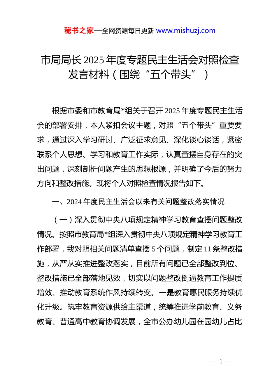 秘书之家—全网资源每日更新 www.mishuzj.com市局局长 2025 年度专题民主生活会对照检查发言材料(围绕“五个带头”)根据市委和市教育局*组关于召开 2025 年度专题民主生活会的部署安排,本人紧扣会议主题,对照“五个带头”重要要求,通过深入学习研讨、广泛征求意见、深化谈心谈话,紧密联系个人思想、学习和教育工作实际,认真查摆自身存在的突出问题,深刻剖析问题产生的思想根源,并明确了今后的努力方向和整改措施。现将个人对照检查情况报告如下。一、2024 年度民主生活会以来有关问题整改落实情况(一)深入贯彻中央八项规定精神学习教育查摆问题整改情况。按照市教育局*组深入贯彻中央八项规定精神学习教育工作部署,我对照相关问题清单查摆 5 个问题,制定 11 条整改措施,从严从实推进整改落实,目前所有问题已全部整改到位、整改措施已全部落地见效,切实以问题整改倒逼教育工作提质增效、推动教育系统作风持续转变。一是教育惠民服务持续优化升级。筑牢教育资源供给主渠道,统筹推进学前教育、义务教育、普通高中教育协调发展,全市公办幼儿园在园幼儿占比— 1 —秘书之家—全网资源每日更新 www.mishuzj.com达 58.6%,义务教育阶段适龄儿童入学率保持 100%,高中阶段教育毛入学率达 94.2%。搭建优质教育资源共享平台,深化*市与周边城市教育协作,推动 12 所优质学校与*市乡村学校建立结对帮扶关系,带动乡村学校教育教学质量提升,受益学生达1.2 万余人。完善教育惠民服务体系,推进教育收费规范、课后服务提质、学生资助精准等工作,全系统全年落实各类学生资助资金 8600 余万元,惠及学生 7.3 万余人;课后服务覆盖率达100%,家长满意度达 92.5%。二是教育综合改革不断向纵深推进。推进义务教育优质均衡发展改革,新增 6 所义务教育优质均衡发展示范校,优质均衡覆盖全市 8 个县(区)的 42 所学校。深化教育评价改革,完善学生综合素质评价体系,规范中小学办学行为,减轻学生过重作业负担和校外培训负担,关停不合规校外培训机构 38 家,培育规范化校外培训机构 56 家。加强教师队伍建设改革,完善教师招聘、培养、激励机制,全年招聘各类教师 890 名,开展教师培训 28 场次,培训教师 1.1 万余人次,全系统教师队伍整体素质持续提升。三是重点教育项目建设取得显著成效。成立教育项目建设专班,全系统谋划储备重点教育项目 35 个,总投资 32.8 亿元,19 个项目已启动实施,其中 8 个项目已顺利竣工并投入使用。重点推进*市职业教育园区建设、农村学校标准化改造等项目,完成 15 所农村学校教学— 2 —秘书之家—全网资源每日更新 www.mishuzj.com楼、宿舍楼改造工程,新增学位 2100 个;职业教育园区一期工程顺利完工,新增职业教育学位 3000 个,成功引进 2 个职业教育合作项目,率先完成年度教育项目建设和招商引资相关任务,获市委主要领导表扬。(二)2024 年度民主生活会查摆问题整改情况。针对 2024年度民主生活会查摆出的严守政治纪律和政治规矩等四个方面12 条突出问题,本人高度重视,制定了详细的个人整改清单,实行台账管理、动态销号。一年来,本人坚持以**************思想为指导,持续深入学习贯彻*的二十大及二十届三中、四中全会精神和*章*规 dj,不断增进对*的创新理论的政治认同、思想认同、理论认同、情感认同。坚持问题导向,将整改落实与分管教育工作深度融合,逐项推动整改见底见效。目前,所列问题均已按期完成整改或取得阶段性成效,具体体现为。一是理论学习的主动性和系统性显著增强,运用*的立场观点方法分析和解决教育领域实际问题的能力得到提升。二是政治判断力、政治领悟力、政治执行力进一步提高,在思想上政治上行动上同以***同志为核心的*中央保持高度一致的自觉性更加坚定,始终坚持*对教育工作的全面领导。三是宗旨意识进一步树牢,深入基层学校、师生群众的频次和实效有所增加,解决师— 3 —秘书之家—全网资源每日更新 www.mishuzj.com生急难愁盼问题的能力得到提升。四是担当精神和实干作风得到锤炼,推动分管领域教育工作取得新进展,如教育数字...