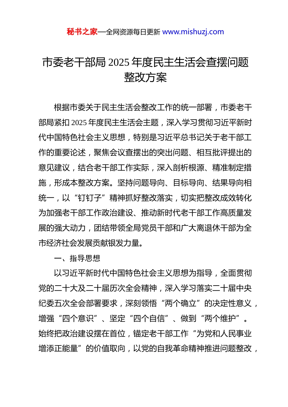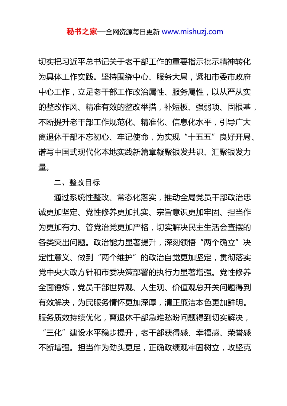 秘书之家—全网资源每日更新 www.mishuzj.com市委老干部局 2025 年度民主生活会查摆问题整改方案 根据市委关于民主生活会整改工作的统一部署,市委老干部局紧扣 2025 年度民主生活会主题,深入学习贯彻习近平新时代中国特色社会主义思想,特别是习近平总书记关于老干部工作的重要论述,聚焦会议查摆出的突出问题、相互批评提出的意见建议,结合老干部工作实际,深入剖析根源、精准制定措施,形成本整改方案。坚持问题导向、目标导向、结果导向相统一,以“钉钉子”精神抓好整改落实,切实把整改成效转化为加强老干部工作政治建设、推动新时代老干部工作高质量发展的强大动力,团结带领全局党员干部和广大离退休干部为全市经济社会发展贡献银发力量。一、指导思想以习近平新时代中国特色社会主义思想为指导,全面贯彻党的二十大及二十届历次全会精神,深入学习落实二十届中央纪委五次全会部署要求,深刻领悟“两个确立”的决定性意义,增强“四个意识”、坚定“四个自信”、做到“两个维护”。始终把政治建设摆在首位,锚定老干部工作“为党和人民事业增添正能量”的价值取向,以党的自我革命精神推进问题整改,秘书之家—全网资源每日更新 www.mishuzj.com切实把习近平总书记关于老干部工作的重要指示批示精神转化为具体工作实践。坚持围绕中心、服务大局,紧扣市委市政府中心工作,立足老干部工作政治属性、服务属性,以从严从实的整改作风、精准有效的整改举措,补短板、强弱项、固根基,不断提升老干部工作规范化、精准化、信息化水平,引导广大离退休干部不忘初心、牢记使命,为实现“十五五”良好开局、谱写中国式现代化本地实践新篇章凝聚银发共识、汇聚银发力量。二、整改目标通过系统性整改、常态化落实,推动全局党员干部政治忠诚更加坚定、党性修养更加扎实、宗旨意识更加牢固、担当作为更加有力、管党治党更加严格,切实解决民主生活会查摆的各类突出问题。政治能力显著提升,深刻领悟“两个确立”决定性意义、做到“两个维护”的政治自觉更加坚定,贯彻落实党中央大政方针和市委决策部署的执行力显著增强。党性修养全面锤炼,党员干部世界观、人生观、价值观总开关问题得到有效解决,为民服务情怀更加深厚,清正廉洁本色更加鲜明。服务质效持续优化,离退休干部急难愁盼问题得到切实解决,“三化”建设水平稳步提升,老干部获得感、幸福感、荣誉感不断增强。担当作为劲头更足,正确政绩观牢固树立,攻坚克秘书之家—全网资源每日更新 www.mishuzj.com难、改革创新能力显著提高,老干部工作高质量发展态势更加明显。管党治党责任压实落细,全面从严治党向纵深推进,风清气正的政治生态持续巩固,以整改实效彰显新时代老干部工作部门的新担当新作为。三、整改措施(一)铸牢政治忠诚之魂,提升政治履职能力1.深化理论武装强根基。坚持把学懂弄通做实习近平新时代中国特色社会主义思想作为首要政治任务,完善并严格执行“第一议题”制度,每月开展 1 次市委老干部局理论学习中心组集中学习,每季度组织 1 次专题研讨,全年累计开展集中学习不少于 12 次、专题研讨不少于 4 次,带头深刻领悟“两个确立”的决定性意义。牵头制定离退休干部政治理论学习计划,创新采取“理论辅导+政策解读+现场教学+线上引学”模式,组织离退休干部党支部书记示范培训班 2 期、市管退休干部理论学习班 1 期,覆盖离退休干部党员 300 余人次,引导全局干部职工和广大老干部始终同以习近平同志为核心的党中央保持高度一致。将习近平总书记关于老干部工作的重要论述纳入干部教育培训核心内容,每年开展专题培训不少于 3 次,推动理论学习与工作实践深度融合,切实把学习成果转化为履职尽责的实际成效。秘书之家—全网资源每日更新 www.mishuzj.com2.严守政治纪律筑防线。带头执行党的政治纪律和政治规矩,建立健全政治纪律执行情况定期检视机制,每半年牵头开展 1 次全局政治纪律和政治规矩执行情况自查自纠,重点排查贯彻落实党中央关于老干部工作决策部署中的偏差问题,建立问题清单、整改清单、责任清单,确保整改闭环。严格执行重大事项请示报告制度,凡涉及老...