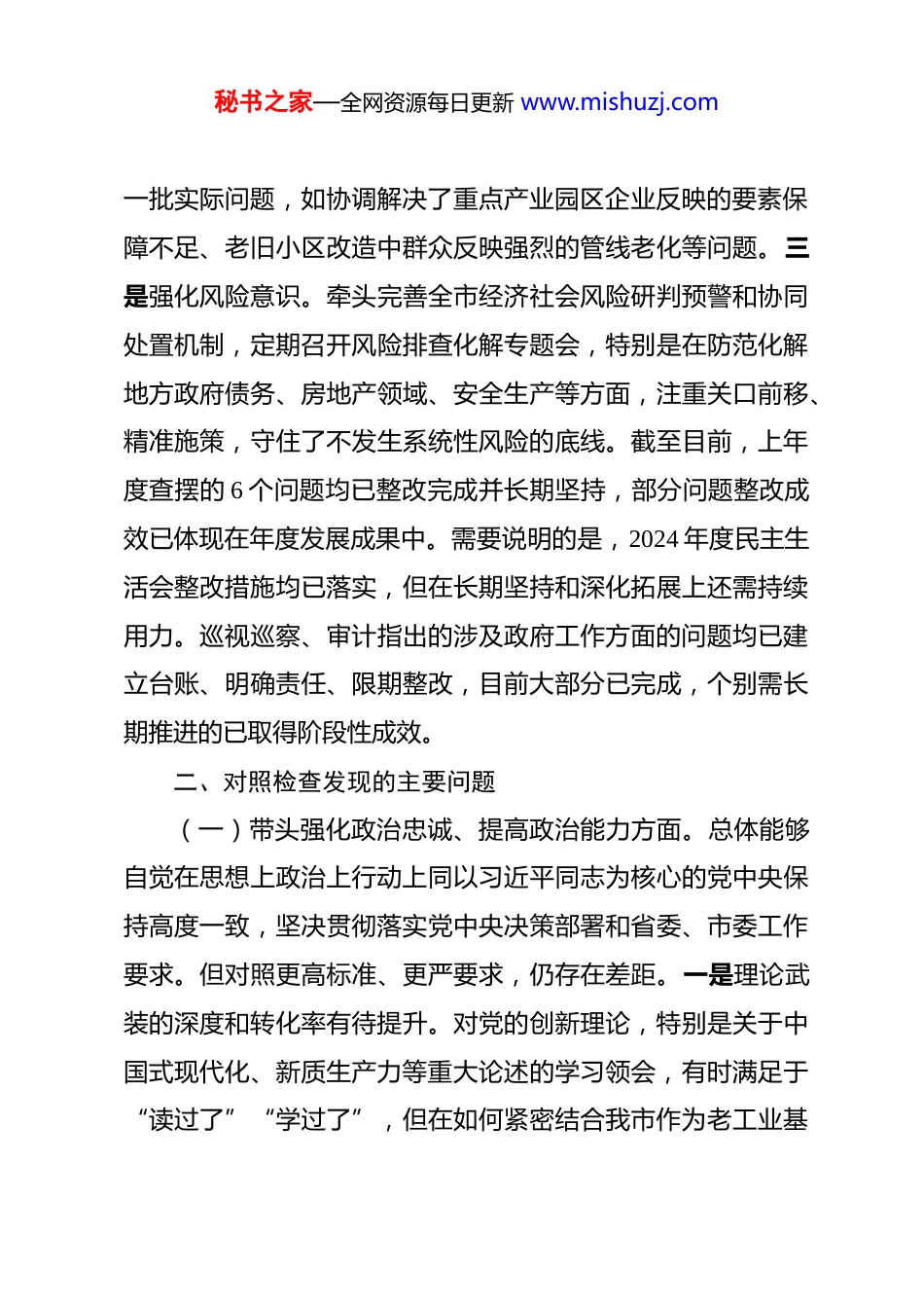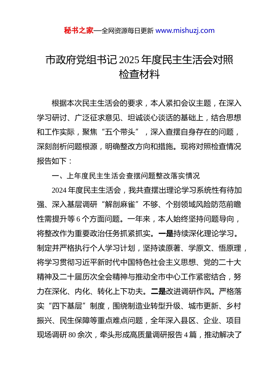 秘书之家—全网资源每日更新 www.mishuzj.com市政府党组书记 2025 年度民主生活会对照检查材料 根据本次民主生活会的要求,本人紧扣会议主题,在深入学习研讨、广泛征求意见、坦诚谈心谈话的基础上,结合思想和工作实际,聚焦“五个带头”,深入查摆自身存在的问题,深刻剖析问题根源,明确整改方向和措施。现将对照检查情况报告如下:一、上年度民主生活会查摆问题整改落实情况2024 年度民主生活会,我共查摆出理论学习系统性有待加强、深入基层调研“解剖麻雀”不够、个别领域风险防范前瞻性需提升等 6 个方面问题。一年来,本人始终坚持问题导向,将整改作为重要政治任务抓紧抓实。一是持续深化理论学习。制定并严格执行个人学习计划,坚持读原著、学原文、悟原理,将学习贯彻习近平新时代中国特色社会主义思想、党的二十大精神及二十届历次全会精神与推动全市中心工作紧密结合,努力在深化、内化、转化上下功夫。二是改进调研作风。严格落实“四下基层”制度,围绕制造业转型升级、城市更新、乡村振兴、民生保障等重点难点问题,全年深入县区、企业、项目现场调研 80 余次,牵头形成高质量调研报告 4 篇,推动解决了秘书之家—全网资源每日更新 www.mishuzj.com一批实际问题,如协调解决了重点产业园区企业反映的要素保障不足、老旧小区改造中群众反映强烈的管线老化等问题。三是强化风险意识。牵头完善全市经济社会风险研判预警和协同处置机制,定期召开风险排查化解专题会,特别是在防范化解地方政府债务、房地产领域、安全生产等方面,注重关口前移、精准施策,守住了不发生系统性风险的底线。截至目前,上年度查摆的 6 个问题均已整改完成并长期坚持,部分问题整改成效已体现在年度发展成果中。需要说明的是,2024 年度民主生活会整改措施均已落实,但在长期坚持和深化拓展上还需持续用力。巡视巡察、审计指出的涉及政府工作方面的问题均已建立台账、明确责任、限期整改,目前大部分已完成,个别需长期推进的已取得阶段性成效。二、对照检查发现的主要问题(一)带头强化政治忠诚、提高政治能力方面。总体能够自觉在思想上政治上行动上同以习近平同志为核心的党中央保持高度一致,坚决贯彻落实党中央决策部署和省委、市委工作要求。但对照更高标准、更严要求,仍存在差距。一是理论武装的深度和转化率有待提升。对党的创新理论,特别是关于中国式现代化、新质生产力等重大论述的学习领会,有时满足于“读过了”“学过了”,但在如何紧密结合我市作为老工业基秘书之家—全网资源每日更新 www.mishuzj.com地、资源型城市转型、区域中心城市等的实际,创造性地转化为具体发展思路、政策举措和工作抓手方面,思考谋划的前瞻性和穿透力还不够强。比如,在贯彻落实国家推动大规模设备更新和消费品以旧换新政策时,初期主要考虑的是执行层面的补贴发放、流程简化,对于如何借此机会系统性推动我市传统产业技术升级、催生绿色消费新业态的整体性战略谋划相对滞后,反映出从政治高度把握政策机遇、服务全局的能力还需增强。二是政治判断力、领悟力、执行力的均衡性有待加强。对“国之大者”的理解和把握总体是清醒的,但在面对复杂严峻的经济形势和艰巨繁重的发展任务时,有时过于聚焦经济指标和项目进度,对决策部署背后深层次的政治考量、战略意图领会不够及时透彻,导致在统筹发展和安全、当前和长远、显绩和潜绩时,政治站位的高度和系统性偶有不足。例如,在推进生态环境保护修复、历史文化遗产保护等工作时,虽然态度坚决、行动积极,但在平衡短期发展压力和长期生态文化效益上,有时存在“等一等、看一看”的被动心态,攻坚克难的锐气和“算大账”的政治自觉还需提升。(二)带头固本培元、增强党性方面。能够自觉加强党性锻炼,坚定理想信念,但对照党章党规党纪,对照先辈先进,感到自我革命的精神和标准还需进一步抬高。一是理想信念内秘书之家—全网资源每日更新 www.mishuzj.com化于心、外化于行的“融合剂”作用发挥不够充分。虽然能够坚守共产党人精神追求,但在面对社会思潮多元多样、意识形态领域斗争复杂的情况下,有时对分管领域、身边同志的思...