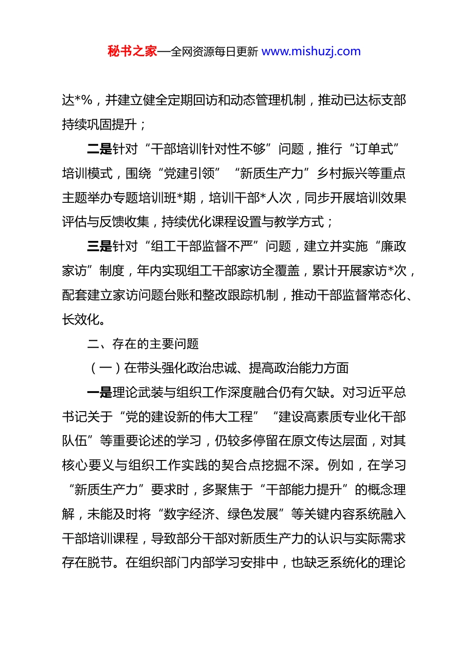 秘书之家—全网资源每日更新 www.mishuzj.com县委常委、组织部部长年度民主生活会“五个带头”个人对照检查材料 根据中央和省委、市委、县委关于认真开好年度民主生活会的统一部署和要求,本人紧紧围绕“学思想、强党性、重实践、建新功”主题,严格对照“五个带头”(带头强化政治忠诚、带头固本培元、带头敬畏人民组织法纪、带头干事创业、带头扛起管党治党责任)标准,结合县委常委、组织部部长岗位职责,通过深化学习研讨、广泛征求意见(累计征求基层党员、干部意见建议*条,梳理形成*个方面*项具体问题)、深入开展谈心谈话(与班子成员、组工干部、基层支部书记等谈话*人次),并对照党的理论和路线方针政策、党章党规党纪、初心使命,联系个人思想、学习和工作实际,现作如下对照检查。一、上年度民主生活会整改措施落实情况上年度民主生活会查摆出的“*个方面*项问题”(基层党建薄弱、干部培训针对性不够、组工干部监督不严),已全面完成整改*项,其余*项属需长期坚持事项,目前均已取得阶段性进展。具体整改情况如下:一是针对“基层党建薄弱”问题,组织开展了“支部标准化建设年”活动,全年完成*个村(社区)支部达标验收,占比秘书之家—全网资源每日更新 www.mishuzj.com达*%,并建立健全定期回访和动态管理机制,推动已达标支部持续巩固提升;二是针对“干部培训针对性不够”问题,推行“订单式”培训模式,围绕“党建引领”“新质生产力”乡村振兴等重点主题举办专题培训班*期,培训干部*人次,同步开展培训效果评估与反馈收集,持续优化课程设置与教学方式;三是针对“组工干部监督不严”问题,建立并实施“廉政家访”制度,年内实现组工干部家访全覆盖,累计开展家访*次,配套建立家访问题台账和整改跟踪机制,推动干部监督常态化、长效化。二、存在的主要问题(一)在带头强化政治忠诚、提高政治能力方面一是理论武装与组织工作深度融合仍有欠缺。对习近平总书记关于“党的建设新的伟大工程”“建设高素质专业化干部队伍”等重要论述的学习,仍较多停留在原文传达层面,对其核心要义与组织工作实践的契合点挖掘不深。例如,在学习“新质生产力”要求时,多聚焦于“干部能力提升”的概念理解,未能及时将“数字经济、绿色发展”等关键内容系统融入干部培训课程,导致部分干部对新质生产力的认识与实际需求存在脱节。在组织部门内部学习安排中,也缺乏系统化的理论秘书之家—全网资源每日更新 www.mishuzj.com联系实际研讨环节,影响学习成果的有效转化。二是政治执行力与基层实际衔接不够紧密。在贯彻落实上级关于“领导干部能上能下”决策部署过程中,虽及时制定出台《实施意见》,但对基层单位在“不担当不作为情形界定”“干部思想工作引导”等具体操作环节,缺乏常态化的跟踪指导。例如,某乡镇反映个别干部因考核排名靠后需调整岗位,但其家属情绪波动较大,虽进行了初步协调,却未持续做好跟踪疏导和心理干预,也缺乏岗位适配评估,导致该干部转任后工作积极性未能及时恢复,对干部队伍稳定产生一定影响。三是政治敏锐性与意识形态工作结合不够到位。对网络舆情中涉及的干部形象问题警惕性不高,未建立干部舆情动态监测机制。例如,某干部因“违规吃喝”问题被网络曝光后,虽第一时间依规处理,但未举一反三开展干部“八小时外”行为排查,缺乏对干部日常社交及网络言行的系统性监督,导致后续仍有个别干部因“酒驾”被通报,反映出对干部意识形态领域风险预判和防范机制存在短板。(二)在带头固本培元、增强党性方面一是党内政治生活“辣味”不足。在参加所在支部“三会一课”时,有时以工作指导代替思想交流,自我批评多谈工作不足、少挖思想根源;批评他人多提改进建议、少点具体问题。秘书之家—全网资源每日更新 www.mishuzj.com例如,在支部组织生活会上,对某同志存在的“工作推诿”现象,仅一般性指出“需加强协作”,未从党性意识层面深入剖析根源,未能真正触及思想本质,导致该同志后续仍存在应付了事的情况,未能达到帮助同志、增进团结的预期效果。二是宗旨意识与基层党员需求联系不够紧密。开展“四下基层”过程中,较多走访党建示...