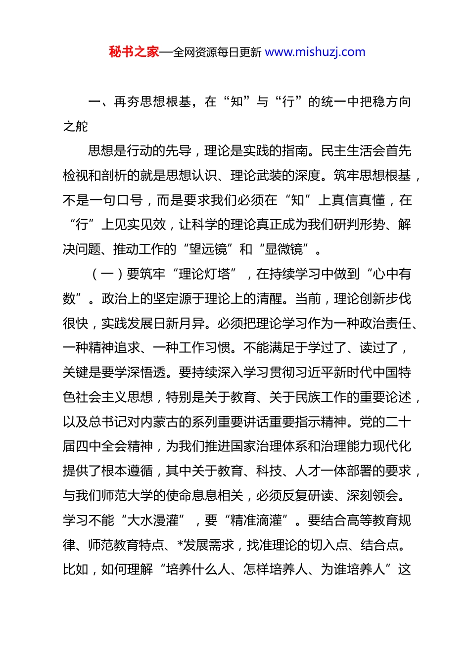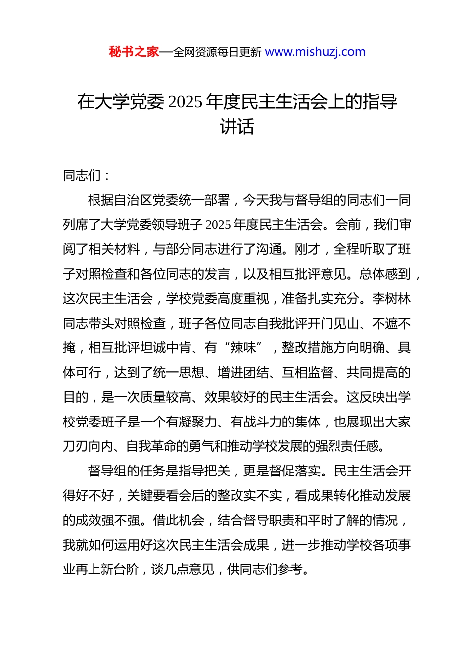 秘书之家—全网资源每日更新 www.mishuzj.com在大学党委 2025 年度民主生活会上的指导讲话 同志们:根据自治区党委统一部署,今天我与督导组的同志们一同列席了大学党委领导班子 2025 年度民主生活会。会前,我们审阅了相关材料,与部分同志进行了沟通。刚才,全程听取了班子对照检查和各位同志的发言,以及相互批评意见。总体感到,这次民主生活会,学校党委高度重视,准备扎实充分。李树林同志带头对照检查,班子各位同志自我批评开门见山、不遮不掩,相互批评坦诚中肯、有“辣味”,整改措施方向明确、具体可行,达到了统一思想、增进团结、互相监督、共同提高的目的,是一次质量较高、效果较好的民主生活会。这反映出学校党委班子是一个有凝聚力、有战斗力的集体,也展现出大家刀刃向内、自我革命的勇气和推动学校发展的强烈责任感。督导组的任务是指导把关,更是督促落实。民主生活会开得好不好,关键要看会后的整改实不实,看成果转化推动发展的成效强不强。借此机会,结合督导职责和平时了解的情况,我就如何运用好这次民主生活会成果,进一步推动学校各项事业再上新台阶,谈几点意见,供同志们参考。秘书之家—全网资源每日更新 www.mishuzj.com一、再夯思想根基,在“知”与“行”的统一中把稳方向之舵思想是行动的先导,理论是实践的指南。民主生活会首先检视和剖析的就是思想认识、理论武装的深度。筑牢思想根基,不是一句口号,而是要求我们必须在“知”上真信真懂,在“行”上见实见效,让科学的理论真正成为我们研判形势、解决问题、推动工作的“望远镜”和“显微镜”。(一)要筑牢“理论灯塔”,在持续学习中做到“心中有数”。政治上的坚定源于理论上的清醒。当前,理论创新步伐很快,实践发展日新月异。必须把理论学习作为一种政治责任、一种精神追求、一种工作习惯。不能满足于学过了、读过了,关键是要学深悟透。要持续深入学习贯彻习近平新时代中国特色社会主义思想,特别是关于教育、关于民族工作的重要论述,以及总书记对内蒙古的系列重要讲话重要指示精神。党的二十届四中全会精神,为我们推进国家治理体系和治理能力现代化提供了根本遵循,其中关于教育、科技、人才一体部署的要求,与我们师范大学的使命息息相关,必须反复研读、深刻领会。学习不能“大水漫灌”,要“精准滴灌”。要结合高等教育规律、师范教育特点、*发展需求,找准理论的切入点、结合点。比如,如何理解“培养什么人、怎样培养人、为谁培养人”这秘书之家—全网资源每日更新 www.mishuzj.com个根本问题在我们民族地区师范大学的具体体现?如何在教育教学全过程贯彻“铸牢中华民族共同体意识”这条主线?对这些问题的理论思考深度,直接决定了我们办学治校的实践高度。要把学习成果转化为清晰的办学思路、具体的工作举措,真正做到“知其然更知其所以然”,让理论的灯塔照亮我们前行的每一步。(二)要勤拂“思想尘埃”,在检视整改中做到“心中有戒”。民主生活会查摆问题,就像一次定期的“政治体检”。查摆出的问题,无论是班子的还是个人的,都是我们需要重点清扫的“思想尘埃”。问题暴露出来不可怕,可怕的是视而不见、整改不力。这次会议查摆的问题,有的涉及政治站位,有的涉及担当精神,有的涉及工作作风,都很具体、很中肯。整改落实,是民主生活会的“后半篇文章”,其重要性不亚于会议本身。必须坚决杜绝“闯关”心态,不能认为会开完了就万事大吉。要建立翔实的问题清单、整改清单、责任清单,明确整改目标、整改时限、整改责任人。整改要像“钉钉子”,一锤接着一锤敲,直到钉实钉牢。比如,针对会议通报的“形式主义、官僚主义”的一些具体表现,整改就不能仅仅停留在口头表态或文件修订上,要深入到课堂、深入到教研室、深入到管理服务一线,看师生的感受是否真切改善了,看办事流程是秘书之家—全网资源每日更新 www.mishuzj.com否真正优化了。要把整改过程作为一次深刻的党性锻炼和思想洗礼,时常反躬自省,看看“尘埃”是否反弹,让“心中有戒”的标尺时刻清晰。(三)要校准“行动坐标”,在对标对表中做到“心中有责”。学习理论、整改问题,最终要落到...