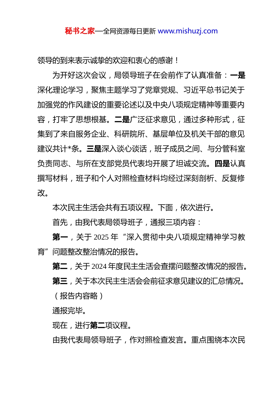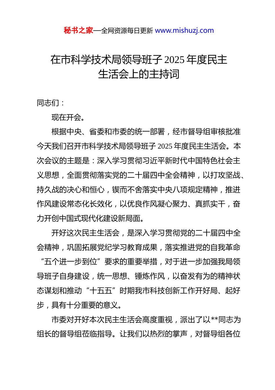 秘书之家—全网资源每日更新 www.mishuzj.com在市科学技术局领导班子 2025 年度民主生活会上的主持词 同志们:现在开会。根据中央、省委和市委的统一部署,经市督导组审核批准今天我们召开市科学技术局领导班子 2025 年度民主生活会。本次会议的主题是:深入学习贯彻习近平新时代中国特色社会主义思想,全面贯彻落实党的二十届四中全会精神,以打攻坚战、持久战的决心和恒心,锲而不舍落实中央八项规定精神,推进作风建设常态化长效化,以优良作风凝心聚力、真抓实干,奋力开创中国式现代化建设新局面。开好这次民主生活会,是深入学习贯彻党的二十届四中全会精神,巩固拓展党纪学习教育成果,落实推进党的自我革命“五个进一步到位”要求的重要举措,对于进一步加强我局领导班子自身建设,统一思想、锤炼作风,以奋发有为的精神状态谋划和推动“十五五”时期我市科技创新工作开好局、起好步,具有十分重要的意义。市委对开好本次民主生活会高度重视,派出了以**同志为组长的督导组莅临指导。让我们以热烈的掌声,对督导组各位秘书之家—全网资源每日更新 www.mishuzj.com领导的到来表示诚挚的欢迎和衷心的感谢!为开好这次会议,局领导班子在会前作了认真准备:一是深化理论学习,聚焦主题学习了党章党规、习近平总书记关于加强党的作风建设的重要论述以及中央八项规定精神等重要内容,打牢了思想根基。二是广泛征求意见,通过多种形式,征集到了来自服务企业、科研院所、基层单位及机关干部的意见建议共计*条。三是深入谈心谈话,班子成员之间、与分管科室负责同志、与所在支部党员代表均开展了坦诚交流。四是认真撰写材料,班子和个人对照检查材料均经过深刻剖析、反复修改。本次民主生活会共有五项议程。下面,依次进行。首先,由我代表局领导班子,通报三项内容:第一,关于 2025 年“深入贯彻中央八项规定精神学习教育”问题整改整治情况的报告。第二,关于 2024 年度民主生活会查摆问题整改情况的报告。第三,关于本次民主生活会会前征求意见建议的汇总情况。(报告内容略)通报完毕。现在,进行第二项议程。由我代表局领导班子,作对照检查发言。重点围绕本次民秘书之家—全网资源每日更新 www.mishuzj.com主生活会主题,对照中央要求的方面,结合科技管理工作实际,深入查摆在政治忠诚、党性修养、群众立场、担当作为、管党治党等方面存在的突出问题,特别是对照中央八项规定及其实施细则精神,查摆作风建设方面的问题;同时,结合巡察、审计、督查反馈以及科技创新领域典型案例进行剖析。(检视剖析内容略)领导班子对照检查发言到此结束。请各位班子成员对班子的检视剖析提出批评意见。(班子成员提出意见)感谢同志们的批评意见,我们照单全收,将在后续整改中逐一落实。现在,进行第三项议程:班子成员个人对照检查发言,并开展相互批评。习近平总书记在强调严肃党内政治生活时指出,“批评和自我批评是一剂良药”。我们要遵循“团结—批评—团结”的方针,以对党、对事业、对同志高度负责的态度,严肃认真地开展积极健康的思想斗争。自我批评要勇于揭短亮丑,相互批评要出于公心、实事求是,达到统一思想、增进团结、互相监督、共同提高的目的。下面,我先作个人对照检查发言。秘书之家—全网资源每日更新 www.mishuzj.com(个人对照检查内容略)我的发言完毕,恳请同志们对我提出批评意见。(其他班子成员提出批评意见)感谢同志们的批评,我将虚心接受,认真整改。接下来,请**同志发言,其他同志依次对其提出批评意见。(班子成员依次进行)刚才,领导班子和各位同志都进行了深刻的对照检查和坦诚的相互批评。下面,进行第四项议程:让我们以热烈的掌声,欢迎市委督导组组长**同志进行点评讲话。(督导组组长讲话内容略)感谢**组长全面、中肯、深刻的点评。督导组的指导意见,既肯定了本次民主生活会的成效,也精准指出了我们存在的问题和不足,更为我们抓好整改落实、加强班子建设指明了方向。我们完全认同、诚恳接受,并将不折不扣地贯彻落实到后续工作中。现在,由我代表局领导班子,就抓好整改落实、巩固会议成果,作如下表态发言:一、以绝对...