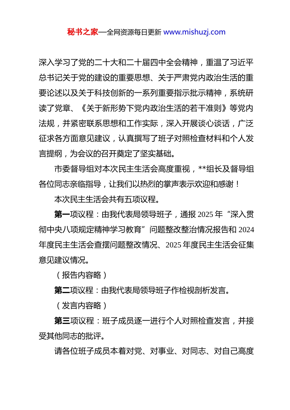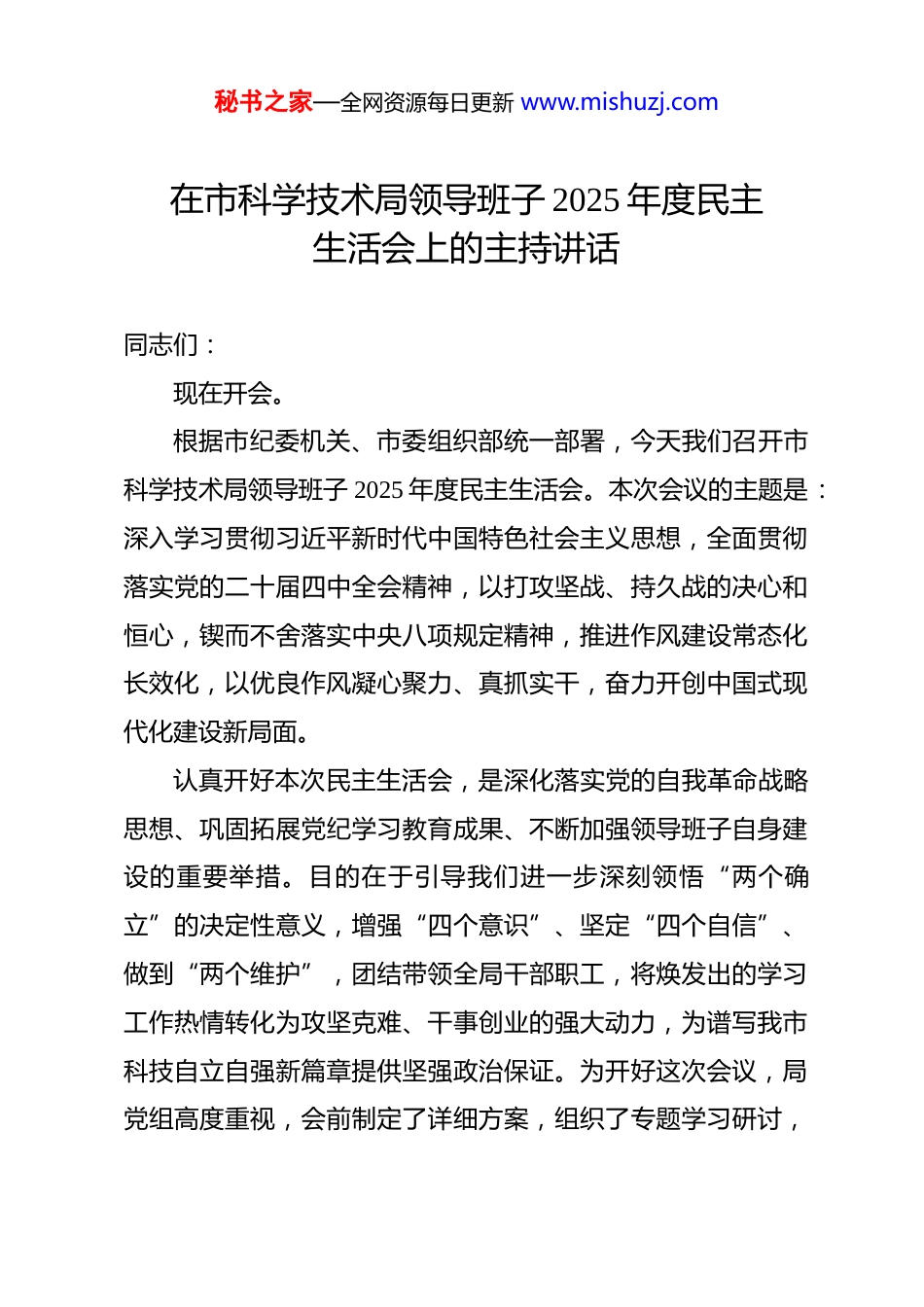 秘书之家—全网资源每日更新 www.mishuzj.com在市科学技术局领导班子 2025 年度民主生活会上的主持讲话 同志们:现在开会。根据市纪委机关、市委组织部统一部署,今天我们召开市科学技术局领导班子 2025 年度民主生活会。本次会议的主题是:深入学习贯彻习近平新时代中国特色社会主义思想,全面贯彻落实党的二十届四中全会精神,以打攻坚战、持久战的决心和恒心,锲而不舍落实中央八项规定精神,推进作风建设常态化长效化,以优良作风凝心聚力、真抓实干,奋力开创中国式现代化建设新局面。认真开好本次民主生活会,是深化落实党的自我革命战略思想、巩固拓展党纪学习教育成果、不断加强领导班子自身建设的重要举措。目的在于引导我们进一步深刻领悟“两个确立”的决定性意义,增强“四个意识”、坚定“四个自信”、做到“两个维护”,团结带领全局干部职工,将焕发出的学习工作热情转化为攻坚克难、干事创业的强大动力,为谱写我市科技自立自强新篇章提供坚强政治保证。为开好这次会议,局党组高度重视,会前制定了详细方案,组织了专题学习研讨,秘书之家—全网资源每日更新 www.mishuzj.com深入学习了党的二十大和二十届四中全会精神,重温了习近平总书记关于党的建设的重要思想、关于严肃党内政治生活的重要论述以及关于科技创新的一系列重要指示批示精神,系统研读了党章、《关于新形势下党内政治生活的若干准则》等党内法规,并紧密联系思想和工作实际,深入开展谈心谈话,广泛征求各方面意见建议,认真撰写了班子对照检查材料和个人发言提纲,为会议的召开奠定了坚实基础。市委督导组对本次民主生活会高度重视,**组长及督导组各位同志亲临指导,让我们以热烈的掌声表示欢迎和感谢!本次民主生活会共有五项议程。第一项议程:由我代表局领导班子,通报 2025 年“深入贯彻中央八项规定精神学习教育”问题整改整治情况报告和 2024年度民主生活会查摆问题整改情况、2025 年度民主生活会征集意见建议情况。(报告内容略)第二项议程:由我代表局领导班子作检视剖析发言。(发言内容略)第三项议程:班子成员逐一进行个人对照检查发言,并接受其他同志的批评。请各位班子成员本着对党、对事业、对同志、对自己高度秘书之家—全网资源每日更新 www.mishuzj.com负责的态度,严肃认真地开展批评和自我批评。自我批评要勇于解剖自己、揭短亮丑;相互批评要真点问题、点真问题,达到“团结—批评—团结”的目的。首先,从我开始作个人对照检查发言。(个人发言与相互批评环节略)第四项议程:请市委督导组组长**同志进行点评讲话。让我们以热烈的掌声欢迎**组长作指导讲话。(督导组组长讲话内容略)非常感谢**组长客观中肯的点评和精准有力的指导。督导组的讲话,既充分肯定了我们前期的准备工作,也一针见血地指出了存在的不足,并对下一步抓好整改落实、加强班子建设提出了明确要求,具有很强的政治性、指导性和针对性。我们一定要认真学习领会,并在后续工作中不折不扣地抓好贯彻落实。同志们,刚才,班子成员紧扣会议主题,对照党中央提出的重点方面,紧密联系全市科技创新工作实际和个人思想、工作、作风实际,进行了深刻的自我检查和党性分析,开展了严肃认真的批评和自我批评。大家的发言准备充分、思考深入,相互批评坦诚相见、开门见山,体现了对组织、对事业、对同志高度负责的精神,达到了统一思想、增进团结、改进工作的秘书之家—全网资源每日更新 www.mishuzj.com预期目的。特别是督导组**组长的点评讲话,为我们下一步工作指明了方向。下面,我代表局领导班子,就抓好本次民主生活会问题整改和下一步工作,作如下表态:一、持之以恒强化理论武装,在筑牢政治忠诚上达到新高度。我们将始终坚持把党的政治建设摆在首位,将学习贯彻习近平新时代中国特色社会主义思想和党的二十届四中全会精神作为首要政治任务。深刻领悟习近平总书记关于发展新质生产力、推动科技创新的战略擘画,确保科技工作的正确政治方向。严格落实“第一议题”制度,完善党组理论学习中心组学习机制,在深化、内化、转化上下更大功夫。习近平总书记指出,“要坚持用马克思主义中国化时...