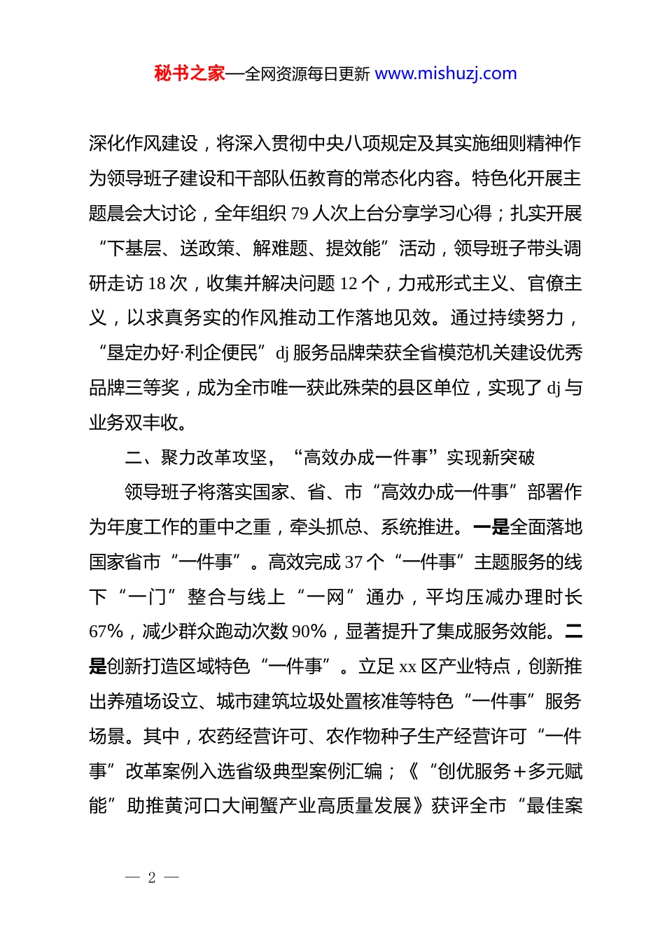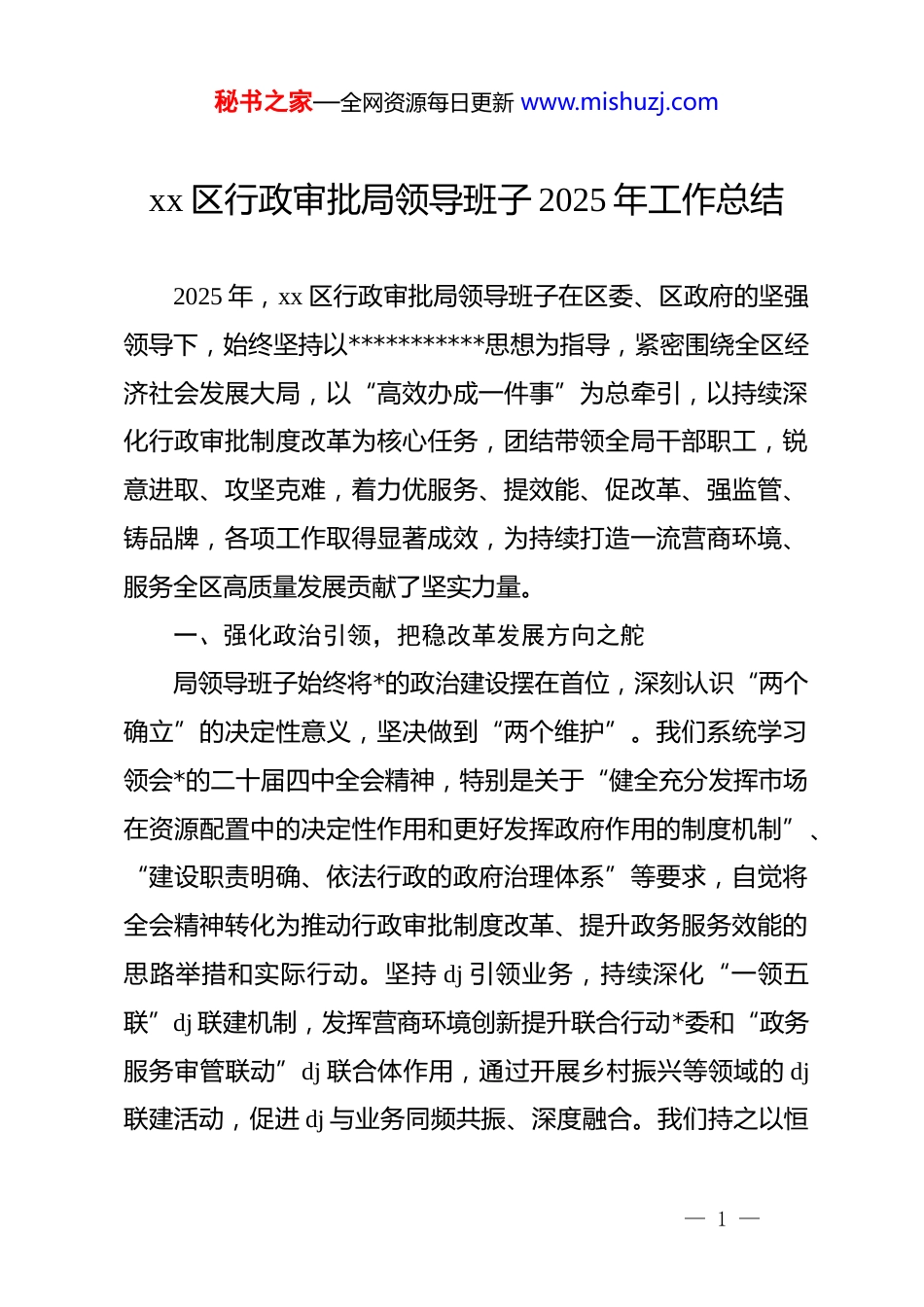 秘书之家—全网资源每日更新 www.mishuzj.comxx 区行政审批局领导班子 2025 年工作总结2025 年,xx 区行政审批局领导班子在区委、区政府的坚强领导下,始终坚持以***********思想为指导,紧密围绕全区经济社会发展大局,以“高效办成一件事”为总牵引,以持续深化行政审批制度改革为核心任务,团结带领全局干部职工,锐意进取、攻坚克难,着力优服务、提效能、促改革、强监管、铸品牌,各项工作取得显著成效,为持续打造一流营商环境、服务全区高质量发展贡献了坚实力量。一、强化政治引领,把稳改革发展方向之舵局领导班子始终将*的政治建设摆在首位,深刻认识“两个确立”的决定性意义,坚决做到“两个维护”。我们系统学习领会*的二十届四中全会精神,特别是关于“健全充分发挥市场在资源配置中的决定性作用和更好发挥政府作用的制度机制”、“建设职责明确、依法行政的政府治理体系”等要求,自觉将全会精神转化为推动行政审批制度改革、提升政务服务效能的思路举措和实际行动。坚持 dj 引领业务,持续深化“一领五联”dj 联建机制,发挥营商环境创新提升联合行动*委和“政务服务审管联动”dj 联合体作用,通过开展乡村振兴等领域的 dj联建活动,促进 dj 与业务同频共振、深度融合。我们持之以恒— 1 —秘书之家—全网资源每日更新 www.mishuzj.com深化作风建设,将深入贯彻中央八项规定及其实施细则精神作为领导班子建设和干部队伍教育的常态化内容。特色化开展主题晨会大讨论,全年组织 79 人次上台分享学习心得;扎实开展“下基层、送政策、解难题、提效能”活动,领导班子带头调研走访 18 次,收集并解决问题 12 个,力戒形式主义、官僚主义,以求真务实的作风推动工作落地见效。通过持续努力,“垦定办好·利企便民”dj 服务品牌荣获全省模范机关建设优秀品牌三等奖,成为全市唯一获此殊荣的县区单位,实现了 dj 与业务双丰收。二、聚力改革攻坚,“高效办成一件事”实现新突破领导班子将落实国家、省、市“高效办成一件事”部署作为年度工作的重中之重,牵头抓总、系统推进。一是全面落地国家省市“一件事”。高效完成 37 个“一件事”主题服务的线下“一门”整合与线上“一网”通办,平均压减办理时长67%,减少群众跑动次数 90%,显著提升了集成服务效能。二是创新打造区域特色“一件事”。立足 xx 区产业特点,创新推出养殖场设立、城市建筑垃圾处置核准等特色“一件事”服务场景。其中,农药经营许可、农作物种子生产经营许可“一件事”改革案例入选省级典型案例汇编;《“创优服务+多元赋能”助推黄河口大闸蟹产业高质量发展》获评全市“最佳案— 2 —秘书之家—全网资源每日更新 www.mishuzj.com例”;《“三位一体”优化营商环境赋能新能源产业高质量发展》经验被市委改革办刊发推广,彰显了改革的区域辨识度和实效性。三、聚焦标准规范,政务服务能力迈上新台阶领导班子深刻认识到标准化是提升服务质效的基础,全力推动政务服务标准化、规范化、便利化建设。一是健全标准化体系。组织编制涵盖业务流程、机制保障等 4 个方面的 438 件标准文件,为各项服务提供了清晰的操作规范和依据。2025 年12 月,政务服务标准化试点项目高标准通过省级验收,标志着标准化建设取得阶段性重大成果。二是提升线上服务能力。组织骨干力量对全区 37 个部门的 1615 项政务服务要素进行精准核查与网办能力测试,实现事项认领、清单编制、办事指南公开准确率“三个 100%”。建立问题“即查即改、跟踪复查”闭环机制,确保服务精准无误。三是拓展智慧服务模式。创新推出“云评审”“云管家”“视频办”“云导服”等“垦云办”智慧服务,打造“晶豆子带你看大厅”微视频品牌,发布 109期,点播超 160 万次,以生动形式解读政策、回应关切,打通了线上服务“最后一公里”。四、深化改革创新,重点领域审批释放新动能领导班子紧盯市场主体关切和项目建设需求,推动重点领— 3 —秘书之家—全网资源每日更新 www.mishuzj.com域改革走深走实。在企业开办领域,深化“6170”机制,推广住所标准化、企业迁移“一件事”改革,创新推出登记地...