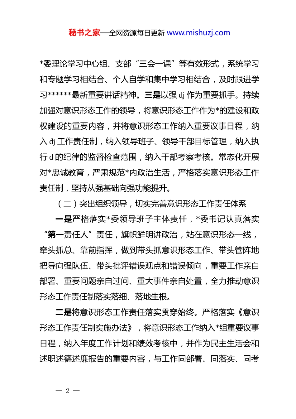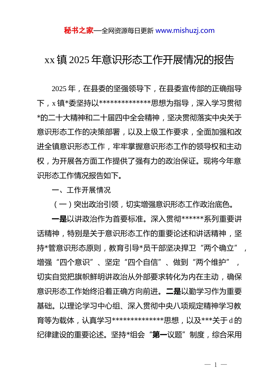 秘书之家—全网资源每日更新 www.mishuzj.comxx 镇 2025 年意识形态工作开展情况的报告2025 年,在县委的坚强领导下,在县委宣传部的正确指导下,x 镇*委坚持以**************思想为指导,深入学习贯彻*的二十大精神和二十届四中全会精神,坚决贯彻落实中央关于意识形态工作的决策部署,以及上级工作要求,全面加强和改进全镇意识形态工作,牢牢掌握意识形态工作的领导权和主动权,为开展各方面工作提供了强有力的政治保证。现将今年意识形态工作情况报告如下。一、工作开展情况(一)突出政治引领,切实增强意识形态工作政治底色。一是以讲政治作为首要标准。深入贯彻******系列重要讲话精神,特别是关于意识形态工作的重要论述和讲话精神,坚持*管意识形态原则,教育引导*员干部坚决捍卫“两个确立”,增强“四个意识”、坚定“四个自信”、做到“两个维护”,切实自觉把旗帜鲜明讲政治从外部要求转化为内在主动,确保意识形态工作始终沿着正确方向前进。二是以勤学习作为重要基础。以理论学习中心组、深入贯彻中央八项规定精神学习教育等为载体,认真学习**************思想,以及***关于 d 的纪律建设的重要论述。坚持*组会“第一议题”制度,综合采用— 1 —秘书之家—全网资源每日更新 www.mishuzj.com*委理论学习中心组、支部“三会一课”等有效形式,系统学习和专题学习相结合、个人自学和集中学习相结合,及时跟进学习******最新重要讲话精神。三是以强 dj 作为重要抓手。持续加强对意识形态工作的领导,将意识形态工作作为*的建设和政权建设的重要内容,并将意识形态工作纳入重要议事日程,纳入 dj 工作责任制,纳入领导班子、领导干部目标管理,纳入执行 d 的纪律的监督检查范围,纳入干部考察考核。常态化开展对*忠诚教育,严肃规范*内政治生活,严格落实意识形态工作责任制,坚持从强基础向强功能提升。(二)突出组织领导,切实完善意识形态工作责任体系一是严格落实*委领导班子主体责任,*委书记认真落实“第一责任人”责任,旗帜鲜明讲政治,站在意识形态一线,牵头抓总、靠前指挥,做到带头抓意识形态工作、带头管阵地把导向强队伍、带头批评错误观点和错误倾向,重要工作亲自部署、重要问题亲自过问、重大事件亲自处置,全力推动意识形态工作责任制落实落细、落地生根。二是将意识形态工作责任落实贯穿始终。严格落实《意识形态工作责任制实施办法》,将意识形态工作纳入*组重要议事日程,纳入年度工作计划和绩效考核中,并作为民主生活会和述职述德述廉报告的重要内容,与工作同部署、同落实、同考— 2 —秘书之家—全网资源每日更新 www.mishuzj.com核。三是严格落实审查制度绷紧安全之弦。严格执行信息发布审批程序,宣传工作由分管领导审批把关。始终坚持正确的政治导向,确保每一篇稿件经过分管领导审批,规范美篇、微信公众号等新媒体阵地信息发布审批程序。(四)突出管理实效,切实固牢意识形态工作阵地基础。一是积极稳固宣传阵地。抓好舆论宣传工作,不断提升正向舆论的传播力、引导力、影响力和公信力。积极在微信、抖音等宣传阵地做好正面宣传和引导,着力守好网络新媒体阵地。二是强化网络舆情管控。强化日常管理,全面落实工作机制,加强对抖音、微信等意识形态网络阵地的舆情监管,制定实时舆情监测制度,牢牢把握意识形态话语权,确保意识形态领域绝对安全。三是做实做细宣传工作。认真贯彻落实意识形态工作责任制,将宣传工作落实到日常工作,推动宣传工作落地落实。注重用好相关活动宣传宣讲,把宣传活动融入群众生活。(五)突出载体运用,切实强化学习效果,践行社会主义核心价值观。一是运用好各类学习平台。认真落实中心组学习《规则》和《实施办法》,制定 2025 年全年学习计划,将************— 3 —秘书之家—全网资源每日更新 www.mishuzj.com**思想作为学习的重中之重,认真贯彻落实中央八项规定精神及其实施细则。今年,共完成集中学习 17 次,交流研讨 6 次。用好网络学习平台,实现在职人员全覆盖,及时更新各支部*员学习人员,切实发挥平台作用。二是积极践行社会主义核心价值观,把社会主义核心...