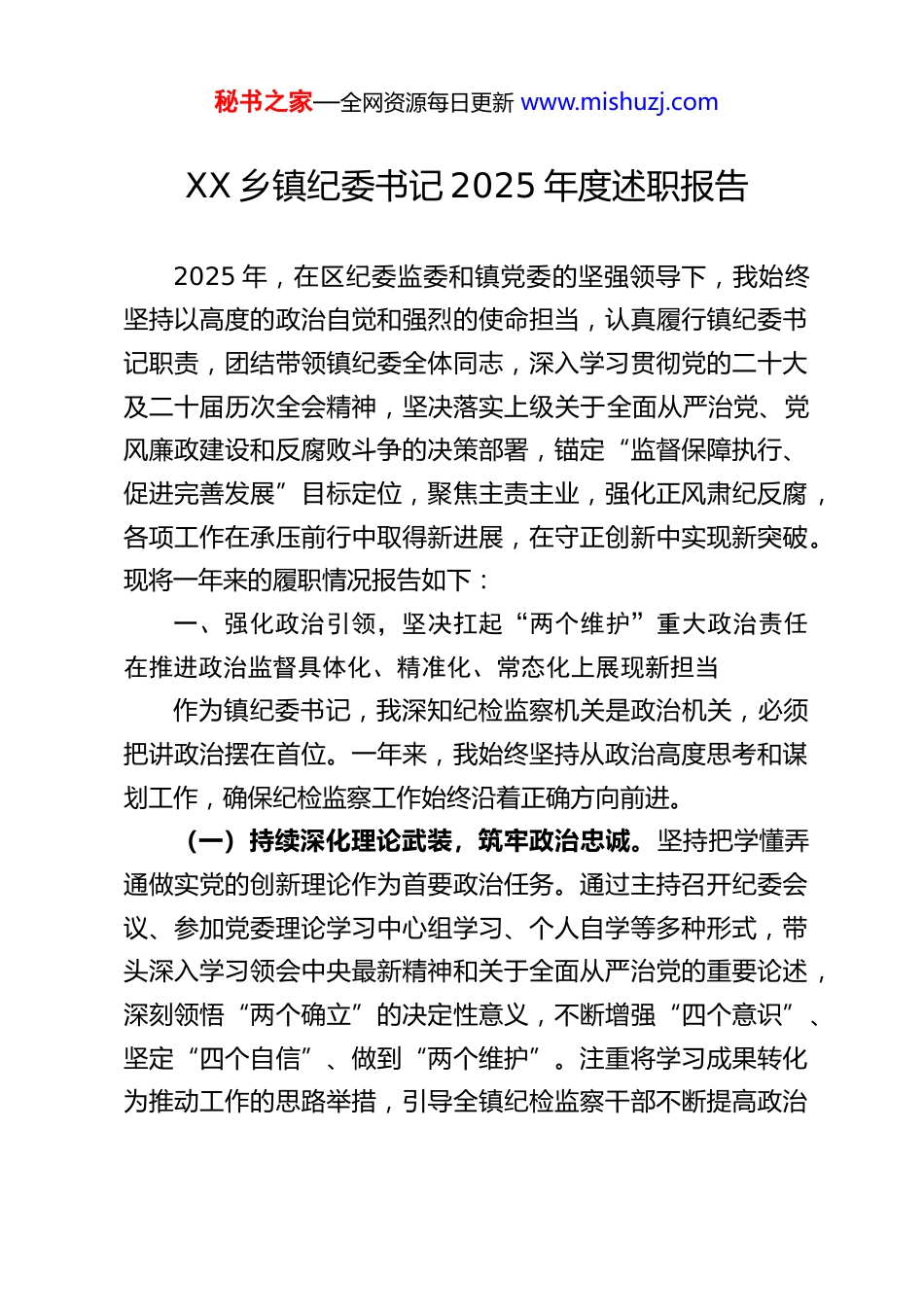 秘书之家—全网资源每日更新 www.mishuzj.comXX 乡镇纪委书记 2025 年度述职报告2025 年,在区纪委监委和镇党委的坚强领导下,我始终坚持以高度的政治自觉和强烈的使命担当,认真履行镇纪委书记职责,团结带领镇纪委全体同志,深入学习贯彻党的二十大及二十届历次全会精神,坚决落实上级关于全面从严治党、党风廉政建设和反腐败斗争的决策部署,锚定“监督保障执行、促进完善发展”目标定位,聚焦主责主业,强化正风肃纪反腐,各项工作在承压前行中取得新进展,在守正创新中实现新突破。现将一年来的履职情况报告如下:一、强化政治引领,坚决扛起“两个维护”重大政治责任在推进政治监督具体化、精准化、常态化上展现新担当作为镇纪委书记,我深知纪检监察机关是政治机关,必须把讲政治摆在首位。一年来,我始终坚持从政治高度思考和谋划工作,确保纪检监察工作始终沿着正确方向前进。(一)持续深化理论武装,筑牢政治忠诚。坚持把学懂弄通做实党的创新理论作为首要政治任务。通过主持召开纪委会议、参加党委理论学习中心组学习、个人自学等多种形式,带头深入学习领会中央最新精神和关于全面从严治党的重要论述,深刻领悟“两个确立”的决定性意义,不断增强“四个意识”、坚定“四个自信”、做到“两个维护”。注重将学习成果转化为推动工作的思路举措,引导全镇纪检监察干部不断提高政治秘书之家—全网资源每日更新 www.mishuzj.com判断力、政治领悟力、政治执行力,始终在思想上政治上行动上同党中央保持高度一致。(二)推动管党治党责任层层压实。积极协助镇党委健全完善全面从严治党责任体系。牵头或参与细化制定镇党委及其班子成员主体责任清单,推动建立定期研判、动态评估、压力传导机制。全年协助党委召开党风廉政建设专题会议 X 次,分析研判形势,部署重点任务。坚持问题导向,通过常态化开展廉政谈话、规范化组织述责述廉、精细化实施检查考核等方式,督促镇村两级党组织切实履行主体责任,推动班子成员认真履行“一岗双责”。例如,在年底的考核中,我们依据清单对 X个村(社区)党组织的管党治党责任落实情况进行了量化评价,并将结果反馈给镇党委,作为干部考评的重要依据,有效扭转了“上热下冷”现象。(三)做实做细政治监督。紧紧围绕党中央重大决策部署及省、市、区委和镇党委工作要求,特别是关于乡村振兴、生态环保、安全生产、民生保障等关键领域的重点任务,制定政治监督清单,明确监督重点、责任部门和时限要求。带领纪委同志采取专项检查、调研督导、列席重要会议等方式,跟进监督、精准监督、全程监督。例如,针对“退垸还湖”政策落实,我们开展了为期两个月的专项监督,实地走访 X 次,约谈相关责任人 X 名,发现并督促整改问题 X 个,确保了政令畅通、政策落地。全年共开展各类政治监督专项检查 X 次,推动解决了秘书之家—全网资源每日更新 www.mishuzj.com一批执行中的偏差、落差问题,保障了全镇中心工作的高效廉洁推进。(四)严肃党内政治生活。高度重视民主生活会、组织生活会的监督指导。在镇领导班子民主生活会上,我带头深入开展谈心谈话,严肃认真开展批评与自我批评,主动接受班子成员的批评意见。同时,督促指导各基层党组织规范开展组织生活,要求纪检委员切实履行职责,对搞形式、走过场的及时提醒纠正。部署开展“抵制三大问题提醒谈话”活动,我亲自与关键岗位负责人、新提任干部等进行谈话 X 人次,实现全镇公职人员、党员干部全覆盖,累计谈话 1208 人次,做到了早提醒、早预防。在重要节假日前,主持召开廉政谈话会,强调纪律要求,组织机关干部集体签署廉洁过节倡议书,让清廉之风常吹不懈。二、坚持严的基调,一体推进不敢腐、不能腐、不想腐,在巩固拓展正风肃纪反腐成果上实现新突破我深刻认识到,反腐败斗争形势依然严峻复杂,必须永远吹冲锋号。一年来,我始终坚持严字当头、全面从严、一严到底,持续深化正风肃纪反腐。(一)锲而不舍落实中央八项规定精神,纠治“四风”顽疾。将监督落实中央八项规定及其实施细则精神作为经常性工作来抓。紧盯元旦、春节、五一、端午、中秋、国庆等重要节点,...