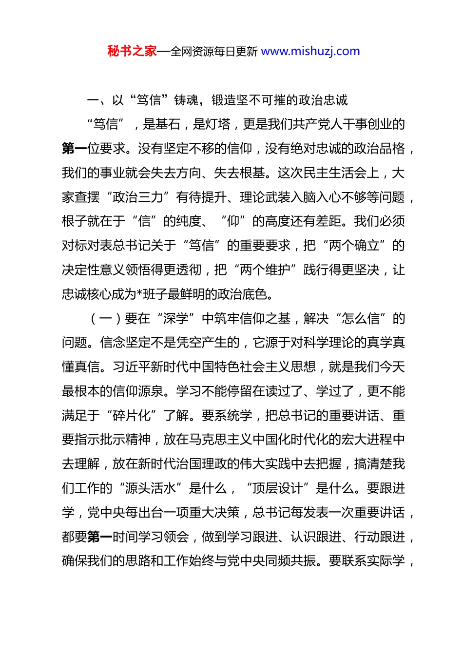 秘书之家—全网资源每日更新 www.mishuzj.com党工委书记在街道领导班子 2025 年度民主生活会上的总结讲话 同志们:今天,我们*街道领导班子 2025 年度民主生活会,在示范区第五督导组*同志、*同志的悉心指导下,经过大家的共同努力,即将结束。这次会议,我们严格按照上级要求,以中央政治局民主生活会为标杆,准备工作扎实充分,查摆问题深入具体,相互批评坦诚相见,整改方向明确清晰。可以说,这是一次严肃认真、富有成效的党内政治生活实践,达到了统一思想、深化认识、增进团结、促进工作的预期目的。督导组的指导意见,我们一定要认真领会、全面贯彻。会后,班子和个人都要针对查摆出的问题、会上相互批评的意见,进一步完善整改措施,列出清单、明确时限、落实责任,一项一项抓整改,一个一个改到位,确保民主生活会取得实实在在的效果,不辜负组织的期望和同志们的信任。下面,结合这次民主生活会的主题和大家的发言,我代表班子也谈几点意见,既是对会议成果的总结深化,也是对我们下一步加强自身建设、推动工作落实的再动员、再部署。我讲四个方面,与大家共勉。秘书之家—全网资源每日更新 www.mishuzj.com一、以“笃信”铸魂,锻造坚不可摧的政治忠诚“笃信”,是基石,是灯塔,更是我们共产党人干事创业的第一位要求。没有坚定不移的信仰,没有绝对忠诚的政治品格,我们的事业就会失去方向、失去根基。这次民主生活会上,大家查摆“政治三力”有待提升、理论武装入脑入心不够等问题,根子就在于“信”的纯度、“仰”的高度还有差距。我们必须对标对表总书记关于“笃信”的重要要求,把“两个确立”的决定性意义领悟得更透彻,把“两个维护”践行得更坚决,让忠诚核心成为*班子最鲜明的政治底色。(一)要在“深学”中筑牢信仰之基,解决“怎么信”的问题。信念坚定不是凭空产生的,它源于对科学理论的真学真懂真信。习近平新时代中国特色社会主义思想,就是我们今天最根本的信仰源泉。学习不能停留在读过了、学过了,更不能满足于“碎片化”了解。要系统学,把总书记的重要讲话、重要指示批示精神,放在马克思主义中国化时代化的宏大进程中去理解,放在新时代治国理政的伟大实践中去把握,搞清楚我们工作的“源头活水”是什么,“顶层设计”是什么。要跟进学,党中央每出台一项重大决策,总书记每发表一次重要讲话,都要第一时间学习领会,做到学习跟进、认识跟进、行动跟进,确保我们的思路和工作始终与党中央同频共振。要联系实际学,秘书之家—全网资源每日更新 www.mishuzj.com紧密结合*发展面临的产业升级瓶颈、城市管理难题、民生服务短板,从党的创新理论中找方向、找思路、找方法,把学习成果转化为谋划工作的具体思路、破解难题的实际举措、推动发展的强大动力,让理论武装的成效在*的土地上看得见、摸得着。(二)要在“细照”中把稳方向之舵,解决“信什么”的问题。“笃信”不仅要内化于心,更要外化于“行”,这个“行”首先体现在政治方向、政治立场、政治原则上的高度清醒和坚定。要时刻心怀“国之大者”,经常性地把自己摆进去、把职责摆进去、把工作摆进去,用党中央的决策部署、用党章党规党纪来“扫描”我们的思想和行动。看看我们在推进老旧小区改造时,是否真正践行了以人民为中心的发展思想;在招引项目时,是否坚守了生态环保的底线红线;在处理历史遗留复杂问题时,是否站稳了法治和政策的立场。要常态化开展对标对表、校准纠偏,就像轮船需要不断用罗盘校正航向一样,我们的工作也要经常用政治“显微镜”和“望远镜”来审视,确保在任何时候、任何情况下,我们的立场不移、方向不偏,始终沿着正确的政治道路坚定前行。(三)要在“笃行”中彰显忠诚之效,解决“信得如何”的问题。“天下至德,莫大于忠”。忠诚不是抽象的口号,最终要体现在不折不扣抓落实、推动发展的具体成效上。要把讲秘书之家—全网资源每日更新 www.mishuzj.com政治的要求融入基层治理、民生服务、经济发展的全过程、各方面。比如,在贯彻落实中央关于促进共同富裕、推动高质量发展等决策部署时,*不能停留在“传达过了”“部署了”,而要思考如何结合辖区企...