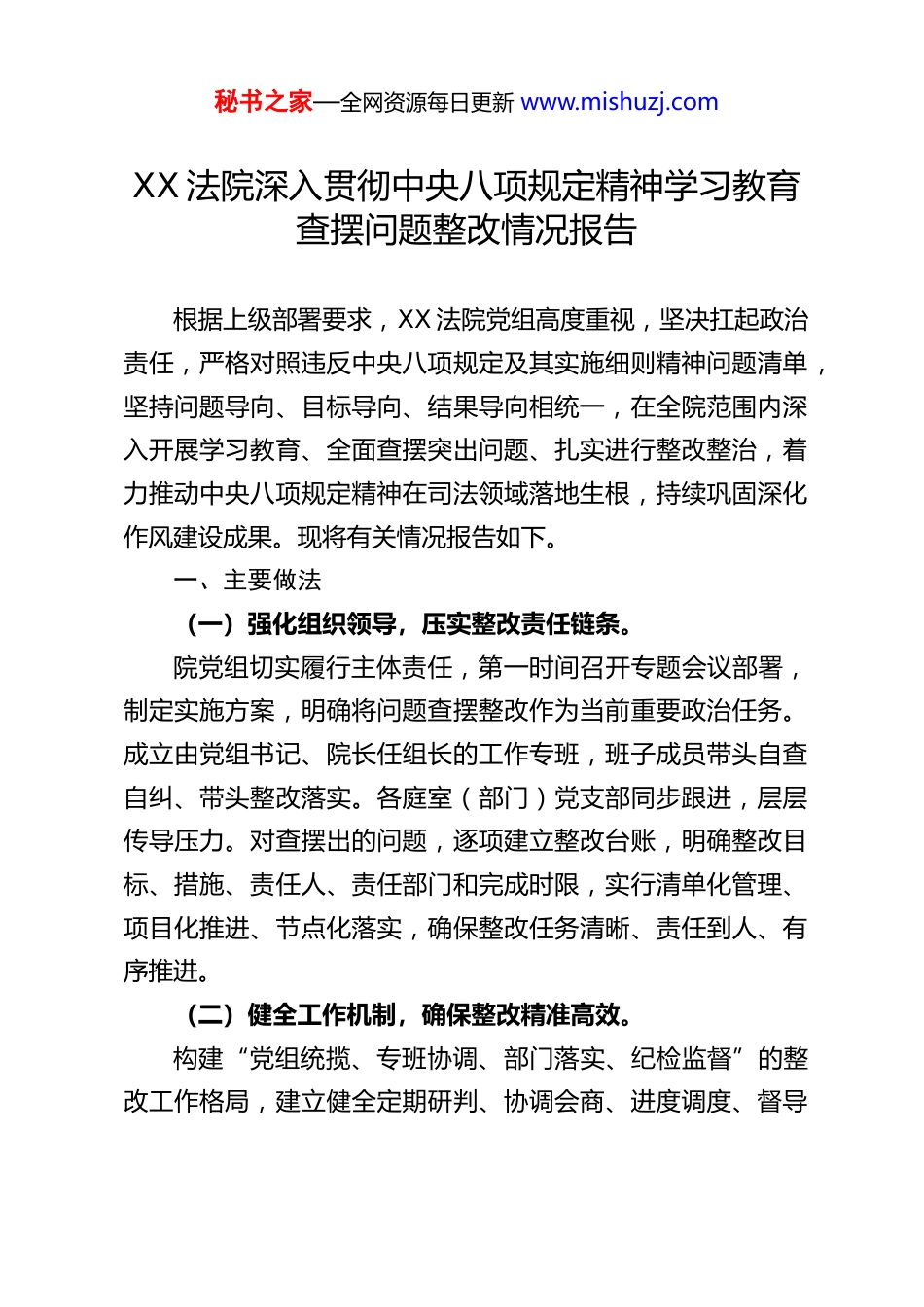 秘书之家—全网资源每日更新 www.mishuzj.comXX 法院深入贯彻中央八项规定精神学习教育查摆问题整改情况报告根据上级部署要求,XX 法院党组高度重视,坚决扛起政治责任,严格对照违反中央八项规定及其实施细则精神问题清单,坚持问题导向、目标导向、结果导向相统一,在全院范围内深入开展学习教育、全面查摆突出问题、扎实进行整改整治,着力推动中央八项规定精神在司法领域落地生根,持续巩固深化作风建设成果。现将有关情况报告如下。一、主要做法(一)强化组织领导,压实整改责任链条。院党组切实履行主体责任,第一时间召开专题会议部署,制定实施方案,明确将问题查摆整改作为当前重要政治任务。成立由党组书记、院长任组长的工作专班,班子成员带头自查自纠、带头整改落实。各庭室(部门)党支部同步跟进,层层传导压力。对查摆出的问题,逐项建立整改台账,明确整改目标、措施、责任人、责任部门和完成时限,实行清单化管理、项目化推进、节点化落实,确保整改任务清晰、责任到人、有序推进。(二)健全工作机制,确保整改精准高效。构建“党组统揽、专班协调、部门落实、纪检监督”的整改工作格局,建立健全定期研判、协调会商、进度调度、督导秘书之家—全网资源每日更新 www.mishuzj.com检查、销号管理等工作机制,形成发现问题、整改落实、跟踪问效的完整闭环。注重分类施策,针对审判执行、司法政务、队伍建设等不同领域特点,区分共性问题和个性问题,分别制定整改方案。对涉及多部门的复杂问题,由分管院领导牵头,组建联合攻坚小组,加强协同联动,确保整改措施精准滴灌、取得实效。(三)坚持司法为民,主动接受各方监督。将“开门搞整改”贯穿始终,通过召开征求意见座谈会、设置意见箱、公开举报电话、运用法院官方网站和新媒体平台等方式,广泛听取人大代表、政协委员、律师、当事人及社会各界群众的意见建议。对反映集中的司法作风、诉讼服务、审判效率等方面问题,优先纳入重点整改范围,明确时限,及时反馈。定期通报整改进展情况,邀请特约监督员、群众代表参与整改效果评估,推动整改过程由群众监督、整改成效由群众评价。二、整改进展与阶段成效截至目前,XX 法院党组共查摆出 XX 个方面 XX 个具体问题,其中已完成整改 XX 个,取得阶段性成效 X 个,剩余 X 个问题正在按计划持续推进,预计在专题民主生活会前取得明显进展或完成整改。(一)已完成整改的问题(X 项)1.针对司法作风不够严谨、庭审不规范偶有发生的问题,秘书之家—全网资源每日更新 www.mishuzj.com推动司法行为全面规范。深入开展司法作风专项整顿,组织全员学习庭审规范、司法礼仪。加强庭审巡查和网上庭审直播抽查,对发现的不规范问题及时通报、督促整改。修订完善《庭审规范细则》《法官言行指引》,强化日常监督检查,促使干警养成严谨细致、规范文明的职业习惯。例如,对法官庭审着装、言行举止、流程把控等进行明确规范;对书记员庭审记录、卷宗整理等提出更高标准要求。2.针对裁判文书质量有待提升、说理不充分问题,促进审判质效和司法公信力双提升。严格执行裁判文书制作规范,加强院庭长对裁判文书的审核把关责任。开展优秀裁判文书评选和瑕疵文书评查通报活动,树立精品意识。完善专业法官会议和审判委员会讨论机制,对疑难复杂案件加强研究,提升裁判说理的透彻性、逻辑性和公信力。例如,推行类案检索和参考制度,统一裁判尺度;对发回重审、改判案件进行重点评析,汲取教训。3.针对厉行节约意识有所淡化、司法行政运行成本控制不够精细的问题,推动“过紧日子”要求落到实处。加强勤俭节约教育,倡导绿色低碳办公,大力推进智慧法院建设,减少纸质材料流转。严格预算管理,强化财务报销审核,严控“三公”经费和一般性支出。规范物资采购、车辆使用、设备维护等管理流程。例如,推行无纸化会议,减少会议秘书之家—全网资源每日更新 www.mishuzj.com材料印制;对办公用品实行集中采购、领用登记;加强水电能耗监测管理。(二)已取得阶段性进展的问题(X 项)1.针对为基层法庭减负增效仍有空间的问题,持续优化审判管理。进一步精简要求基层法庭报...
