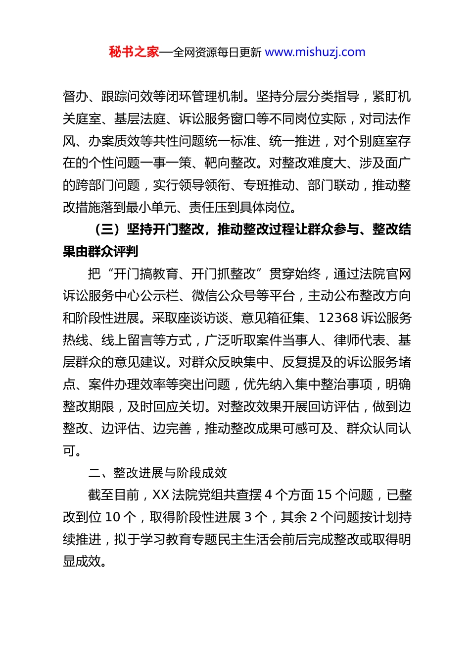 秘书之家—全网资源每日更新 www.mishuzj.comXX 法院深入贯彻中央八项规定精神学习教育查摆问题整改情况报告根据上级关于贯彻落实中央八项规定及其实施细则精神的工作部署,XX 法院党组坚持问题导向、目标导向、结果导向相统一,对照作风建设突出问题清单,结合法院审判执行、司法为民等核心工作深入查摆问题,扎实开展整改整治,推动学习教育见行见效、司法作风建设走深走实。现将有关情况报告如下。一、主要做法(一)压实责任链条,推动问题查摆整改落到人、落到事XX 法院党组紧扣上级“学查改”工作要求,及时印发专项工作提示,明确对照自查重点内容。结合司法巡查、审务督察、案件评查、信访反映等渠道发现的问题,全面开展对照查摆。坚持以上率下,院领导班子带头查作风、查责任、查漏洞,推动各庭室、各基层法庭同步跟进、同题共答。对查摆梳理的问题逐项建立整改台账,明确整改措施、责任领导、责任庭室和完成时限,做到问题清单化、措施项目化、整改节点化,确保整改整治有章可循、有据可查。(二)健全推进机制,推动分类指导与精准施策同向发力健全党组统一领导、专项工作专班牵头协调、各庭室具体落实的工作格局。建立专题研究、会商推进、调度通报、提醒秘书之家—全网资源每日更新 www.mishuzj.com督办、跟踪问效等闭环管理机制。坚持分层分类指导,紧盯机关庭室、基层法庭、诉讼服务窗口等不同岗位实际,对司法作风、办案质效等共性问题统一标准、统一推进,对个别庭室存在的个性问题一事一策、靶向整改。对整改难度大、涉及面广的跨部门问题,实行领导领衔、专班推动、部门联动,推动整改措施落到最小单元、责任压到具体岗位。(三)坚持开门整改,推动整改过程让群众参与、整改结果由群众评判把“开门搞教育、开门抓整改”贯穿始终,通过法院官网诉讼服务中心公示栏、微信公众号等平台,主动公布整改方向和阶段性进展。采取座谈访谈、意见箱征集、12368 诉讼服务热线、线上留言等方式,广泛听取案件当事人、律师代表、基层群众的意见建议。对群众反映集中、反复提及的诉讼服务堵点、案件办理效率等突出问题,优先纳入集中整治事项,明确整改期限,及时回应关切。对整改效果开展回访评估,做到边整改、边评估、边完善,推动整改成果可感可及、群众认同认可。二、整改进展与阶段成效截至目前,XX 法院党组共查摆 4 个方面 15 个问题,已整改到位 10 个,取得阶段性进展 3 个,其余 2 个问题按计划持续推进,拟于学习教育专题民主生活会前后完成整改或取得明显成效。秘书之家—全网资源每日更新 www.mishuzj.com(一)已完成整改的问题(10 项)1.针对党性锤炼不够严格、司法作风抓得不够经常的问题,推进政治担当再强化、纪律作风再绷紧坚持把党性锤炼摆在首位,严格落实领导班子成员联系基层法庭、联系群众制度,常态化开展谈心谈话、调研走访和现场办公,推动解决一批群众急难愁盼的涉诉问题。对立案、执行、审判等廉洁风险较高岗位,健全日常提醒、廉政谈话、岗位风险提示等制度机制,推动干警在交往边界、权力运行、纪律执行上知止有度、守规有矩。明确审判执行岗位公务交往“可为、不可为”清单;对案件审批、涉案财物处置、司法救助资金发放等环节,完善流程约束和痕迹管理,防止“人情案”“关系案”“口头批示”等问题。2.针对精文减会落实不够严格、会议文件质量不够高的问题,推动文风会风持续瘦身、工作推进更加务实严格执行发文必要性审核和会议计划管理制度,能合并的坚决合并、能不开的坚决不开,倡导开短会、讲短话、发短文,突出解决问题、形成闭环。健全公文审核机制,重点把住政策依据、内容实效、数据准确、表述规范等关口,坚决防止照搬照抄、穿靴戴帽、篇幅冗长。对同类审判业务事项实行“一个牵头庭室、一套材料模板、一次集中部署”;对审判委员会、院务会议定事项建立台账,明确责任庭室、办理时限和反馈要求,避免“会开了、事不落”。秘书之家—全网资源每日更新 www.mishuzj.com3.针对厉行节约意识不够强、内控管理不够精细的问题,推动过紧日子要求落实到每一笔支出、每一个环节把“过紧日子”要求纳入日常教育管...