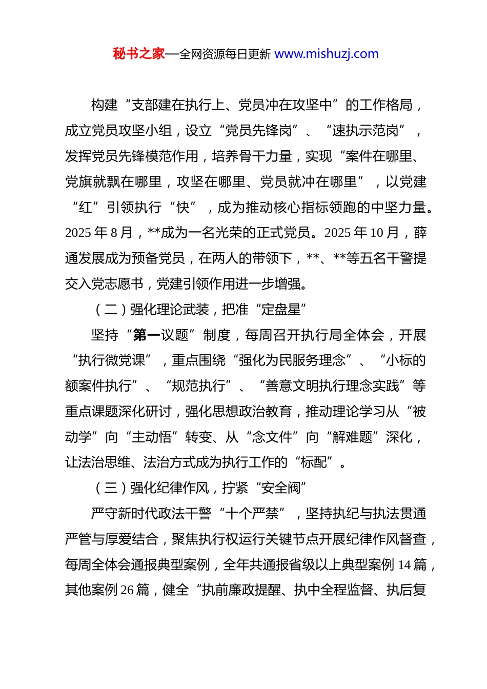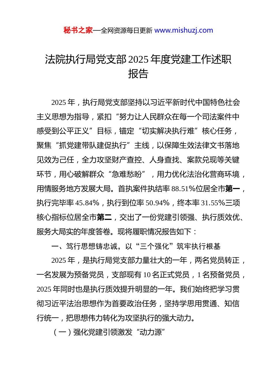秘书之家—全网资源每日更新 www.mishuzj.com法院执行局党支部 2025 年度党建工作述职报告 2025 年,执行局党支部坚持以习近平新时代中国特色社会主义思想为指导,紧扣“努力让人民群众在每一个司法案件中感受到公平正义”目标,锚定“切实解决执行难”核心任务,聚焦“抓党建带队建促执行”主线,以保障生效法律文书落地见效为己任,全力攻坚财产查控、人身查找、案款兑现等关键环节,用心破解群众“急难愁盼”,用力优化法治化营商环境,用情服务地方发展大局。首执案件执结率 88.51%位居全市第一,执行完毕率 45.84%,执行到位率 50.94%,终本率 31.55%三项核心指标位居全市第二,交出了一份党建引领强、执行质效优、服务大局实的年度答卷。现将履职情况报告如下:一、笃行思想铸忠诚,以“三个强化”筑牢执行根基2025 年,是执行局党支部力量壮大的一年,两名党员转正,一名发展为预备党员,支部现有 10 名正式党员,1 名预备党员,2025 年同时也是执行质效提升明显的一年。我们始终把学习贯彻习近平法治思想作为首要政治任务,坚持学思用贯通、知信行统一,把思想伟力转化为攻坚执行的强大动力。(一)强化党建引领激发“动力源”秘书之家—全网资源每日更新 www.mishuzj.com构建“支部建在执行上、党员冲在攻坚中”的工作格局,成立党员攻坚小组,设立“党员先锋岗”、“速执示范岗”,发挥党员先锋模范作用,培养骨干力量,实现“案件在哪里、党旗就飘在哪里,攻坚在哪里、党员就冲在哪里”,以党建“红”引领执行“快”,成为推动核心指标领跑的中坚力量。2025 年 8 月,**成为一名光荣的正式党员。2025 年 10 月,薛通发展成为预备党员,在两人的带领下,**、**等五名干警提交入党志愿书,党建引领作用进一步增强。(二)强化理论武装,把准“定盘星”坚持“第一议题”制度,每周召开执行局全体会,开展“执行微党课”,重点围绕“强化为民服务理念”、“小标的额案件执行”、“规范执行”、“善意文明执行理念实践”等重点课题深化研讨,强化思想政治教育,推动理论学习从“被动学”向“主动悟”转变、从“念文件”向“解难题”深化,让法治思维、法治方式成为执行工作的“标配”。(三)强化纪律作风,拧紧“安全阀”严守新时代政法干警“十个严禁”,坚持执纪与执法贯通严管与厚爱结合,聚焦执行权运行关键节点开展纪律作风督查,每周全体会通报典型案例,全年共通报省级以上典型案例 14 篇,其他案例 26 篇,健全“执前廉政提醒、执中全程监督、执后复秘书之家—全网资源每日更新 www.mishuzj.com盘核查”机制,打造忠诚干净担当、敢打能拼善赢的执行铁军,确保执行工作在法治轨道上规范高效运行。二、攻坚执行提质效,以“三个突破”擦亮工作品牌我们聚焦执行主责主业,以问题导向、目标导向、结果导向相统一,精准发力、靶向攻坚,推动执行质效持续领跑。(一)在“执结率”上突破,跑出“加速度”坚持“六必谈”,思想波动必谈,工作变动必谈,组织处理必谈,遇到挫折必谈,重大事项必谈,发生矛盾必谈,真正解决压在干警心中的担子,让全体执行干警能够甩开思想包袱,全力冲刺案件。不定期到执行局各个办公室,现场办公,现场询问工作中有无难题,简单问题当场解决,疑难问题共同合议,加快办理。在处理杨某某与张某某相邻关系纠纷等疑难案件时,全局干警形成合力,有效化解危机。全年执结各类执行案件5163 件,执结率 89.17%、首执案件执结率 88.51%,均位居全市第一,实现“应执尽执、快执快结”。(二)在“完毕率”上突破,啃下“硬骨头”推行“繁简分流、快慢分道”机制,对小标的案件实行“速立、速查、速执、速结”闭环管理,对复杂案件实行“一案一策”动态推进。加强与公安机关等部门联动,综合运用失信曝光、限制消费、拘传拘留等强制措施形成震慑。党员干警秘书之家—全网资源每日更新 www.mishuzj.com中李宏坤全年执行完毕 369 件。薛通全年执行完毕 193 件,有效带领其他干警干事创业的劲头,执行完毕率不断提升。全年共执行到位 2.26 亿元,让“纸上权利”变为“真金白银”,让公平正义可感可及,让生效法律文...