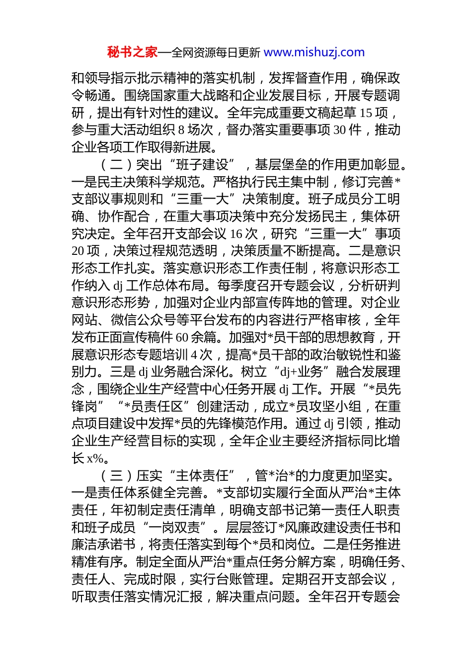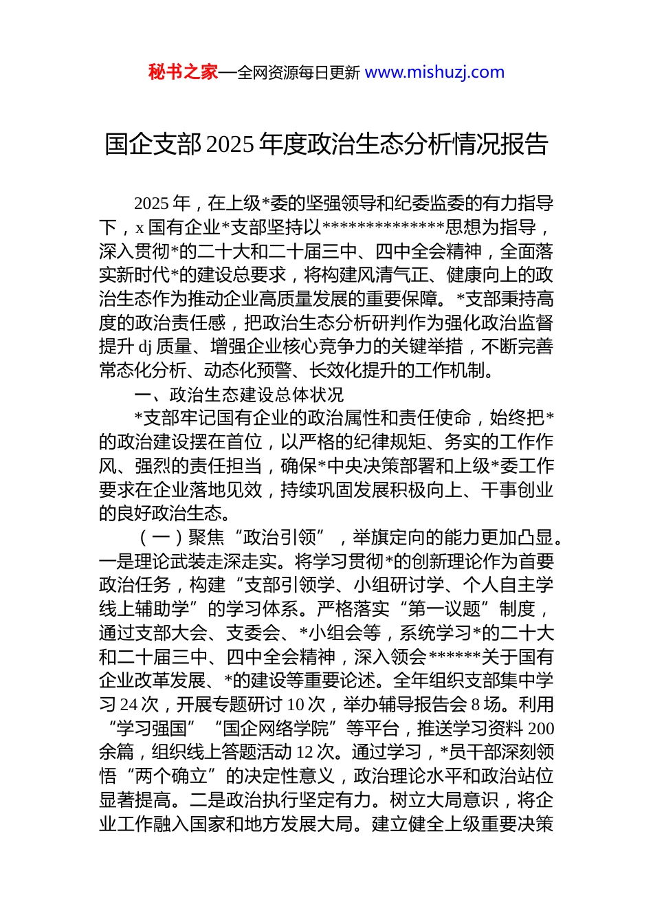 秘书之家—全网资源每日更新 www.mishuzj.com国企支部 2025 年度政治生态分析情况报告2025 年,在上级*委的坚强领导和纪委监委的有力指导下,x 国有企业*支部坚持以**************思想为指导,深入贯彻*的二十大和二十届三中、四中全会精神,全面落实新时代*的建设总要求,将构建风清气正、健康向上的政治生态作为推动企业高质量发展的重要保障。*支部秉持高度的政治责任感,把政治生态分析研判作为强化政治监督提升 dj 质量、增强企业核心竞争力的关键举措,不断完善常态化分析、动态化预警、长效化提升的工作机制。一、政治生态建设总体状况*支部牢记国有企业的政治属性和责任使命,始终把*的政治建设摆在首位,以严格的纪律规矩、务实的工作作风、强烈的责任担当,确保*中央决策部署和上级*委工作要求在企业落地见效,持续巩固发展积极向上、干事创业的良好政治生态。(一)聚焦“政治引领”,举旗定向的能力更加凸显。一是理论武装走深走实。将学习贯彻*的创新理论作为首要政治任务,构建“支部引领学、小组研讨学、个人自主学线上辅助学”的学习体系。严格落实“第一议题”制度,通过支部大会、支委会、*小组会等,系统学习*的二十大和二十届三中、四中全会精神,深入领会******关于国有企业改革发展、*的建设等重要论述。全年组织支部集中学习 24 次,开展专题研讨 10 次,举办辅导报告会 8 场。利用“学习强国”“国企网络学院”等平台,推送学习资料 200余篇,组织线上答题活动 12 次。通过学习,*员干部深刻领悟“两个确立”的决定性意义,政治理论水平和政治站位显著提高。二是政治执行坚定有力。树立大局意识,将企业工作融入国家和地方发展大局。建立健全上级重要决策秘书之家—全网资源每日更新 www.mishuzj.com和领导指示批示精神的落实机制,发挥督查作用,确保政令畅通。围绕国家重大战略和企业发展目标,开展专题调研,提出有针对性的建议。全年完成重要文稿起草 15 项,参与重大活动组织 8 场次,督办落实重要事项 30 件,推动企业各项工作取得新进展。(二)突出“班子建设”,基层堡垒的作用更加彰显。一是民主决策科学规范。严格执行民主集中制,修订完善*支部议事规则和“三重一大”决策制度。班子成员分工明确、协作配合,在重大事项决策中充分发扬民主,集体研究决定。全年召开支部会议 16 次,研究“三重一大”事项20 项,决策过程规范透明,决策质量不断提高。二是意识形态工作扎实。落实意识形态工作责任制,将意识形态工作纳入 dj 工作总体布局。每季度召开专题会议,分析研判意识形态形势,加强对企业内部宣传阵地的管理。对企业网站、微信公众号等平台发布的内容进行严格审核,全年发布正面宣传稿件 60 余篇。加强对*员干部的思想教育,开展意识形态专题培训 4 次,提高*员干部的政治敏锐性和鉴别力。三是 dj 业务融合深化。树立“dj+业务”融合发展理念,围绕企业生产经营中心任务开展 dj 工作。开展“*员先锋岗”“*员责任区”创建活动,成立*员攻坚小组,在重点项目建设中发挥*员的先锋模范作用。通过 dj 引领,推动企业生产经营目标的实现,全年企业主要经济指标同比增长 x%。(三)压实“主体责任”,管*治*的力度更加坚实。一是责任体系健全完善。*支部切实履行全面从严治*主体责任,年初制定责任清单,明确支部书记第一责任人职责和班子成员“一岗双责”。层层签订*风廉政建设责任书和廉洁承诺书,将责任落实到每个*员和岗位。二是任务推进精准有序。制定全面从严治*重点任务分解方案,明确任务、责任人、完成时限,实行台账管理。定期召开支部会议,听取责任落实情况汇报,解决重点问题。全年召开专题会秘书之家—全网资源每日更新 www.mishuzj.com议 6 次,确保各项任务按时完成。三是考核问效严格规范。将全面从严治*和意识形态工作纳入绩效考核和干部评优评先,建立动态督查机制。对履责不力的进行约谈提醒,督促整改。年底开展支部书记抓 dj 述职评议考核,强化结果运用,推动责任落实。(四)锻造“优良作风”,干事创业的氛围更加浓厚。一是作风建设常抓不懈。持之以恒落实中央八项规定...