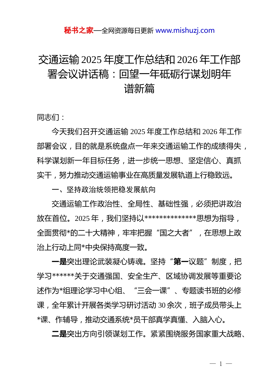 秘书之家—全网资源每日更新 www.mishuzj.com交通运输 2025 年度工作总结和 2026 年工作部署会议讲话稿:回望一年砥砺行谋划明年谱新篇同志们:今天我们召开交通运输 2025 年度工作总结和 2026 年工作部署会议,目的就是系统盘点一年来交通运输工作的成绩得失,科学谋划新一年目标任务,进一步统一思想、坚定信心、真抓实干,努力推动交通运输事业在高质量发展轨道上行稳致远。一、坚持政治统领把稳发展航向交通运输工作政治性、全局性、基础性强,必须把讲政治放在首位。2025 年,我们坚持以**************思想为指导,全面贯彻*的二十大精神,牢牢把握“国之大者”,在思想上政治上行动上同*中央保持高度一致。一是突出理论武装凝心铸魂。坚持“第一议题”制度,把学习******关于交通强国、安全生产、区域协调发展等重要论述作为*组理论学习中心组、“三会一课”、专题读书班的必修课,全年累计开展各类学习研讨活动 30 余次,班子成员带头上*课、作辅导,推动交通系统*员干部真学真懂、入脑入心。二是突出方向引领谋划工作。紧紧围绕服务国家重大战略、— 1 —秘书之家—全网资源每日更新 www.mishuzj.com服务地方发展大局,主动把交通运输工作嵌入区域协调发展、现代化产业体系、城市更新行动等总体布局,在综合交通规划编制、重大项目谋划、运输结构调整等方面自觉对标对表,把“交通怎么建、运力如何配、服务怎样优”放在全局中审视、在大局下谋划。三是突出 dj 引领夯实根基。坚持大抓基层的鲜明导向,把支部建在项目一线、把*旗插到施工现场,深化“红色工地”“*员示范岗”“青年突击队”等载体建设,把 dj 优势转化为攻坚克难、服务群众的具体行动。全年新发展*员 x 名、培训一线骨干 x 人次,基层*组织战斗堡垒作用和*员先锋模范作用得到有力彰显。二、聚焦主责主业交出亮眼答卷2025 年,在市委、市政府坚强领导下,交通运输系统坚持稳中求进工作总基调,统筹推进保通保畅、扩能提质、安全监管、行业治理等重点任务,各项工作取得新进展、呈现新气象。总体看,呈现出“稳的基础更加扎实、进的态势更加明显、好的因素加快累积”的特点。一是综合运输能力持续提升。全市综合客运量完成约 x.x亿人次,同比增长 x.x%;货运量完成约 x.x 亿吨,同比增长 x%;港口吞吐量稳定在 x 亿吨以上,民航旅客吞吐量恢复到疫— 2 —秘书之家—全网资源每日更新 www.mishuzj.com情前的 x%以上。城区公交线网优化调整 x 条,新开及延伸线路x 条,基本实现主要功能片区公交覆盖率 xx%以上;城乡客运一体化加快推进,建制村通客车率保持在 100%。二是基础设施网络更加完善。坚持“储备一批、开工一批、建成一批”,全年完成交通固定资产投资约 x 亿元,同比增长约 x%。xx 高速公路改扩建、xx 快速路、xx 枢纽站等一批重点项目加快实施,国省干线提质改造公里数超 x 公里,农村公路“窄路基路面加宽”“安全生命防护工程”推进有力,三级以上航道里程稳步增加,多层级、立体化综合交通网络加快成形。三是安全生产形势总体稳定。坚持“人民至上、生命至上”,压紧压实“三管三必须”责任,深入推进道路运输安全专项整治和隐患排查治理。全年共检查道路运输企业 x 家次、车辆 x 万辆次,排查整改各类隐患 x 条;推进“两客一危一货”车辆动态监控,规范营运秩序,严查超载超限、疲劳驾驶、非法营运等违法行为,道路运输较大以上责任事故起数和死亡人数实现“双下降”,行业安全生产形势总体可控。四是行业治理效能明显提升。持续深化“放管服”改革,完善行政审批“一件事一次办”“跨域通办”机制,道路运输许可、网约车管理等事项实现网上受理、全程网办。加快推广etc、电子客票、无纸化货运单据等应用,推动交通运输数字化— 3 —秘书之家—全网资源每日更新 www.mishuzj.com转型。常态化推进治超治乱、“黑车”整治、非法码头整治等专项行动,营商环境不断优化,市场秩序持续规范。五是服务民生品质不断提高。聚焦群众“急难愁盼”,推进城市公交提质行动和农村客运巩固提升工程,优化公交站点布局,推广定制公交、社区巴士、预...