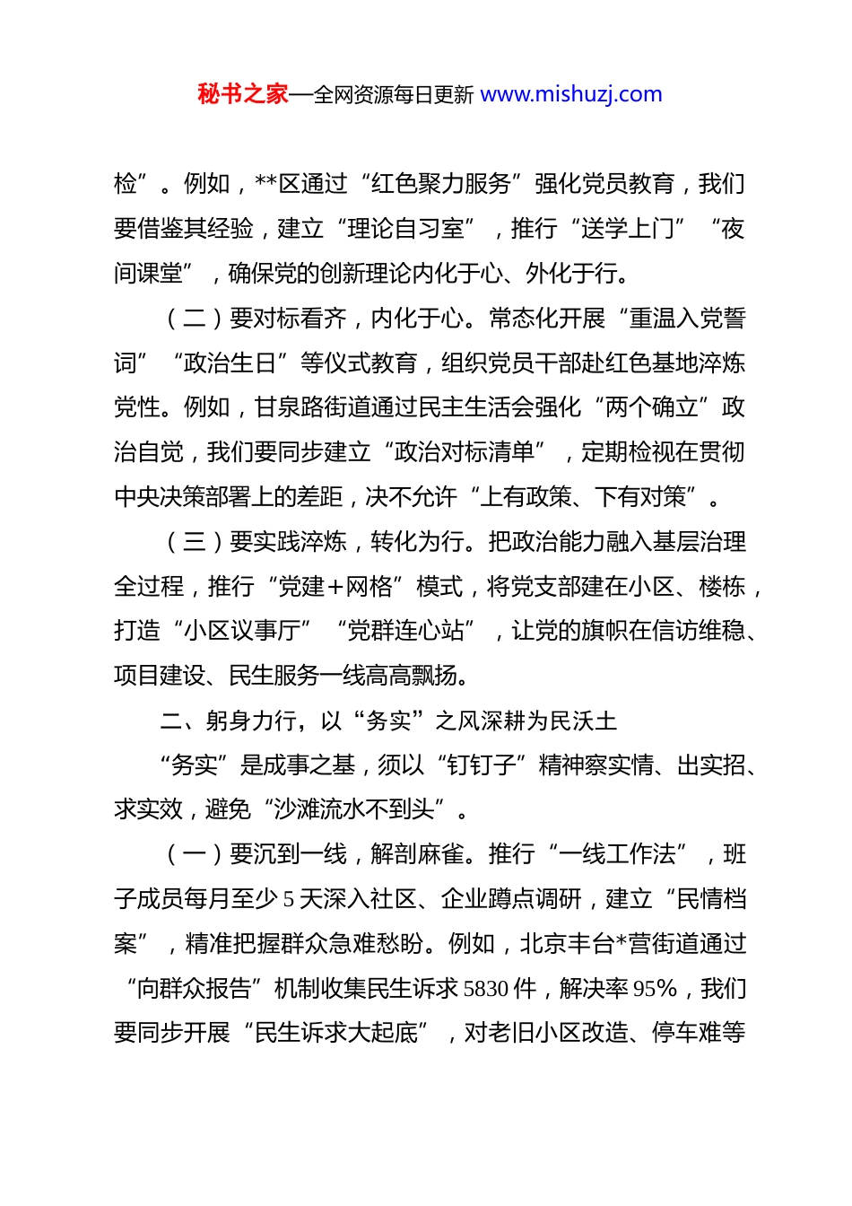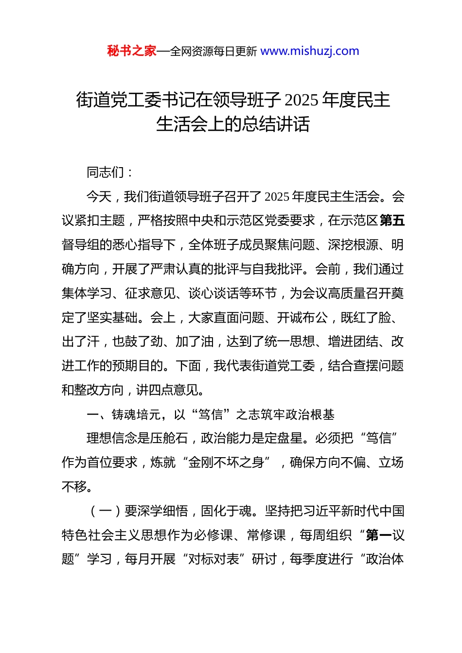 秘书之家—全网资源每日更新 www.mishuzj.com街道党工委书记在领导班子 2025 年度民主生活会上的总结讲话 同志们:今天,我们街道领导班子召开了 2025 年度民主生活会。会议紧扣主题,严格按照中央和示范区党委要求,在示范区第五督导组的悉心指导下,全体班子成员聚焦问题、深挖根源、明确方向,开展了严肃认真的批评与自我批评。会前,我们通过集体学习、征求意见、谈心谈话等环节,为会议高质量召开奠定了坚实基础。会上,大家直面问题、开诚布公,既红了脸、出了汗,也鼓了劲、加了油,达到了统一思想、增进团结、改进工作的预期目的。下面,我代表街道党工委,结合查摆问题和整改方向,讲四点意见。一、铸魂培元,以“笃信”之志筑牢政治根基理想信念是压舱石,政治能力是定盘星。必须把“笃信”作为首位要求,炼就“金刚不坏之身”,确保方向不偏、立场不移。(一)要深学细悟,固化于魂。坚持把习近平新时代中国特色社会主义思想作为必修课、常修课,每周组织“第一议题”学习,每月开展“对标对表”研讨,每季度进行“政治体秘书之家—全网资源每日更新 www.mishuzj.com检”。例如,**区通过“红色聚力服务”强化党员教育,我们要借鉴其经验,建立“理论自习室”,推行“送学上门”“夜间课堂”,确保党的创新理论内化于心、外化于行。(二)要对标看齐,内化于心。常态化开展“重温入党誓词”“政治生日”等仪式教育,组织党员干部赴红色基地淬炼党性。例如,甘泉路街道通过民主生活会强化“两个确立”政治自觉,我们要同步建立“政治对标清单”,定期检视在贯彻中央决策部署上的差距,决不允许“上有政策、下有对策”。(三)要实践淬炼,转化为行。把政治能力融入基层治理全过程,推行“党建+网格”模式,将党支部建在小区、楼栋,打造“小区议事厅”“党群连心站”,让党的旗帜在信访维稳、项目建设、民生服务一线高高飘扬。二、躬身力行,以“务实”之风深耕为民沃土“务实”是成事之基,须以“钉钉子”精神察实情、出实招、求实效,避免“沙滩流水不到头”。(一)要沉到一线,解剖麻雀。推行“一线工作法”,班子成员每月至少 5 天深入社区、企业蹲点调研,建立“民情档案”,精准把握群众急难愁盼。例如,北京丰台*营街道通过“向群众报告”机制收集民生诉求 5830 件,解决率 95%,我们要同步开展“民生诉求大起底”,对老旧小区改造、停车难等秘书之家—全网资源每日更新 www.mishuzj.com问题“挂牌督办”。(二)要精准施策,靶向发力。针对*区“三次调解制度”化解矛盾 3100 余件的经验,我们要完善“街社吹哨、部门报到”机制,用好“智慧*”类平台,实现民生问题“接诉即办、一办到底”。例如,对草桥欣园乒乓球场改造类项目,要全程跟踪、限时办结。(三)要常态长效,健全机制。建立“实事清单”销号制度,推广“旧物换鲜花”“共享洗衣房”等创新做法,将“临时惠民”变为“长效普惠”。同步引入第三方评估,杜绝“形象工程”“数据造假”,确保每项工作经得起历史检验。三、扛鼎破局,以“担当”之勇开拓发展新局“担当”是时代考题,须以“逢山开路、遇水架桥”的锐气攻难关、促发展、守底线。(一)要攻坚克难,敢啃硬骨头。聚焦经济发展主责主业学习*营街道前 7 个月新设企业 165 家、留区税收增长 15.3%的经验,我们要实施“招商倍增计划”,打造“青创村”类孵化平台,推动花卉产业数字化转型,确保一季度“开门红”。(二)要改革创新,善用新打法。借鉴佛山“把支部建在小区”延伸神经末梢的做法,我们要探索“党建+商圈”模式,在西南郊冷库更新类项目中组建“行动党支部”,推动产业升秘书之家—全网资源每日更新 www.mishuzj.com级与党建融合双赢。(三)要兜牢底线,筑牢防火墙。强化风险意识,建立“风险隐患数据库”,针对安全生产、债务化解等领域开展“百日攻坚”。例如,**区通过“五色服务”帮扶失业人员200 余名,我们要同步构建“就业帮扶联盟”,确保社会大局稳定。四、修身正己,以“自律”之严永葆清廉本色“自律”是护身符,须常怀敬畏、严以用权、净化生态,做到“身正不怕影子斜”。(一)要慎独慎微,筑...
