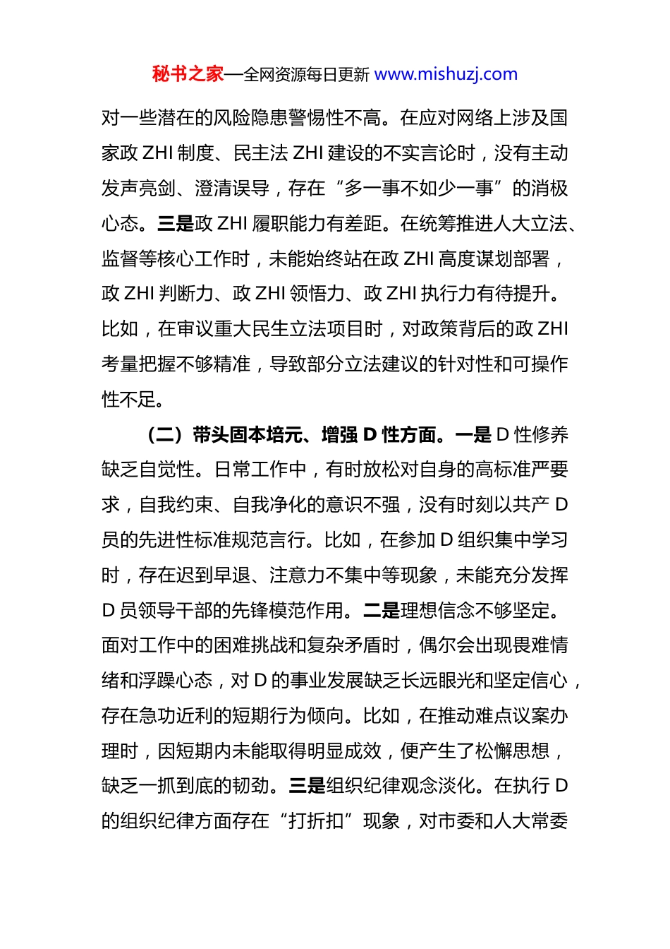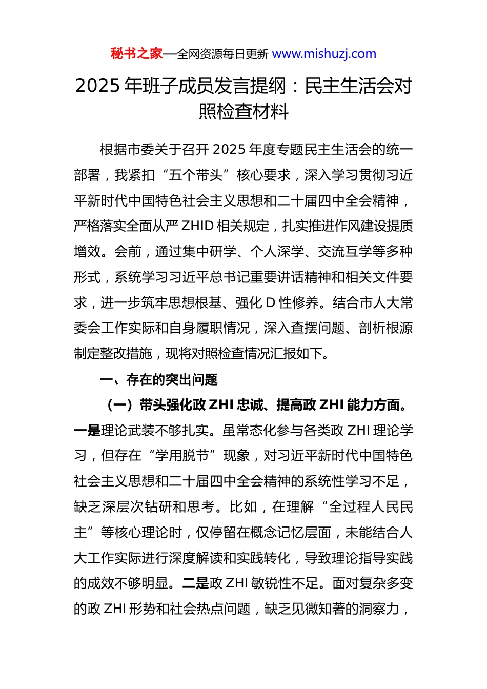 秘书之家—全网资源每日更新 www.mishuzj.com2025 年班子成员发言提纲:民主生活会对照检查材料根据市委关于召开 2025 年度专题民主生活会的统一部署,我紧扣“五个带头”核心要求,深入学习贯彻习近平新时代中国特色社会主义思想和二十届四中全会精神,严格落实全面从严 ZHID 相关规定,扎实推进作风建设提质增效。会前,通过集中研学、个人深学、交流互学等多种形式,系统学习习近平总书记重要讲话精神和相关文件要求,进一步筑牢思想根基、强化 D 性修养。结合市人大常委会工作实际和自身履职情况,深入查摆问题、剖析根源制定整改措施,现将对照检查情况汇报如下。一、存在的突出问题(一)带头强化政 ZHI 忠诚、提高政 ZHI 能力方面。一是理论武装不够扎实。虽常态化参与各类政 ZHI 理论学习,但存在“学用脱节”现象,对习近平新时代中国特色社会主义思想和二十届四中全会精神的系统性学习不足,缺乏深层次钻研和思考。比如,在理解“全过程人民民主”等核心理论时,仅停留在概念记忆层面,未能结合人大工作实际进行深度解读和实践转化,导致理论指导实践的成效不够明显。二是政 ZHI 敏锐性不足。面对复杂多变的政 ZHI 形势和社会热点问题,缺乏见微知著的洞察力,秘书之家—全网资源每日更新 www.mishuzj.com对一些潜在的风险隐患警惕性不高。在应对网络上涉及国家政 ZHI 制度、民主法 ZHI 建设的不实言论时,没有主动发声亮剑、澄清误导,存在“多一事不如少一事”的消极心态。三是政 ZHI 履职能力有差距。在统筹推进人大立法、监督等核心工作时,未能始终站在政 ZHI 高度谋划部署,政 ZHI 判断力、政 ZHI 领悟力、政 ZHI 执行力有待提升。比如,在审议重大民生立法项目时,对政策背后的政 ZHI考量把握不够精准,导致部分立法建议的针对性和可操作性不足。(二)带头固本培元、增强 D 性方面。一是 D 性修养缺乏自觉性。日常工作中,有时放松对自身的高标准严要求,自我约束、自我净化的意识不强,没有时刻以共产 D员的先进性标准规范言行。比如,在参加 D 组织集中学习时,存在迟到早退、注意力不集中等现象,未能充分发挥D 员领导干部的先锋模范作用。二是理想信念不够坚定。面对工作中的困难挑战和复杂矛盾时,偶尔会出现畏难情绪和浮躁心态,对 D 的事业发展缺乏长远眼光和坚定信心,存在急功近利的短期行为倾向。比如,在推动难点议案办理时,因短期内未能取得明显成效,便产生了松懈思想,缺乏一抓到底的韧劲。三是组织纪律观念淡化。在执行 D的组织纪律方面存在“打折扣”现象,对市委和人大常委秘书之家—全网资源每日更新 www.mishuzj.com会 D 组的决策部署,有时存在执行不及时、落实不到位的情况。比如,在落实 D 组安排的专项调研任务时,没有严格按照时间节点推进,也未及时汇报进展情况,影响了整体工作部署。(三)带头敬畏人民、敬畏组织、敬畏法纪方面。一是为民服务不够深入。工作中存在“重程序、轻实效”的倾向,没有真正把群众利益放在首位,深入基层、联系群众不够紧密。比如,在开展执法检查和代表视察活动时,往往侧重于听汇报、看材料,与基层群众面对面交流不够对群众反映强烈的急难愁盼问题掌握不全面、了解不透彻二是对组织敬畏不足。在处理一些工作事务时,有时过于强调个人主观判断,对组织的决定和安排不够尊重,重大事项请示报告不够及时规范。比如,在协调跨部门工作时没有充分征求 D 组意见便擅自表态,导致部分工作衔接出现漏洞。三是法纪观念不够强烈。对法律法规和人大工作规章制度的学习不够系统,执行不够严格,存在“凭经验办事”的现象。比如,在规范性文件备案审查工作中,有时因追求效率而简化审查流程,对部分细节条款的合法性审核不够严谨。(四)带头干事创业、担当作为方面。一是工作积极性有待提高。面对人大常规性工作,有时存在“按部就班秘书之家—全网资源每日更新 www.mishuzj.com得过且过”的思想,缺乏主动谋划、开拓创新的意识。比如,在代表履职培训工作中,始终沿用传统培训模式,没有结合新时代代表工作特点创新方式方法,导致培训效果不够理想。二是担...