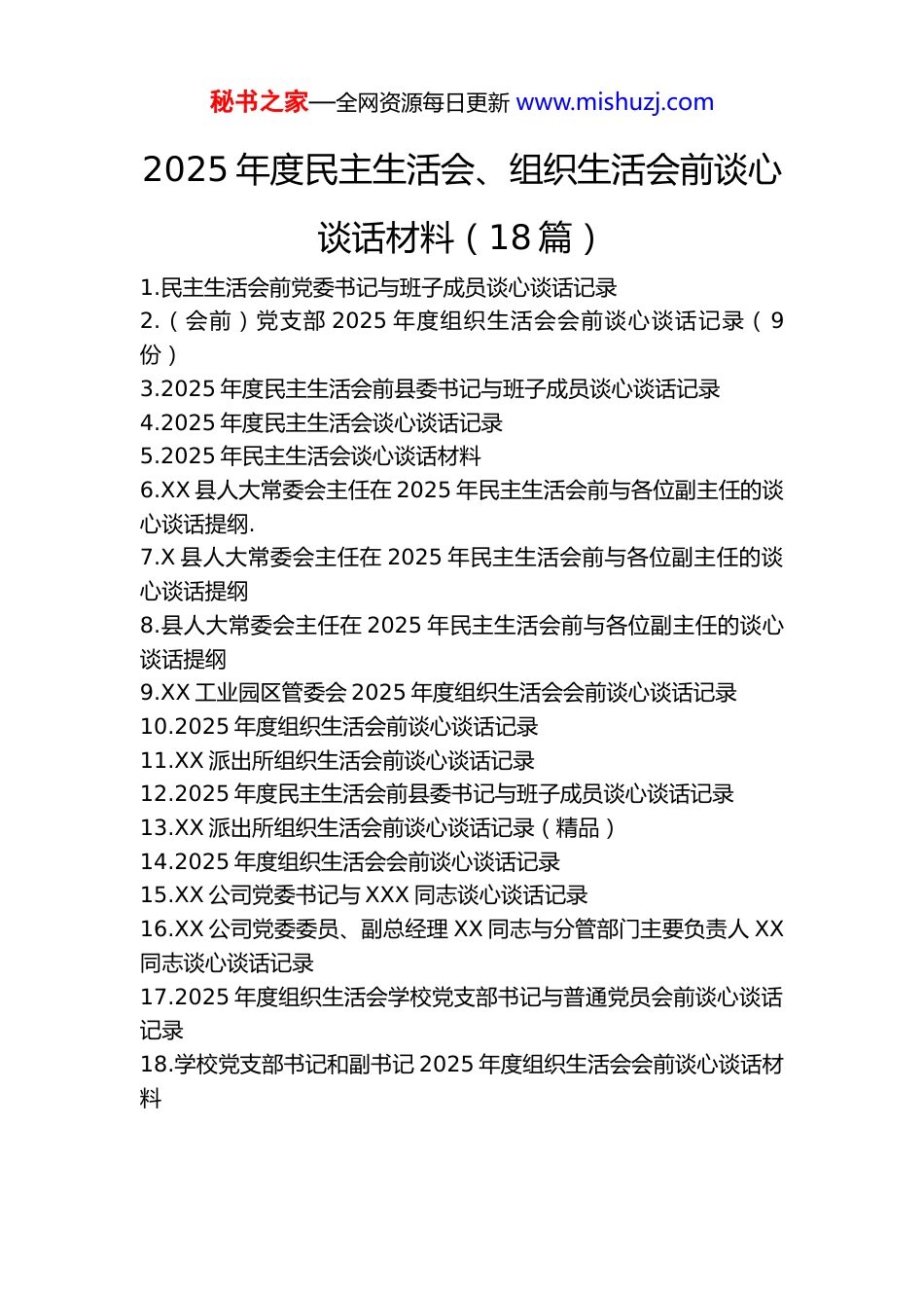 秘书之家—全网资源每日更新 www.mishuzj.com2025 年度民主生活会、组织生活会前谈心谈话材料(18 篇)1.民主生活会前党委书记与班子成员谈心谈话记录2.(会前)党支部 2025 年度组织生活会会前谈心谈话记录(9份)3.2025 年度民主生活会前县委书记与班子成员谈心谈话记录4.2025 年度民主生活会谈心谈话记录5.2025 年民主生活会谈心谈话材料6.XX 县人大常委会主任在 2025 年民主生活会前与各位副主任的谈心谈话提纲.7.X 县人大常委会主任在 2025 年民主生活会前与各位副主任的谈心谈话提纲8.县人大常委会主任在 2025 年民主生活会前与各位副主任的谈心谈话提纲9.XX 工业园区管委会 2025 年度组织生活会会前谈心谈话记录10.2025 年度组织生活会前谈心谈话记录11.XX 派出所组织生活会前谈心谈话记录12.2025 年度民主生活会前县委书记与班子成员谈心谈话记录13.XX 派出所组织生活会前谈心谈话记录(精品)14.2025 年度组织生活会会前谈心谈话记录15.XX 公司党委书记与 XXX 同志谈心谈话记录16.XX 公司党委委员、副总经理 XX 同志与分管部门主要负责人 XX同志谈心谈话记录17.2025 年度组织生活会学校党支部书记与普通党员会前谈心谈话记录18.学校党支部书记和副书记 2025 年度组织生活会会前谈心谈话材料秘书之家—全网资源每日更新 www.mishuzj.com民主生活会前党委书记与班子成员谈心谈话记录时间:2026 年元月 X 日(星期 X)下午 X 时地点:党委会议室主持人:X(党委书记)出席人员:X(党委书记)、X(党委副书记、X长 ) 、 X ( 党 委 副 书 记 ) 、 X ( 党 委 委 员 、 纪 委 书记)、X(党委委员、组织部长)、X(党委委员、宣传部长)、X(党委委员、统战部长)记录人:X(党委办公室秘书)会议主题:深入学习贯彻党的二十届四中全会精神,对照党章党规,对照初心使命,对照先进典型,紧密联系班子和个人思想、工作、作风实际,深入查摆问题、剖析根源,严肃认真开展批评与自我批评,为开出高质量民主生活会做好思想准备和工作准备。党委书记 X:同志们,根据上级党组织关于开好年度民主生活会的要求和党委工作安排,今天我们召开一次专题谈心谈话会。主要目的是在民主生活会前,大家在一起敞开心扉、交流思想、沟通情况、相互提醒、增进了解、共同提高。民主生活会是党内政治生活的重要内容,是发扬党内民主、加强党内监督、依靠领导班子自身力量解决矛盾和问题的重要方式。开好这次民主生活会,对于我们进一步统一思想、凝聚共识、改进作风、推动工作,具有十分重要的意义。会前,大家都按要求认真学习了党的二十届四中全会精神和党章,学习了习近平总书记系列重要讲话和指示批示精神,学习了党中央关于民主生活会的有关要求,为开好会议打下了思想基础。今天,我们不以正式会议的形秘书之家—全网资源每日更新 www.mishuzj.com式,而是以谈心谈话的方式,先进行一轮深入的沟通。希望大家打消顾虑,本着对党忠诚、对事业负责、对同志关心的态度,讲真话、实话、心里话,既主动剖析自己,又诚恳相互提醒。要做到“四个谈透”:把班子问题谈透、把个人问题谈透、把对方问题谈透、把拟在会上提出的批评意见谈透。我先带个头,作个自我剖析,也欢迎大家对我提出批评意见。过去一年,在同志们的支持下,我认真履行党委书记职责,团结带领班子成员,推动各项工作取得了一些进展。但深刻反思,自身还存在不少问题和不足:一是理论武装的深度和转化效率有待加强。虽然能够坚持学习党的创新理论,但在系统把握、精髓要义的理解上还不够透彻,特别是将科学理论转化为谋划工作的思路、破解难题的办法、推动发展的实效方面,还存在学用脱节现象。有时满足于学习了、传达了,但在结合实际创造性贯彻落实上思考不深、举措不新。例如,在运用新发展理念指导我们具体领域改革攻坚时,思路还不够开阔,突破性举措不多。二是攻坚克难的锐气和担当精神有待提升。面对发展中的深层次矛盾和历史遗留问题,有时存在求稳怕乱思想,怕踩红线、怕出问题,攻坚拔寨的勇气和“钉钉子”的精神有所减弱。对于一些需要多部门协同推进...