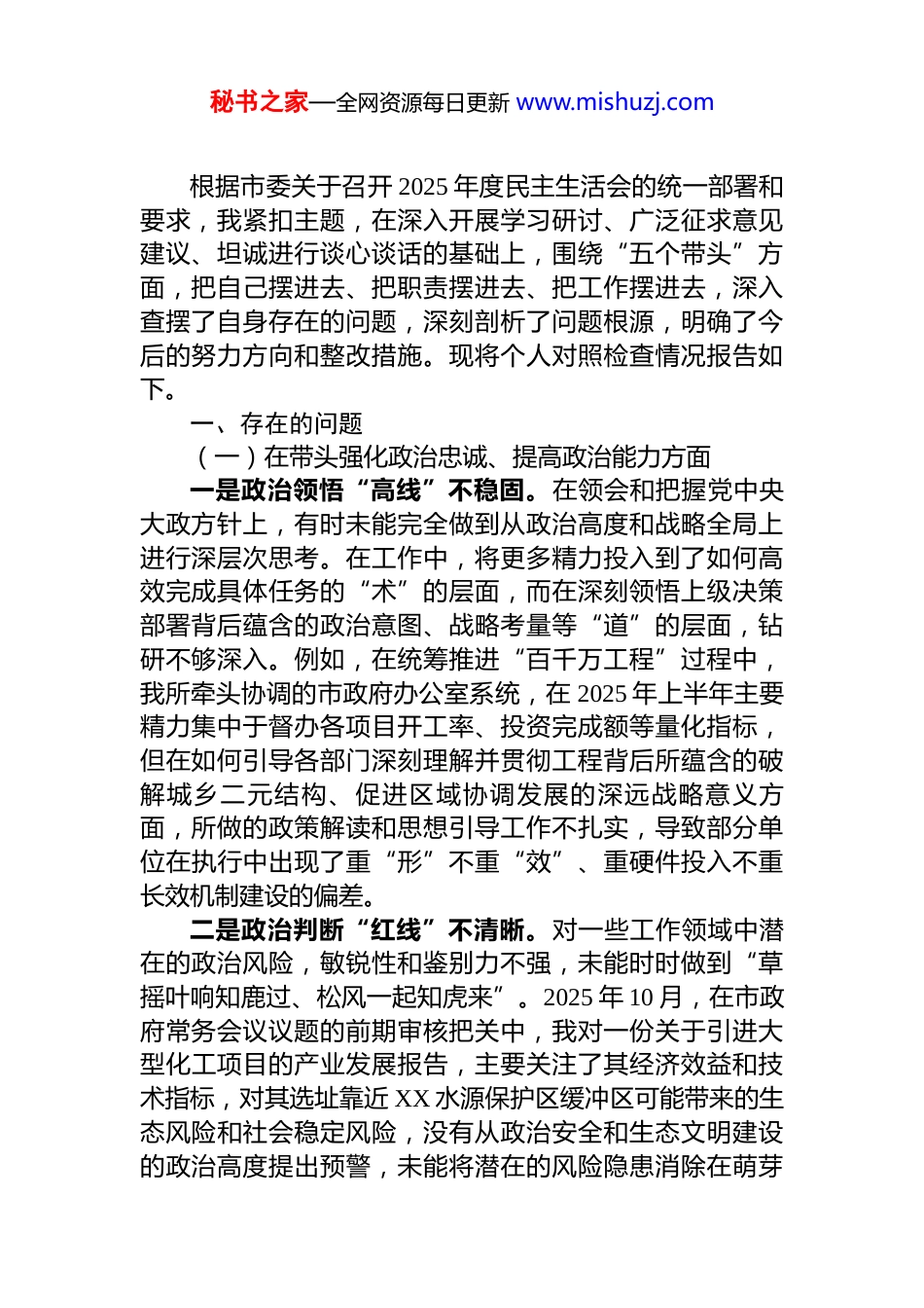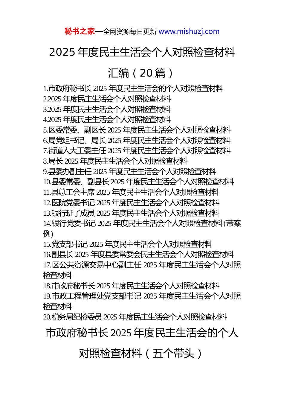 秘书之家—全网资源每日更新 www.mishuzj.com2025 年度民主生活会个人对照检查材料汇编(20 篇)1.市政府秘书长 2025 年度民主生活会的个人对照检查材料2.2025 年度民主生活会个人对照检查材料3.2025 年度民主生活会个人对照检查材料4.2025 年度民主生活会个人对照检查材料5.区委常委、副区长 2025 年度民主生活会个人对照检查材料6.局党组书记、局长 2025 年度民主生活会个人对照检查材料7.街道人大工委主任 2025 年度民主生活会个人对照检查材料8.局长 2025 年度民主生活会个人对照检查材料9.县委办副主任 2025 年度民主生活会个人对照检查材料10.县委常委、副县长 2025 年度民主生活会个人对照检查材料11.县总工会主席 2025 年度民主生活会个人对照检查材料12.医院党委书记 2025 年度民主生活会个人对照检查材料13.银行班子成员 2025 年度民主生活会个人对照检查材料14.银行党委书记 2025 年度民主生活会个人对照检查材料(带案例)15.党支部书记 2025 年度民主生活会个人对照检查材料16.副县长 2025 年度县委常委会民主生活会个人对照检查材料17.区公共资源交易中心副主任 2025 年度民主生活会个人对照检查材料18.市政府秘书长 2025 年度民主生活会个人对照检查材料19.市政工程管理处党支部书记 2025 年度民主生活会个人对照检查材料20.税务局纪检委员 2025 年度民主生活会个人对照检查材料市政府秘书长 2025 年度民主生活会的个人对照检查材料(五个带头)秘书之家—全网资源每日更新 www.mishuzj.com根据市委关于召开 2025 年度民主生活会的统一部署和要求,我紧扣主题,在深入开展学习研讨、广泛征求意见建议、坦诚进行谈心谈话的基础上,围绕“五个带头”方面,把自己摆进去、把职责摆进去、把工作摆进去,深入查摆了自身存在的问题,深刻剖析了问题根源,明确了今后的努力方向和整改措施。现将个人对照检查情况报告如下。一、存在的问题(一)在带头强化政治忠诚、提高政治能力方面一是政治领悟“高线”不稳固。在领会和把握党中央大政方针上,有时未能完全做到从政治高度和战略全局上进行深层次思考。在工作中,将更多精力投入到了如何高效完成具体任务的“术”的层面,而在深刻领悟上级决策部署背后蕴含的政治意图、战略考量等“道”的层面,钻研不够深入。例如,在统筹推进“百千万工程”过程中,我所牵头协调的市政府办公室系统,在 2025 年上半年主要精力集中于督办各项目开工率、投资完成额等量化指标,但在如何引导各部门深刻理解并贯彻工程背后所蕴含的破解城乡二元结构、促进区域协调发展的深远战略意义方面,所做的政策解读和思想引导工作不扎实,导致部分单位在执行中出现了重“形”不重“效”、重硬件投入不重长效机制建设的偏差。二是政治判断“红线”不清晰。对一些工作领域中潜在的政治风险,敏锐性和鉴别力不强,未能时时做到“草摇叶响知鹿过、松风一起知虎来”。2025 年 10 月,在市政府常务会议议题的前期审核把关中,我对一份关于引进大型化工项目的产业发展报告,主要关注了其经济效益和技术指标,对其选址靠近 XX 水源保护区缓冲区可能带来的生态风险和社会稳定风险,没有从政治安全和生态文明建设的政治高度提出预警,未能将潜在的风险隐患消除在萌芽秘书之家—全网资源每日更新 www.mishuzj.com状态。虽然该问题在后续环节被市生态环境局及时指出并纠正,但反映出我个人在重大决策前的政治风险评估能力存在明显短板。三是政治执行“底线”不坚决。在贯彻落实上级决策部署时,虽然做到了令行禁止,但在执行的力度、速度和效果上,有时存在因兼顾多项中心工作而导致落实节奏滞后的现象,未能做到“马上就办、办就办好”。2025 年第三季度,省政府下发了关于深化“数字政府”2.0 建设、全面推广“粤系列”平台应用一体化的指导意见,我按常规批示交由市数据局牵头办理,但因当时正值全市“十五五”规划纲要编制和年度财政预算编制的关键期,我未能持续跟踪督办,导致我市的实施方案直到 12 月底才正式出台,相比珠三角兄弟城市普遍晚了一个季度,错失了部分试点政策的先机。(二)在带头固...