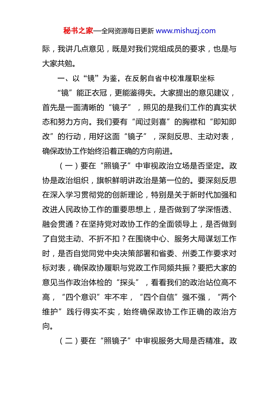 秘书之家—全网资源每日更新 www.mishuzj.com在政协 2025 年度民主生活会会前征求意见座谈会上的讲话同志们:今天我们召开州政协党组 2025 年度民主生活会会前征求意见座谈会,主要目的是深入学习贯彻党中央关于加强党的建设特别是民主生活会的部署要求,广泛听取各方面对州政协党组及其成员的意见建议,为高质量开好年度民主生活会打下坚实基础。刚才,与会各位同志,包括我们部分政协常委、委员代表,州直相关部门负责同志,以及来自基层、企业、文化教育等领域的代表,都作了很好的发言。大家紧密围绕民主生活会主题,结合全州发展大局和政协工作实际,聚焦经济社会发展重点、群众关心热点、社会治理难点,特别是新闻中提到的村集体经济、文旅产业发展、优化企业政策等方面,提出了许多坦诚、中肯、富有建设性的意见建议。这些意见建议,就像一面面镜子,照出了我们工作中可能存在的盲区;就像一把把尺子,量出了我们履职尽责的差距;就像一剂剂良药,有助于我们祛除作风之弊、提升工作之效。我们将认真梳理、逐条研究、充分吸纳,将其转化为改进工作、推动政协事业发展的具体举措。下面,结合大家的发言和政协工作实秘书之家—全网资源每日更新 www.mishuzj.com际,我讲几点意见,既是对我们党组成员的要求,也是与大家共勉。一、以“镜”为鉴,在反躬自省中校准履职坐标“镜”能正衣冠,更能鉴得失。大家提出的意见建议,首先是一面清晰的“镜子”,照见的是我们工作的真实状态和努力方向。我们要有“闻过则喜”的胸襟和“即知即改”的行动,用好这面“镜子”,深刻反思、主动对表,确保政协工作始终沿着正确的方向前进。(一)要在“照镜子”中审视政治立场是否坚定。政协是政治组织,旗帜鲜明讲政治是第一位的。要深刻反思在深入学习贯彻党的创新理论,特别是关于新时代加强和改进人民政协工作的重要思想上,是否做到了学深悟透、融会贯通?在坚持党对政协工作的全面领导上,是否做到了自觉主动、不折不扣?在围绕中心、服务大局谋划工作时,是否自觉同党中央决策部署和省委、州委工作要求对标对表,确保政协履职与党政工作同频共振?要把大家的意见当作政治体检的“探头”,看看我们的政治站位高不高,“四个意识”牢不牢,“四个自信”强不强,“两个维护”践行得实不实,始终确保政协工作正确的政治方向。(二)要在“照镜子”中审视服务大局是否精准。政秘书之家—全网资源每日更新 www.mishuzj.com协的“协”就是围绕大局协商、助力大局协同。要反思我们的调研选题是否紧扣了全州高质量发展的关键,比如大家关注的村集体经济“造血”功能不足、文旅产业融合不深、企业政策获得感不强等问题,我们是否提前关注、深入调研、提出了真知灼见?我们的协商议政活动是否起到了建言资政和凝聚共识双向发力的作用?提案、社情民意信息等工作是否真正聚焦了党政所思、群众所盼、发展所需?要用意见建议这面“镜子”,照一照我们的履职靶心瞄得准不准,建言质量高不高,服务发展的实效好不好,不断校准服务大局的精度和深度。(三)要在“照镜子”中审视联系群众是否紧密。政协的血脉在人民,根基在人民。要反思我们深入基层、深入群众的频率和深度够不够?是否真正听到了原汁原味的群众呼声?界别协商、委员工作室等渠道作用发挥是否充分?在反映社情民意、化解矛盾纠纷、凝聚社会共识方面,是否发挥了应有的桥梁纽带作用?特别是对于来自乡镇(街道)、企业、社会各界的意见,我们是否建立了畅通有效的吸纳反馈机制?要以意见建议为镜,照一照我们的“人民政协为人民”的理念树得牢不牢,联系服务群众的“最后一公里”是否畅通,不断厚植履职为民的群众基础。秘书之家—全网资源每日更新 www.mishuzj.com二、以“桥”为引,在双向发力中汇聚奋进合力政协是“桥”,一头连着党委政府,一头连着社会各界和人民群众。大家的意见建议,正是这座“桥梁”上传递过来的宝贵信息和期待。我们要加固、拓宽、用好这座“桥”,使其真正成为凝聚共识的“连心桥”、汇集民智的“智慧桥”、促进落实的“监督桥”。一是“架实”凝心聚力之桥,画出最大同心圆。共识是奋进的动力。要把加...