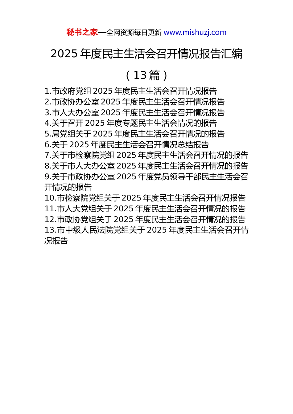 秘书之家—全网资源每日更新 www.mishuzj.com2025 年度民主生活会召开情况报告汇编(13 篇)1.市政府党组 2025 年度民主生活会召开情况报告2.市政协办公室 2025 年度民主生活会召开情况报告3.市人大办公室 2025 年度民主生活会召开情况报告4.关于召开 2025 年度专题民主生活会情况的报告5.局党组关于 2025 年度民主生活会召开情况的报告6.关于 2025 年度民主生活会召开情况总结报告7.关于市检察院党组 2025 年度民主生活会召开情况的报告8.关于市人大办公室 2025 年度民主生活会召开情况的报告9.关于市政协办公室 2025 年度党员领导干部民主生活会召开情况的报告10.市检察院党组关于 2025 年度民主生活会召开情况报告11.市人大党组关于 2025 年度民主生活会召开情况的报告12.市政协党组关于 2025 年度民主生活会召开情况的报告13.市中级人民法院党组关于 2025 年度民主生活会召开情况报告秘书之家—全网资源每日更新 www.mishuzj.com市政府党组 2025 年度民主生活会召开情况报告根据市委统一部署,市政府党组紧扣会议主题,严格遵循党内政治生活要求,扎实做好各项筹备工作,于 2026年 X 月 X 日召开 2025 年度民主生活会。会议深入学习贯彻习近平新时代中国特色社会主义思想和党的二十届四中全会精神,聚焦锲而不舍落实中央八项规定精神、推进作风建设常态化长效化,严肃开展批评与自我批评,达到了统一思想、凝聚共识、增进团结、推动工作的目的。现将会议召开情况报告如下:一、精耕细作抓筹备,筑牢会议思想根基市政府党组始终把高质量开好民主生活会作为重要政治任务,坚持早谋划、细部署、严落实,从思想、方案、问题、材料四个维度扎实推进会前准备,为会议召开奠定坚实基础。(一)深化理论武装,凝聚思想共识1.坚持领学导学强根基。始终把强化理论学习作为首要任务,党组书记履行第一责任人职责,带头领学习近平新时代中国特色社会主义思想、党的二十届四中全会公报秘书之家—全网资源每日更新 www.mishuzj.com及习近平总书记关于作风建设的重要指示精神,带动党组成员深刻领悟“两个确立”的决定性意义,增强“四个意识”、坚定“四个自信”、做到“两个维护”。通过党组理论学习中心组学习、专题研讨交流会等形式,系统学习中央八项规定及其实施细则精神,巩固拓展党纪学习教育成果,切实把思想和行动统一到党中央决策部署上来。2.注重联系实际深思考。紧扣市政府党组工作职能,把理论学习与推动高质量发展、破解民生难题、防范化解风险等重点工作结合起来,党组成员结合分管领域实际谈认识、讲体会、找差距,避免理论学习与实际工作“两张皮”。围绕“十五五”开局目标,深入思考作风建设对推动政府工作的保障作用,切实把学习成果转化为解决问题、推动工作的实际能力。3.强化全员覆盖求实效。制定详细学习计划,明确学习内容、时间节点和责任分工,通过个人自学、集中研学、辅导导学相结合的方式,确保学习覆盖到每位党组成员。组织观看作风建设典型案例警示教育片,通报违反中央八项规定精神典型案例,引导党组成员知敬畏、存戒惧、守底线,以理论清醒保证政治坚定。(二)精准谋划部署,压实工作责任1.健全工作机制明职责。成立由党组书记任组长的民主生活会筹备工作领导小组,明确办公室牵头协调、各相关科室分工配合的工作机制,细化任务清单、责任清单和时限清单,确保各项筹备工作有序推进。党组书记亲自审定会议方案、主持起草班子对照检查材料,定期听取筹备工作进展情况汇报,及时解决筹备过程中存在的问题。2.严格对标要求定方案。对照市委关于民主生活会的工作要求,结合市政府党组实际,精准制定会议方案,明确会议主题、时间地点、参会人员、议程安排和工作要求,确保会议流程规范、内容扎实。方案突出问题导向和目标导向,明确要求聚焦作风建设,深入查摆问题,严肃秘书之家—全网资源每日更新 www.mishuzj.com开展批评与自我批评,切实增强会议的针对性和实效性。3.加强沟通对接保质量。主动与市纪委监委、市委组织部等部门沟通对接,及时汇报筹备工作进展,主动征求指导意见,严格按照要求完善会议流程和相...