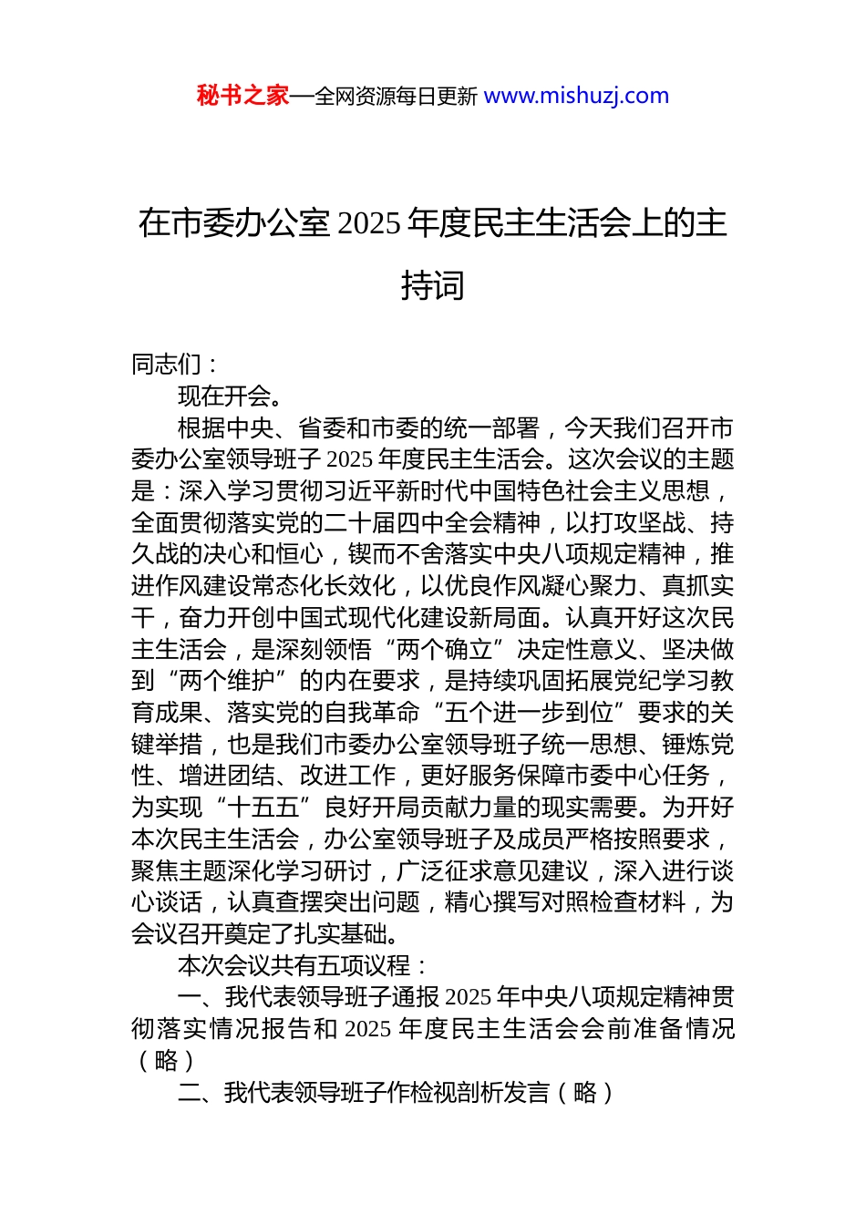秘书之家—全网资源每日更新 www.mishuzj.com2025 年度民主生活会主持词汇编 12 篇(含表态发言)1.在市委办公室 2025 年度民主生活会上的主持词2.县局党组书记在 2025 年度民主生活会上的主持讲话3.在领导班子 2025 年度民主生活会上的主持词4.在市检察院领导班子 2025 年度民主生活会上的主持词5.在市委政法委领导班子 2025 年度民主生活会上的主持词6.在大学 2025 年度党委领导班子民主生活会意见征求座谈会上的主持词7.市委编办领导班子 2025 年度民主生活会主持词(含表态发言)8.市委编办领导班子 2025 年度民主生活会主持词9.市委直属机关工委领导班子 2025 年度民主生活会主持词10.在市委政研室领导班子 2025 年度民主生活会上的主持词(含表态发言)11.在市委政研室领导班子 2025 年度民主生活会上的主持词12.在市委直属机关工委领导班子 2025 年度民主生活会上的主持词(含表态发言)秘书之家—全网资源每日更新 www.mishuzj.com在市委办公室 2025 年度民主生活会上的主持词同志们:现在开会。根据中央、省委和市委的统一部署,今天我们召开市委办公室领导班子 2025 年度民主生活会。这次会议的主题是:深入学习贯彻习近平新时代中国特色社会主义思想,全面贯彻落实党的二十届四中全会精神,以打攻坚战、持久战的决心和恒心,锲而不舍落实中央八项规定精神,推进作风建设常态化长效化,以优良作风凝心聚力、真抓实干,奋力开创中国式现代化建设新局面。认真开好这次民主生活会,是深刻领悟“两个确立”决定性意义、坚决做到“两个维护”的内在要求,是持续巩固拓展党纪学习教育成果、落实党的自我革命“五个进一步到位”要求的关键举措,也是我们市委办公室领导班子统一思想、锤炼党性、增进团结、改进工作,更好服务保障市委中心任务,为实现“十五五”良好开局贡献力量的现实需要。为开好本次民主生活会,办公室领导班子及成员严格按照要求,聚焦主题深化学习研讨,广泛征求意见建议,深入进行谈心谈话,认真查摆突出问题,精心撰写对照检查材料,为会议召开奠定了扎实基础。本次会议共有五项议程:一、我代表领导班子通报 2025 年中央八项规定精神贯彻落实情况报告和 2025 年度民主生活会会前准备情况(略)二、我代表领导班子作检视剖析发言(略)秘书之家—全网资源每日更新 www.mishuzj.com三、各班子成员进行个人对照检查发言,并接受其他同志的批评四、**同志(督导组组长)进行点评讲话(略)下面,由我代表市委办公室领导班子作表态讲话。一、牢记首要首责,持续强化理论武装,在提升政治“三力”上走在前作表率习近平总书记深刻指出,“政治上的坚定源于理论上的清醒”。市委办公室作为政治机关、中枢机构,必须把理论学习作为终身课题常抓不懈。针对查摆出的理论学习系统性、转化力有待加强的问题,我们将坚持把学习贯彻党的创新理论作为重中之重。领导班子成员要带头深入学习党的二十大及二十届历次全会精神,特别是关于发展新质生产力、推动高质量发展的战略部署,及时跟进学习领会党中央最新的政策精神和省委、市委工作要求,深刻把握其核心要义、精神实质和实践要求。我们要健全完善“第一议题”制度与常态化学习研讨机制相结合的学习体系,在完整准确全面理解上下功夫,在“深化、内化、转化”上求实效,不断提升政治判断力、政治领悟力、政治执行力。我们将自觉把办公室工作放在党和国家事业发展全局中、放在全市中心工作中去思考、定位、摆布,确保市委各项决策部署在“最初一公里”就得到精准理解和高效落实,切实把学习成果转化为谋划工作的思路、推动落实的举措和“三服务”工作的实际成效,确保政治方向不偏、政治立场不移。二、聚焦中心大局,全力提升服务效能,在狠抓贯彻落实上走在前作表率办公室工作的价值体现在服务大局的成效上。对照查摆出的参谋辅政前瞻性、督查督办穿透力、综合协调系统性有待提升等问题,我们将紧紧围绕贯彻落实党的二十届四中全会关于推进中国式现代化的战略部署,紧扣市委2025 年确定的重点工作任务,特别是关于全面深化改革、秘书之家—全网资源每日更新 www.mishuzj.com...