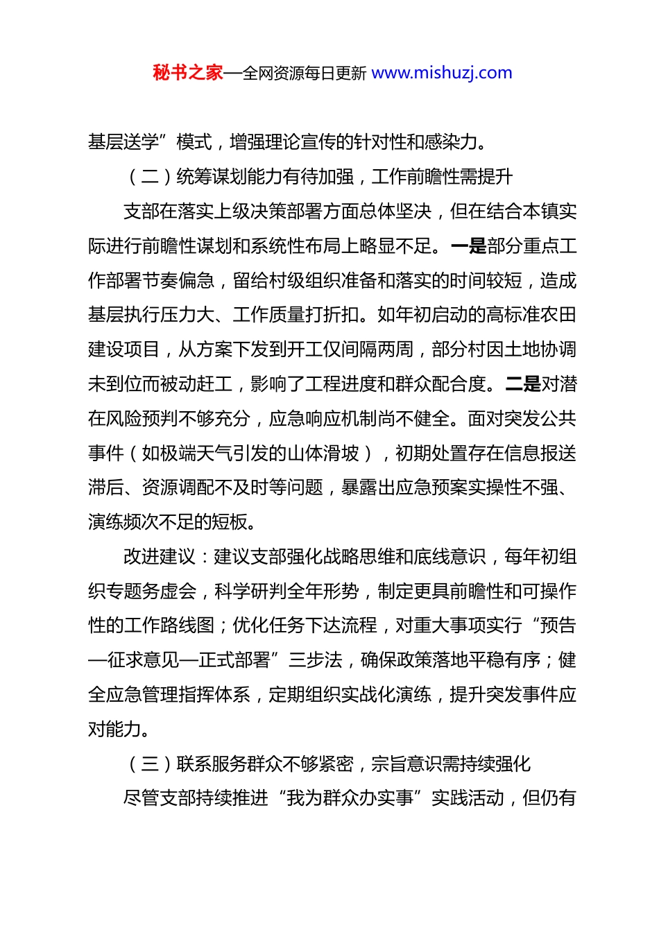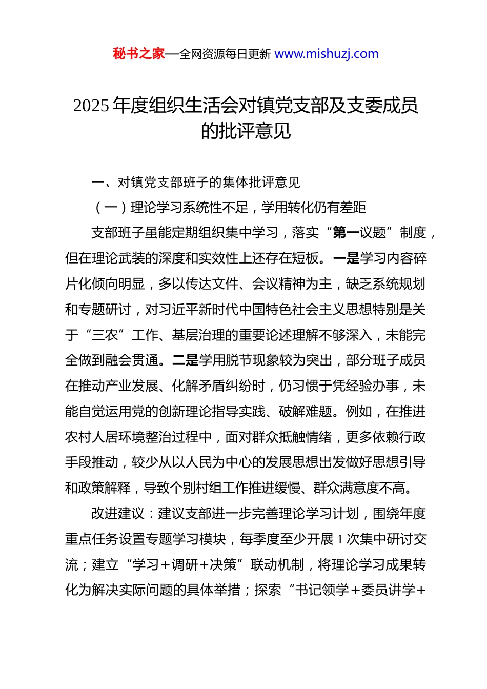 秘书之家—全网资源每日更新 www.mishuzj.com2025 年度组织生活会对镇党支部及支委成员的批评意见 一、对镇党支部班子的集体批评意见(一)理论学习系统性不足,学用转化仍有差距支部班子虽能定期组织集中学习,落实“第一议题”制度,但在理论武装的深度和实效性上还存在短板。一是学习内容碎片化倾向明显,多以传达文件、会议精神为主,缺乏系统规划和专题研讨,对习近平新时代中国特色社会主义思想特别是关于“三农”工作、基层治理的重要论述理解不够深入,未能完全做到融会贯通。二是学用脱节现象较为突出,部分班子成员在推动产业发展、化解矛盾纠纷时,仍习惯于凭经验办事,未能自觉运用党的创新理论指导实践、破解难题。例如,在推进农村人居环境整治过程中,面对群众抵触情绪,更多依赖行政手段推动,较少从以人民为中心的发展思想出发做好思想引导和政策解释,导致个别村组工作推进缓慢、群众满意度不高。改进建议:建议支部进一步完善理论学习计划,围绕年度重点任务设置专题学习模块,每季度至少开展 1 次集中研讨交流;建立“学习+调研+决策”联动机制,将理论学习成果转化为解决实际问题的具体举措;探索“书记领学+委员讲学+秘书之家—全网资源每日更新 www.mishuzj.com基层送学”模式,增强理论宣传的针对性和感染力。(二)统筹谋划能力有待加强,工作前瞻性需提升支部在落实上级决策部署方面总体坚决,但在结合本镇实际进行前瞻性谋划和系统性布局上略显不足。一是部分重点工作部署节奏偏急,留给村级组织准备和落实的时间较短,造成基层执行压力大、工作质量打折扣。如年初启动的高标准农田建设项目,从方案下发到开工仅间隔两周,部分村因土地协调未到位而被动赶工,影响了工程进度和群众配合度。二是对潜在风险预判不够充分,应急响应机制尚不健全。面对突发公共事件(如极端天气引发的山体滑坡),初期处置存在信息报送滞后、资源调配不及时等问题,暴露出应急预案实操性不强、演练频次不足的短板。改进建议:建议支部强化战略思维和底线意识,每年初组织专题务虚会,科学研判全年形势,制定更具前瞻性和可操作性的工作路线图;优化任务下达流程,对重大事项实行“预告—征求意见—正式部署”三步法,确保政策落地平稳有序;健全应急管理指挥体系,定期组织实战化演练,提升突发事件应对能力。(三)联系服务群众不够紧密,宗旨意识需持续强化尽管支部持续推进“我为群众办实事”实践活动,但仍有秘书之家—全网资源每日更新 www.mishuzj.com个别领域回应群众关切不够及时。一是下沉调研走形式现象依然存在,部分班子成员下村入户多以听取汇报为主,真正走进田间地头、坐到农家炕头倾听民声较少,对困难群众的实际需求掌握不全面。二是对群众反映强烈的“老大难”问题攻坚力度不足。如 X 村多年存在的饮水安全问题,虽已列入改造计划,但因资金筹措缓慢、施工组织不力,至今仍未彻底解决,群众反映强烈。三是便民服务渠道有待拓宽,线上服务平台使用率低,老年群体办事仍面临“数字鸿沟”。改进建议:建议严格落实班子成员包村联户制度,每月至少开展 1 次入户走访,建立民情台账并动态更新;设立“民生难题攻坚专班”,由支部书记牵头,限期推动历史遗留问题化解;推广“帮办代办”服务模式,在各村党群服务中心配备专职代办员,切实打通服务群众“最后一米”。(四)队伍建设抓而不实,干部培养机制需完善支部在干部管理上总体严格,但在激发队伍活力、促进能力提升方面仍有薄弱环节。一是年轻干部培养路径不清晰,缺乏系统性的成长规划,部分青年同志感到晋升通道狭窄、发展空间受限,工作积极性受到影响。二是在干部考核评价上重结果轻过程,日常表现记录不完整,年终评议易流于“老好人”现象,未能充分发挥激励约束作用。三是谈心谈话制度落实不秘书之家—全网资源每日更新 www.mishuzj.com到位,班子成员之间、上下级之间的思想交流不多,对干部的思想动态和心理状态关注不够,个别同志出现职业倦怠苗头未能及时疏导。改进建议:建议制定《镇村干部成长三年行动计划》,明确培养方向和阶段性目标;推行“积分制”管理,将日常工作表现、...