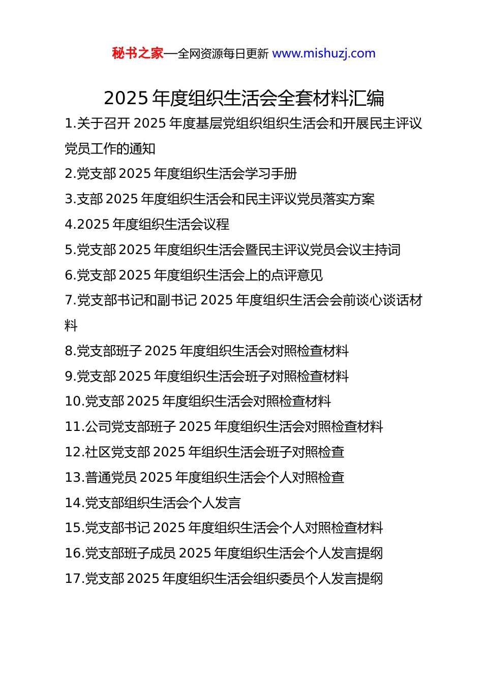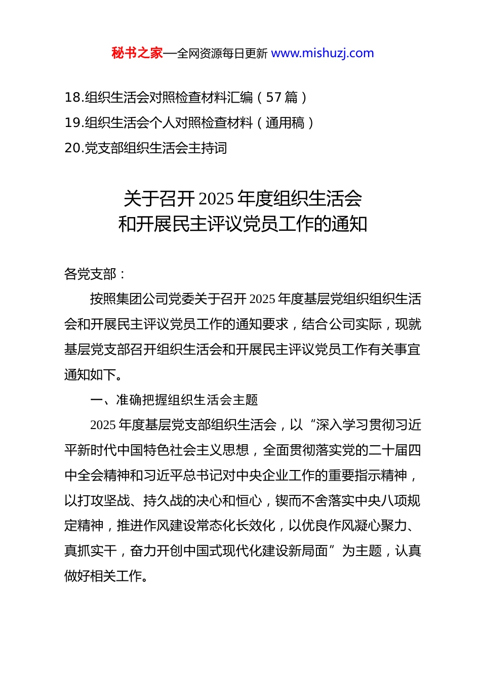 秘书之家—全网资源每日更新 www.mishuzj.com2025 年度组织生活会全套材料汇编1.关于召开 2025 年度基层党组织组织生活会和开展民主评议党员工作的通知2.党支部 2025 年度组织生活会学习手册3.支部 2025 年度组织生活会和民主评议党员落实方案4.2025 年度组织生活会议程5.党支部 2025 年度组织生活会暨民主评议党员会议主持词6.党支部 2025 年度组织生活会上的点评意见7.党支部书记和副书记 2025 年度组织生活会会前谈心谈话材料8.党支部班子 2025 年度组织生活会对照检查材料9.党支部 2025 年度组织生活会班子对照检查材料10.党支部 2025 年度组织生活会对照检查材料11.公司党支部班子 2025 年度组织生活会对照检查材料12.社区党支部 2025 年组织生活会班子对照检查13.普通党员 2025 年度组织生活会个人对照检查14.党支部组织生活会个人发言15.党支部书记 2025 年度组织生活会个人对照检查材料16.党支部班子成员 2025 年度组织生活会个人发言提纲17.党支部 2025 年度组织生活会组织委员个人发言提纲秘书之家—全网资源每日更新 www.mishuzj.com18.组织生活会对照检查材料汇编(57 篇)19.组织生活会个人对照检查材料(通用稿)20.党支部组织生活会主持词关于召开 2025 年度组织生活会和开展民主评议党员工作的通知各党支部:按照集团公司党委关于召开 2025 年度基层党组织组织生活会和开展民主评议党员工作的通知要求,结合公司实际,现就基层党支部召开组织生活会和开展民主评议党员工作有关事宜通知如下。一、准确把握组织生活会主题2025 年度基层党支部组织生活会,以“深入学习贯彻习近平新时代中国特色社会主义思想,全面贯彻落实党的二十届四中全会精神和习近平总书记对中央企业工作的重要指示精神,以打攻坚战、持久战的决心和恒心,锲而不舍落实中央八项规定精神,推进作风建设常态化长效化,以优良作风凝心聚力、真抓实干,奋力开创中国式现代化建设新局面”为主题,认真做好相关工作。秘书之家—全网资源每日更新 www.mishuzj.com二、认真抓好重点环节和内容落实召开组织生活会和开展民主评议党员以党支部为单位,两项工作可一并进行,重点做好以下五个环节的工作落实。(一)组织集中学习,打牢思想基础在集中学习和党员自学基础上,党支部要集中组织党员进行一次专题学习研讨,为开好组织生活会、做好民主评议党员工作打牢思想基础。学习内容包括但不限于:习近平总书记关于党的建设的重要思想、关于党的自我革命的重要思想以及关于全面加强党的纪律建设、作风建设的重要论述;习近平总书记对中央企业工作作出的重要指示,关于国资央企、科技创新、能源行业等的重要讲话和重要指示批示精神,特别是在全国国有企业党的建设工作会议上的重要讲话、“2·26”重要批示、“11·6”重要指示精神;党章、《中共中央关于制定国民经济和社会发展第十五个五年规划的建议》、中央八项规定及其实施细则精神和《中国共产党支部工作条例(试行)》等党内法规。通过集中学习,深刻认识作风建设的重要性紧迫性,深刻认识加强党的作风建设对于保持党的先进性纯洁性、巩固党的长期执政根基的重要意义,对于增强党的政治领导力、思想引领力、群众组织力、社会号召力,奋力开创中国式现代化建设新局面的重大意义,进一步增强转作风树新风的政治自觉、思想自觉、秘书之家—全网资源每日更新 www.mishuzj.com行动自觉。对如因特殊情况不能参加集中学习的党员,各党支部要向他们传达相关学习要求,提供必要的学习材料,做到学习全覆盖。(二)深入查摆问题,开展谈心谈话党支部委员会要对照党章、《中国共产党支部工作条例(试行)》《中国共产党国有企业基层组织工作条例(试行)》等规定的职责任务,对照落实上级党组织部署要求,对照深入贯彻中央八项规定精神学习教育、巡视巡察以及上年度组织生活会等问题整改情况,对照职工群众的新期待,全面查找在加强理论武装、执行上级党组织决定、严格组织生活、加强党员管理监督、做好群众工作、抓好自身建设等方面的问题和不足。党员主要对照党中央和习近平总书记的重要讲话,对照新时代合格党员标准...