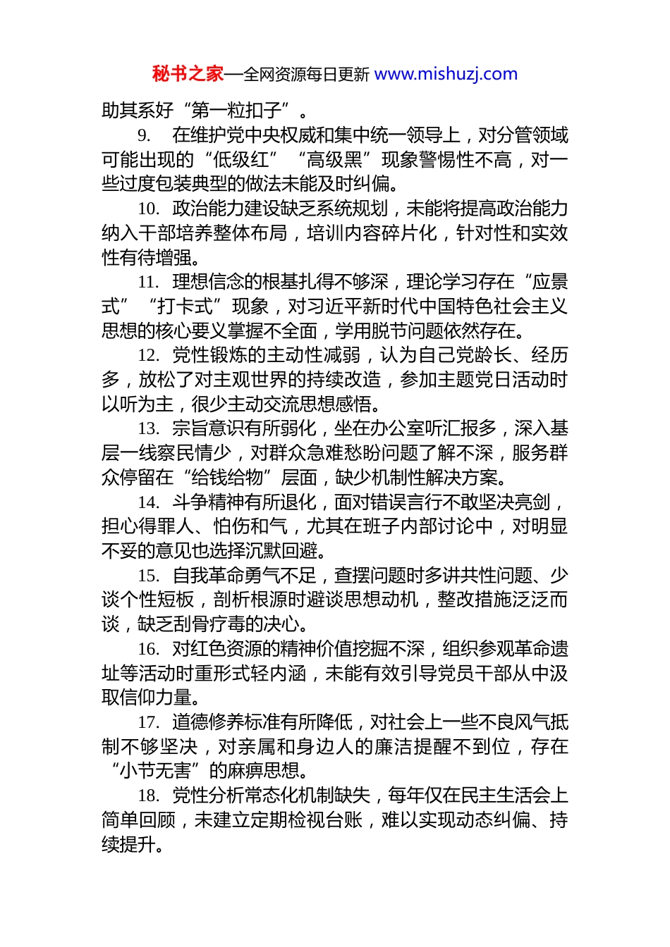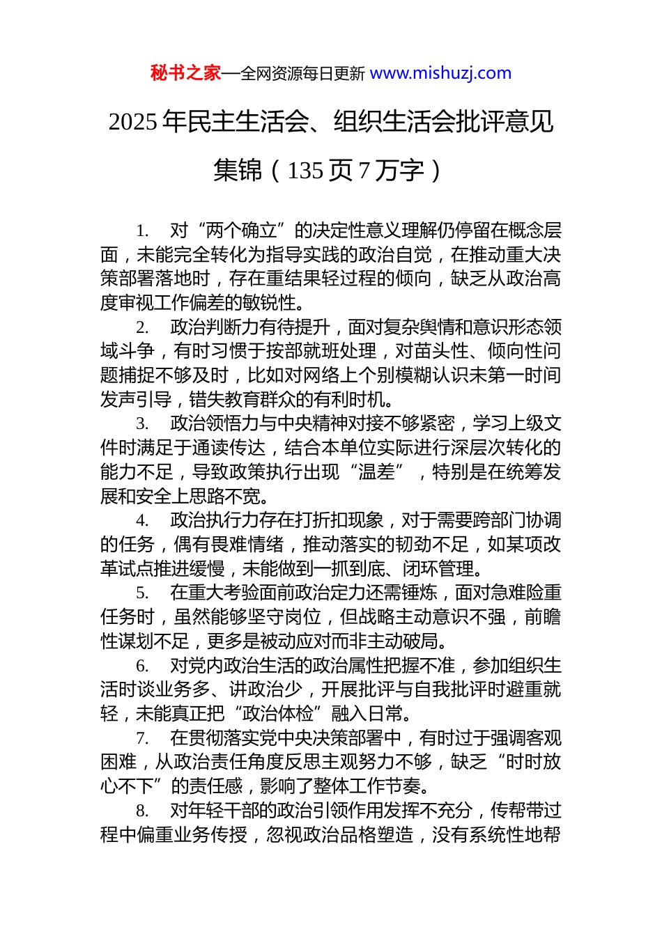 秘书之家—全网资源每日更新 www.mishuzj.com2025 年民主生活会、组织生活会批评意见集锦(135 页 7 万字)1.对“两个确立”的决定性意义理解仍停留在概念层面,未能完全转化为指导实践的政治自觉,在推动重大决策部署落地时,存在重结果轻过程的倾向,缺乏从政治高度审视工作偏差的敏锐性。2.政治判断力有待提升,面对复杂舆情和意识形态领域斗争,有时习惯于按部就班处理,对苗头性、倾向性问题捕捉不够及时,比如对网络上个别模糊认识未第一时间发声引导,错失教育群众的有利时机。3.政治领悟力与中央精神对接不够紧密,学习上级文件时满足于通读传达,结合本单位实际进行深层次转化的能力不足,导致政策执行出现“温差”,特别是在统筹发展和安全上思路不宽。4.政治执行力存在打折扣现象,对于需要跨部门协调的任务,偶有畏难情绪,推动落实的韧劲不足,如某项改革试点推进缓慢,未能做到一抓到底、闭环管理。5.在重大考验面前政治定力还需锤炼,面对急难险重任务时,虽然能够坚守岗位,但战略主动意识不强,前瞻性谋划不足,更多是被动应对而非主动破局。6.对党内政治生活的政治属性把握不准,参加组织生活时谈业务多、讲政治少,开展批评与自我批评时避重就轻,未能真正把“政治体检”融入日常。7.在贯彻落实党中央决策部署中,有时过于强调客观困难,从政治责任角度反思主观努力不够,缺乏“时时放心不下”的责任感,影响了整体工作节奏。8.对年轻干部的政治引领作用发挥不充分,传帮带过程中偏重业务传授,忽视政治品格塑造,没有系统性地帮秘书之家—全网资源每日更新 www.mishuzj.com助其系好“第一粒扣子”。9.在维护党中央权威和集中统一领导上,对分管领域可能出现的“低级红”“高级黑”现象警惕性不高,对一些过度包装典型的做法未能及时纠偏。10. 政治能力建设缺乏系统规划,未能将提高政治能力纳入干部培养整体布局,培训内容碎片化,针对性和实效性有待增强。11. 理想信念的根基扎得不够深,理论学习存在“应景式”“打卡式”现象,对习近平新时代中国特色社会主义思想的核心要义掌握不全面,学用脱节问题依然存在。12. 党性锻炼的主动性减弱,认为自己党龄长、经历多,放松了对主观世界的持续改造,参加主题党日活动时以听为主,很少主动交流思想感悟。13. 宗旨意识有所弱化,坐在办公室听汇报多,深入基层一线察民情少,对群众急难愁盼问题了解不深,服务群众停留在“给钱给物”层面,缺少机制性解决方案。14. 斗争精神有所退化,面对错误言行不敢坚决亮剑,担心得罪人、怕伤和气,尤其在班子内部讨论中,对明显不妥的意见也选择沉默回避。15. 自我革命勇气不足,查摆问题时多讲共性问题、少谈个性短板,剖析根源时避谈思想动机,整改措施泛泛而谈,缺乏刮骨疗毒的决心。16. 对红色资源的精神价值挖掘不深,组织参观革命遗址等活动时重形式轻内涵,未能有效引导党员干部从中汲取信仰力量。17. 道德修养标准有所降低,对社会上一些不良风气抵制不够坚决,对亲属和身边人的廉洁提醒不到位,存在“小节无害”的麻痹思想。18. 党性分析常态化机制缺失,每年仅在民主生活会上简单回顾,未建立定期检视台账,难以实现动态纠偏、持续提升。秘书之家—全网资源每日更新 www.mishuzj.com19. 在重大利益考验面前,偶尔流露出个人得失计较心态,未能始终以党和人民事业为重,影响了示范表率作用的发挥。20. 对马克思主义基本原理的学习浮于表面,运用辩证唯物主义和历史唯物主义分析问题的能力不强,导致决策时视野不宽、站位不高。21. 群众立场出现轻微偏移,制定政策时听取专家意见多、征求群众意见少,有的惠民项目因前期调研不充分导致使用率偏低,造成资源浪费。22. 组织观念有待强化,个别事项未严格履行请示报告制度,认为小事不必上报,存在“先斩后奏”现象,削弱了组织纪律的刚性约束。23. 对民主集中制执行不到位,在班子议事中有时主导过多,听取不同意见不够耐心,影响了集体智慧的充分发挥。24. 对法纪底线的敬畏感需进一步增强,虽然自身能做到清正廉洁,但对分管领域廉政风险点排查不细,防控措施针对性不强。25. 在对待群众诉求...