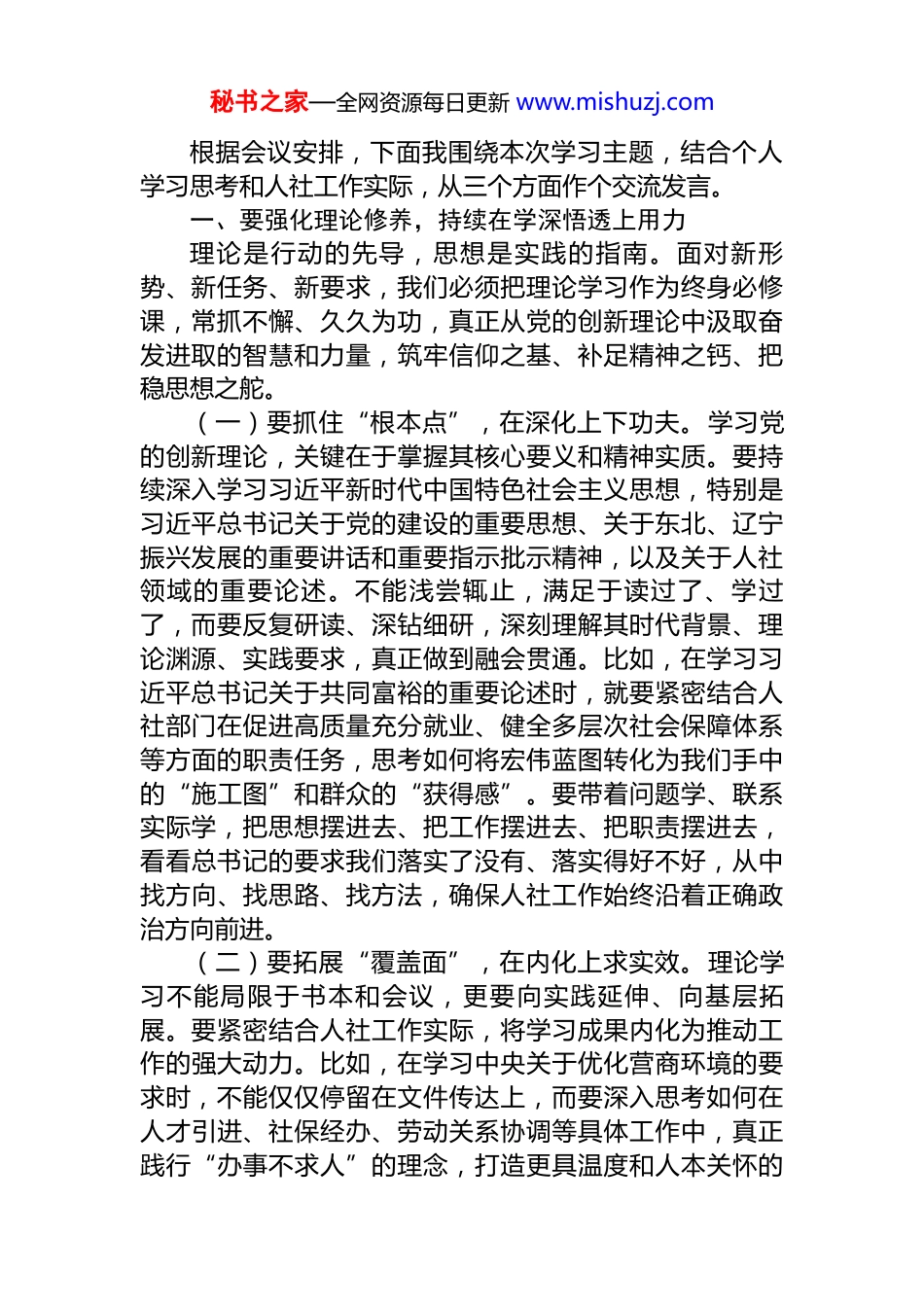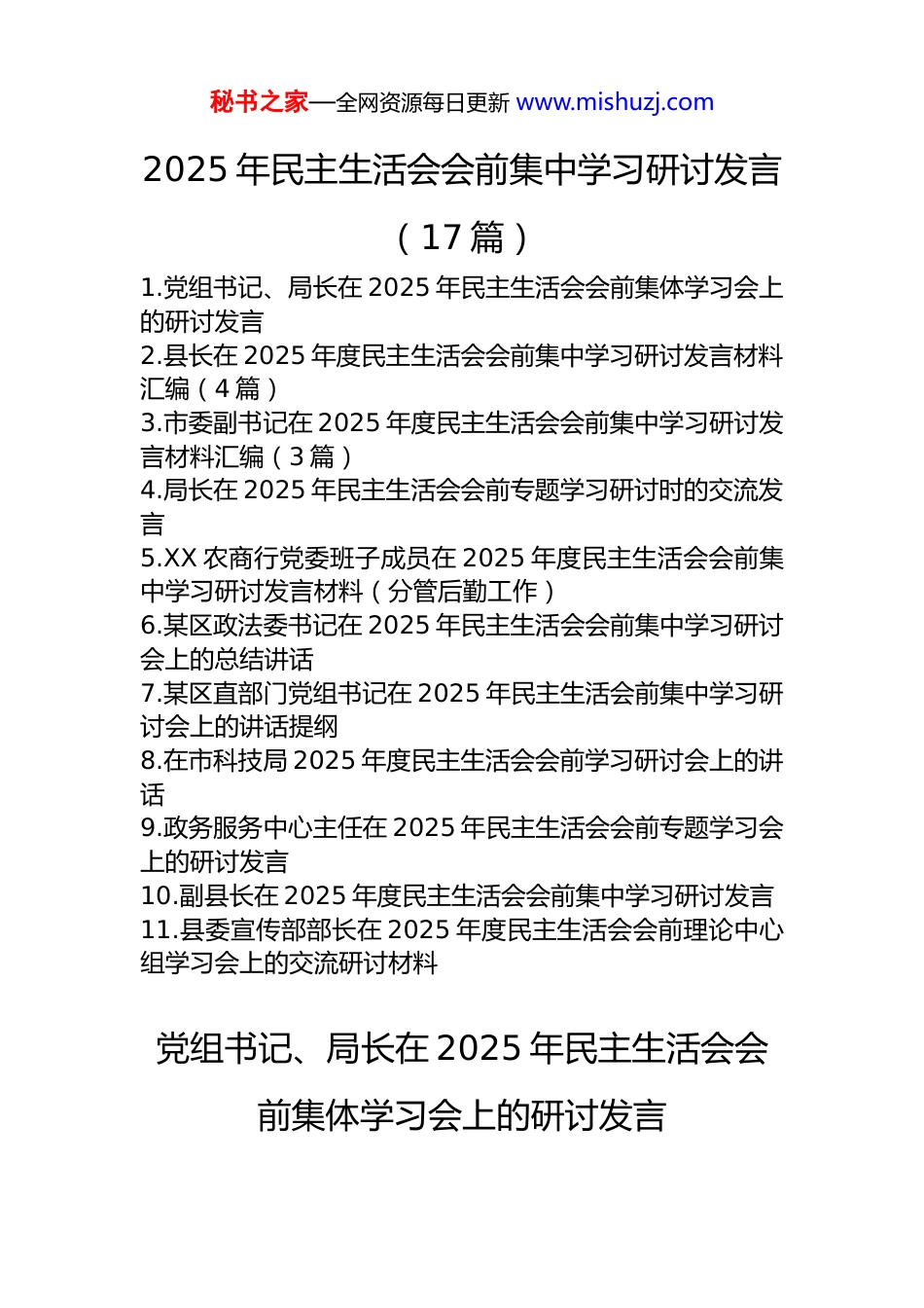 秘书之家—全网资源每日更新 www.mishuzj.com2025 年民主生活会会前集中学习研讨发言(17 篇)1.党组书记、局长在 2025 年民主生活会会前集体学习会上的研讨发言2.县长在 2025 年度民主生活会会前集中学习研讨发言材料汇编(4 篇)3.市委副书记在 2025 年度民主生活会会前集中学习研讨发言材料汇编(3 篇)4.局长在 2025 年民主生活会会前专题学习研讨时的交流发言5.XX 农商行党委班子成员在 2025 年度民主生活会会前集中学习研讨发言材料(分管后勤工作)6.某区政法委书记在 2025 年民主生活会会前集中学习研讨会上的总结讲话7.某区直部门党组书记在 2025 年民主生活会前集中学习研讨会上的讲话提纲8.在市科技局 2025 年度民主生活会会前学习研讨会上的讲话9.政务服务中心主任在 2025 年民主生活会会前专题学习会上的研讨发言10.副县长在 2025 年度民主生活会会前集中学习研讨发言11.县委宣传部部长在 2025 年度民主生活会会前理论中心组学习会上的交流研讨材料党组书记、局长在 2025 年民主生活会会前集体学习会上的研讨发言秘书之家—全网资源每日更新 www.mishuzj.com根据会议安排,下面我围绕本次学习主题,结合个人学习思考和人社工作实际,从三个方面作个交流发言。一、要强化理论修养,持续在学深悟透上用力理论是行动的先导,思想是实践的指南。面对新形势、新任务、新要求,我们必须把理论学习作为终身必修课,常抓不懈、久久为功,真正从党的创新理论中汲取奋发进取的智慧和力量,筑牢信仰之基、补足精神之钙、把稳思想之舵。(一)要抓住“根本点”,在深化上下功夫。学习党的创新理论,关键在于掌握其核心要义和精神实质。要持续深入学习习近平新时代中国特色社会主义思想,特别是习近平总书记关于党的建设的重要思想、关于东北、辽宁振兴发展的重要讲话和重要指示批示精神,以及关于人社领域的重要论述。不能浅尝辄止,满足于读过了、学过了,而要反复研读、深钻细研,深刻理解其时代背景、理论渊源、实践要求,真正做到融会贯通。比如,在学习习近平总书记关于共同富裕的重要论述时,就要紧密结合人社部门在促进高质量充分就业、健全多层次社会保障体系等方面的职责任务,思考如何将宏伟蓝图转化为我们手中的“施工图”和群众的“获得感”。要带着问题学、联系实际学,把思想摆进去、把工作摆进去、把职责摆进去,看看总书记的要求我们落实了没有、落实得好不好,从中找方向、找思路、找方法,确保人社工作始终沿着正确政治方向前进。(二)要拓展“覆盖面”,在内化上求实效。理论学习不能局限于书本和会议,更要向实践延伸、向基层拓展。要紧密结合人社工作实际,将学习成果内化为推动工作的强大动力。比如,在学习中央关于优化营商环境的要求时,不能仅仅停留在文件传达上,而要深入思考如何在人才引进、社保经办、劳动关系协调等具体工作中,真正践行“办事不求人”的理念,打造更具温度和人本关怀的秘书之家—全网资源每日更新 www.mishuzj.com人社服务品牌。要广泛涉猎经济、法律、社会管理等各方面知识,不断优化知识结构,拓宽工作视野,克服“本领恐慌”。要善于运用中心组学习、专题研讨、在线学习等多种形式,变“被动听”为“主动讲”,变“要我学”为“我要学”,营造浓厚的学习氛围。学习的目的全在于运用,要坚决防止学习和实践“两张皮”,努力把学习成果转化为谋划工作的思路、促进工作的举措、领导工作的能力。(三)要筑牢“思想体”,在转化上见真章。理论的威力,最终要通过实践来检验。学习成效如何,要看是否真正提升了政治判断力、政治领悟力、政治执行力,是否有效解决了实际问题。要自觉用党的创新理论改造主观世界,坚定理想信念,筑牢思想防线,始终保持共产党人的政治本色。要紧密联系当前人社领域面临的重点难点问题,例如,在推进“乐业 X 计划”中,如何更精准地匹配劳动力市场供需,如何更有效地支持新就业形态健康发展,如何应对人口老龄化对社会保障体系的挑战等,都需要我们从理论中寻找答案和方法。要通过深入学习,不断强化宗旨意识,牢记“人社工作为人民”的价值追求,始终把群众的急难...