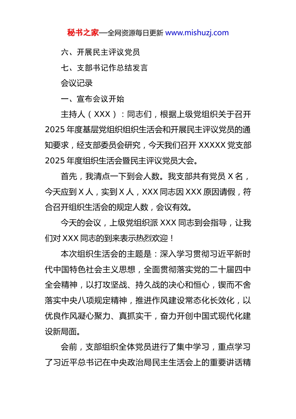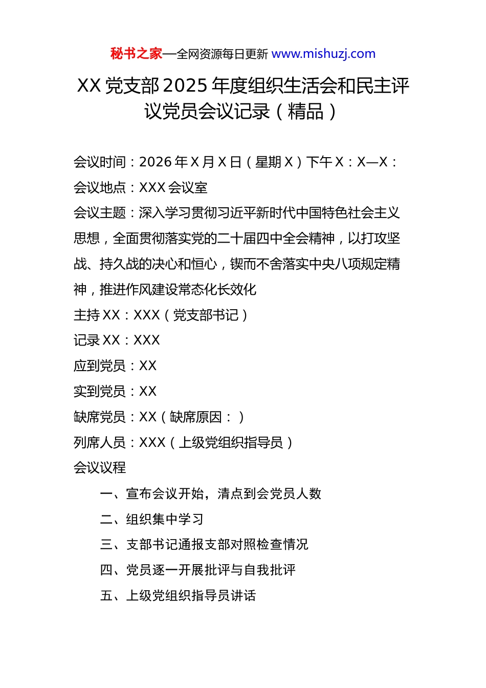 秘书之家—全网资源每日更新 www.mishuzj.comXX 党支部 2025 年度组织生活会和民主评议党员会议记录(精品)会议时间:2026 年 X 月 X 日(星期 X)下午 X:X—X:会议地点:XXX 会议室会议主题:深入学习贯彻习近平新时代中国特色社会主义思想,全面贯彻落实党的二十届四中全会精神,以打攻坚战、持久战的决心和恒心,锲而不舍落实中央八项规定精神,推进作风建设常态化长效化主持 XX:XXX(党支部书记)记录 XX:XXX应到党员:XX实到党员:XX缺席党员:XX(缺席原因:)列席人员:XXX(上级党组织指导员)会议议程一、宣布会议开始,清点到会党员人数二、组织集中学习三、支部书记通报支部对照检查情况四、党员逐一开展批评与自我批评五、上级党组织指导员讲话秘书之家—全网资源每日更新 www.mishuzj.com六、开展民主评议党员七、支部书记作总结发言会议记录一、宣布会议开始主持人(XXX):同志们,根据上级党组织关于召开2025 年度基层党组织组织生活会和开展民主评议党员的通知要求,经支部委员会研究,今天我们召开 XXXXX 党支部2025 年度组织生活会暨民主评议党员大会。首先,我清点一下到会人数。我支部共有党员 X 名,今天应到 X 人,实到 X 人,XXX 同志因 XXX 原因请假,符合召开组织生活会的规定人数,会议有效。今天的会议,上级党组织派 XXX 同志到会指导,让我们对 XXX 同志的到来表示热烈欢迎!本次组织生活会的主题是:深入学习贯彻习近平新时代中国特色社会主义思想,全面贯彻落实党的二十届四中全会精神,以打攻坚战、持久战的决心和恒心,锲而不舍落实中央八项规定精神,推进作风建设常态化长效化,以优良作风凝心聚力、真抓实干,奋力开创中国式现代化建设新局面。会前,支部组织全体党员进行了集中学习,重点学习了习近平总书记在中央政治局民主生活会上的重要讲话精秘书之家—全网资源每日更新 www.mishuzj.com神、党的二十届四中全会精神、习近平总书记关于党的建设的重要思想和关于党的自我革命的重要思想,以及中央八项规定及其实施细则精神等内容。支部委员之间、支委与党员之间、党员与党员之间普遍开展了谈心谈话,广泛征求了意见建议,深入查摆了问题。下面,按照会议议程逐项进行。二、组织集中学习主持人(XXX):下面进行第二项议程,组织集中学习。请 XXX 同志领学《中共中央办公厅关于锲而不舍落实中央八项规定精神推进作风建设常态化长效化的意见》。XXX 同志:(领学《意见》主要内容,约 10 分钟)......主持人(XXX):刚才 XXX 同志领学了《意见》的主要内容,希望大家在会后继续深入学习,把中央八项规定精神内化于心、外化于行,切实改进工作作风,做到知敬畏、存戒惧、守底线。三、支部书记通报支部对照检查情况主持人(XXX):下面进行第三项议程,由我代表支部委员会通报支部班子对照检查情况。按照组织生活会要求,支部委员会从加强理论武装、执行上级组织决定、严格组织生活、加强党员管理监督、秘书之家—全网资源每日更新 www.mishuzj.com做好群众工作、抓好自身建设等 6 个方面进行了深入对照检查,查摆出以下问题:(一)在加强理论武装方面存在的问题:一是政治理论学习存在“浅尝辄止”现象,对习近平新时代中国特色社会主义思想学习不够系统深入,存在以干代学、学用脱节的情况。二是学习形式较为单一,运用“学习强国”等现代化手段开展学习的频次较少。三是理论联系实际不够紧密,没有很好地把学习成果转化为推动工作的具体举措。(二)在执行上级组织决定方面存在的问题:一是贯彻落实上级决策部署有时存在打折扣、搞变通的现象。二是请示报告制度执行不够严格,个别同志存在先斩后奏的情况。三是工作标准不够高,存在就低不就高的思想。(三)在严格组织生活方面存在的问题:一是“三会一课”质量有待提升,会议议题不够聚焦,讨论不够深入。二是主题党日活动形式不够丰富,缺乏创新性和吸引力。三是批评与自我批评开展不够深入,存在“好人主义”倾向。(四)在加强党员管理监督方面存在的问题:一是党员日常教育管理存在薄弱环节,秘书之家—全网资源每日更新 www.mish...