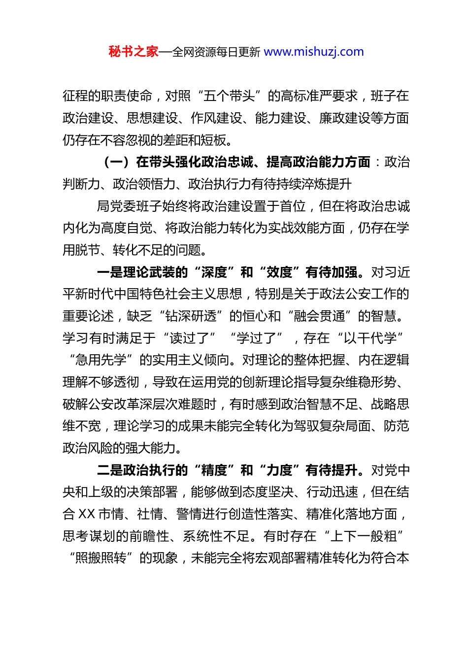 秘书之家—全网资源每日更新 www.mishuzj.comXX 市公安局党委班子 2025 年度民主生活会对照检查材料根据中央、省委、市委关于开好 2025 年度党员领导干部民主生活会的统一部署,以及上级公安机关党委的具体要求,XX 市公安局党委班子紧扣会议主题,坚持以习近平新时代中国特色社会主义思想为指导,在会前通过集中研讨、个人自学、专题辅导等方式,系统学习了党的二十大及历次全会精神、习近平总书记关于党的建设、党的自我革命、加强党的纪律建设和作风建设的重要论述,深刻领会“五个带头”的核心要义。同时,局党委班子通过多种渠道广泛征求了意见建议,班子成员之间深入开展了谈心谈话,沟通了思想,交换了意见。在此基础上,局党委班子严格对照“带头强化政治忠诚、提高政治能力,带头固本培元、增强党性,带头敬畏人民、敬畏组织、敬畏法纪,带头干事创业、担当作为,带头坚决扛起管党治党责任”等五个方面要求,紧密结合公安工作实际,深入查摆存在的突出问题,深刻剖析问题产生的根源,并认真研究制定了整改措施。现将对照检查情况报告如下:一、对照“五个带头”查摆出的主要问题过去一年,局党委班子在市委、市政府和省公安厅党委的坚强领导下,团结带领全市公安机关忠诚履职,在维护安全稳定、服务发展大局等方面取得了一定成效。但对照新时代新秘书之家—全网资源每日更新 www.mishuzj.com征程的职责使命,对照“五个带头”的高标准严要求,班子在政治建设、思想建设、作风建设、能力建设、廉政建设等方面仍存在不容忽视的差距和短板。(一)在带头强化政治忠诚、提高政治能力方面:政治判断力、政治领悟力、政治执行力有待持续淬炼提升局党委班子始终将政治建设置于首位,但在将政治忠诚内化为高度自觉、将政治能力转化为实战效能方面,仍存在学用脱节、转化不足的问题。一是理论武装的“深度”和“效度”有待加强。对习近平新时代中国特色社会主义思想,特别是关于政法公安工作的重要论述,缺乏“钻深研透”的恒心和“融会贯通”的智慧。学习有时满足于“读过了”“学过了”,存在“以干代学”“急用先学”的实用主义倾向。对理论的整体把握、内在逻辑理解不够透彻,导致在运用党的创新理论指导复杂维稳形势、破解公安改革深层次难题时,有时感到政治智慧不足、战略思维不宽,理论学习的成果未能完全转化为驾驭复杂局面、防范政治风险的强大能力。二是政治执行的“精度”和“力度”有待提升。对党中央和上级的决策部署,能够做到态度坚决、行动迅速,但在结合 XX 市情、社情、警情进行创造性落实、精准化落地方面,思考谋划的前瞻性、系统性不足。有时存在“上下一般粗”“照搬照转”的现象,未能完全将宏观部署精准转化为符合本秘书之家—全网资源每日更新 www.mishuzj.com地实际的“施工图”。在将“政治效果、社会效果、法律效果相统一”的要求贯穿执法办案全过程方面,精细化、常态化程度不够,存在机械执行或简单化处理的倾向。三是政治敏锐的“锐度”和“速度”有待淬炼。对社会面动态、网络舆情、敏感事件中可能隐含的政治风险、稳定隐患,有时见事不够早、洞察不够深、鉴别不够准。在全媒体时代,对涉警涉稳舆情背后可能存在的深层次动向,缺乏足够的预判能力和精准的鉴别能力。在常态下对“灰犀牛”“黑天鹅”事件的预警预防,政治神经绷得不够紧,风险感知的灵敏度有待提高。四是战略定力的“硬度”和“恒度”有待巩固。面对长期存在的治安顽疾、信访难题和公安改革瓶颈,个别同志偶尔会产生畏难情绪或“歇歇脚”的想法。攻坚克难的锐气和“钉钉子”精神在持续性和坚韧性上有所不足,未能时时处处展现出“功成不必在我、功成必定有我”的政治担当。(二)在带头固本培元、增强党性方面:党性修养的自觉性、严肃性有待持续增强局党委班子注重加强党性锻炼,但对照党章党规党纪的标尺,在党性锤炼的主动性、彻底性和融入日常的自觉性上,仍需下更大功夫。一是党性锤炼的“主动性”和“经常性”不足。将加强党性修养作为终身课题的意识树得不够牢固,未能完全做到时秘书之家—全网资源每日更新 www.mishuzj.com时处处以党性原则检视言行、修正偏差...