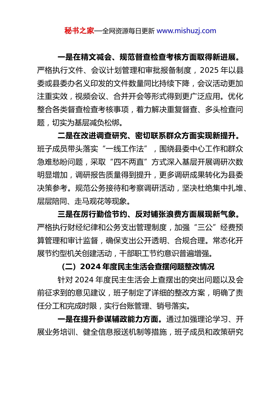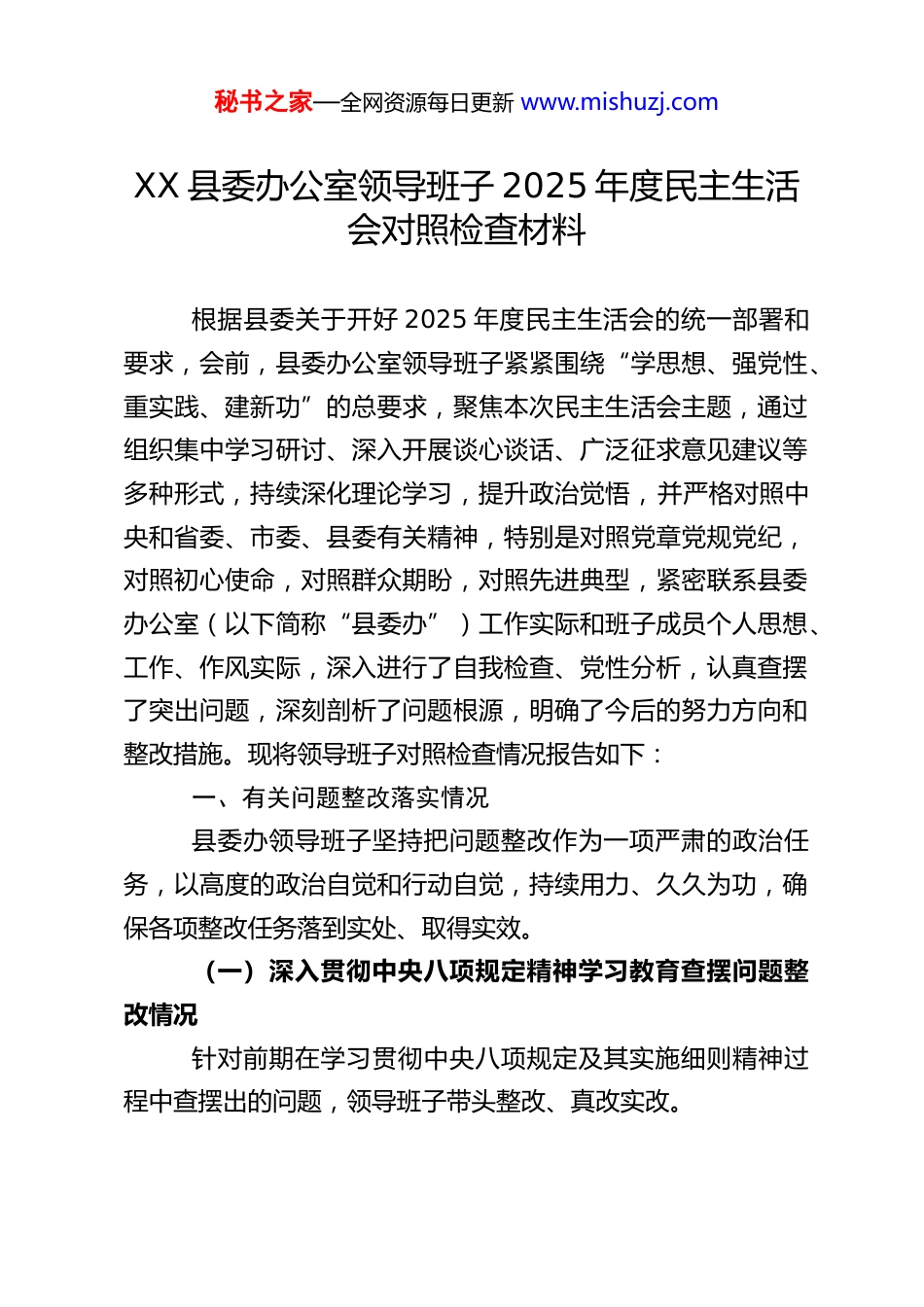 秘书之家—全网资源每日更新 www.mishuzj.comXX 县委办公室领导班子 2025 年度民主生活会对照检查材料根据县委关于开好 2025 年度民主生活会的统一部署和要求,会前,县委办公室领导班子紧紧围绕“学思想、强党性、重实践、建新功”的总要求,聚焦本次民主生活会主题,通过组织集中学习研讨、深入开展谈心谈话、广泛征求意见建议等多种形式,持续深化理论学习,提升政治觉悟,并严格对照中央和省委、市委、县委有关精神,特别是对照党章党规党纪,对照初心使命,对照群众期盼,对照先进典型,紧密联系县委办公室(以下简称“县委办”)工作实际和班子成员个人思想、工作、作风实际,深入进行了自我检查、党性分析,认真查摆了突出问题,深刻剖析了问题根源,明确了今后的努力方向和整改措施。现将领导班子对照检查情况报告如下:一、有关问题整改落实情况县委办领导班子坚持把问题整改作为一项严肃的政治任务,以高度的政治自觉和行动自觉,持续用力、久久为功,确保各项整改任务落到实处、取得实效。(一)深入贯彻中央八项规定精神学习教育查摆问题整改情况针对前期在学习贯彻中央八项规定及其实施细则精神过程中查摆出的问题,领导班子带头整改、真改实改。秘书之家—全网资源每日更新 www.mishuzj.com一是在精文减会、规范督查检查考核方面取得新进展。严格执行文件、会议计划管理和审批报备制度,2025 年以县委或县委办名义印发的文件数量同比持续下降,会议活动更加注重实效,视频会议、合并开会等形式得到更广泛应用。优化整合各类督查检查考核事项,着力解决重复督查、多头检查问题,切实为基层减负松绑。二是在改进调查研究、密切联系群众方面实现新提升。班子成员带头落实“一线工作法”,围绕县委中心工作和群众急难愁盼问题,采取“四不两直”方式深入基层开展调研次数明显增加,调研报告质量得到提升,更多调研成果转化为县委决策参考。规范公务接待和考察调研活动,坚决杜绝集中扎堆、层层陪同、走马观花等现象。三是在厉行勤俭节约、反对铺张浪费方面展现新气象。严格执行财经纪律和公务支出管理制度,加强“三公”经费预算管理和审计监督,确保支出公开透明、合规合理。常态化开展节约型机关创建活动,干部职工节约意识普遍增强。(二)2024 年度民主生活会查摆问题整改情况针对 2024 年度民主生活会上查摆出的突出问题以及会前征求到的意见建议,班子制定了详细的整改方案,明确了责任分工和完成时限,实行台账管理、销号落实。一是在提升参谋辅政能力方面。通过加强理论学习、开展业务培训、健全信息报送机制等措施,班子成员和政策研究秘书之家—全网资源每日更新 www.mishuzj.com人员的理论素养、政策水平和分析研判能力得到增强,起草的重要文稿、提出的决策建议质量有所提高。二是在优化协调运转机制方面。进一步理顺了内部工作流程,加强了与县直部门、乡镇(街道)的沟通协调,信息报送和反馈机制更加畅通,确保了县委各项工作高效有序运转。值班值守、机要保密等各项工作制度得到严格执行。三是在强化干部队伍建设方面。加大了对年轻干部的培养选拔力度,开展了形式多样的岗位练兵和技能竞赛,干部队伍的专业化能力和综合素质得到提升。同时,更加注重严管与厚爱相结合,激励干部担当作为。目前,2024 年度民主生活会查摆的绝大多数问题已按期整改到位,个别需要长期坚持的整改任务已纳入常态化工作范畴,持续深入推进。但对照更高标准和要求,部分整改成效还需巩固深化,一些深层次问题有待进一步破解。二、存在的主要问题县委办领导班子始终坚持问题导向,紧扣本次民主生活会主题,重点围绕“五个带头”方面要求,并紧密结合办公室“三服务”(服务发展、服务决策、服务落实)工作职责,通过自己找、群众提、上级点、互相帮等方式,深入查摆了以下突出问题:(一)带头强化政治忠诚、提高政治能力方面班子成员总体能够自觉在思想上政治上行动上同党中央秘书之家—全网资源每日更新 www.mishuzj.com保持高度一致,坚决维护党中央权威和集中统一领导,但在以下方面仍有差距:一是政治理论学习的深度和转化度有待加强。虽然能够坚持集体学习...
