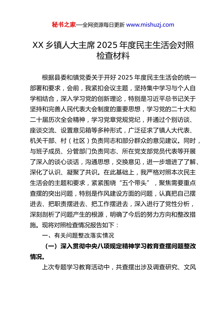 秘书之家—全网资源每日更新 www.mishuzj.comXX 乡镇人大主席 2025 年度民主生活会对照检查材料根据县委和镇党委关于开好 2025 年度民主生活会的统一部署和要求,会前,我紧扣会议主题,坚持集中学习与个人自学相结合,深入学习党的创新理论,特别是习近平总书记关于坚持和完善人民代表大会制度的重要思想,学习党的二十大和二十届历次全会精神,学习党章党规党纪,并通过个别访谈、座谈交流、设置意见箱等多种形式,广泛征求了镇人大代表、机关干部、村(社区)负责同志和部分群众的意见建议。同时,与班子成员、分管部门负责同志、所在党支部党员代表等开展了深入的谈心谈话,沟通思想,交换意见,进一步增进了了解、深化了认识、凝聚了共识。在此基础上,我严格对照本次民主生活会的主题和要求,紧紧围绕“五个带头”,聚焦需要重点查摆的突出问题,特别是作风建设方面的问题,认真把自己摆进去、把职责摆进去、把工作摆进去,深入进行了党性分析,深刻剖析了问题产生的根源,明确了今后的努力方向和整改措施。现将对照检查情况报告如下:一、有关问题整改落实情况(一)深入贯彻中央八项规定精神学习教育查摆问题整改情况。上次专题学习教育活动中,共查摆出涉及调查研究、文风秘书之家—全网资源每日更新 www.mishuzj.com会风、联系代表等方面问题 3 项。一年来,我始终坚持高标准、严要求,逐项抓好整改落实。一是针对“调研走访代表和群众深度不够,有时存在‘走马观花’现象”的问题。我修订完善了年度代表联系计划和调研方案,明确要求每季度至少深入基层联系点 2 次,每次调研必须保证半天以上时间,与至少 5 名基层代表或群众进行面对面深入交流,并建立调研问题台账和反馈机制。本年度共开展专题调研 8 次,形成有分量的调研报告 3 篇,推动解决了代表反映的民生实事 5 件。二是针对“会议活动有时存在追求形式、不够精简高效”的问题。我严格执行会议审批和统筹制度,能合并的会议坚决合并,能开视频会的不集中开,严格控制会议时间和规模。本年度,镇人大主席团会议次数同比减少 10%,会议时长平均缩短 15%,更多采用现场办公、协调会等方式研究解决问题,切实为基层减负。三是针对“文件简报存在篇幅过长、内容空泛现象”的问题。我带头落实“短实新”文风要求,对分管领域起草的文件材料严格把关,要求直奔主题、言简意赅。人大办公室发文数量同比减少 8%,简报信息更加注重反映实际问题和工作实效,质量得到明显提升。目前,上述 3 项问题已基本整改到位,并需长期坚持,防止反弹。(二)2024 年度民主生活会查摆问题整改情况。秘书之家—全网资源每日更新 www.mishuzj.com上年度民主生活会上,共查摆出理论学习系统性、监督工作刚性、发挥代表作用等方面问题 4 项。一年来,我制定了详细的整改清单和时限表,逐项推进。一是针对“理论武装与人大工作实践结合不够紧密”的问题。我坚持参加镇党委理论学习中心组学习,并组织人大干部和代表小组长开展专题学习研讨 6 次,重点围绕乡村振兴、基层治理等中心工作,研究探讨人大依法履职的切入点和着力点,推动学习成果转化为谋划工作的思路和举措。二是针对“对政府相关部门工作监督的韧劲和‘钉钉子’精神有待加强”的问题。我完善了审议意见、执法检查报告的交办、督办和满意度测评机制,对重点监督议题,如农村人居环境整治、民生实事项目实施等,实行“回头看”,持续跟踪问效,确保监督意见落地生根。例如,针对代表连续提出的农田水利设施老化问题,我们连续两年进行跟踪监督,推动镇政府将其纳入年度重点项目并已完成前期规划设计。三是针对“代表履职服务保障和激励机制不够完善”的问题。我推动建立了代表履职档案信息化管理平台,详细记录代表参会、提议、联系群众等情况,作为评优评先的重要依据。同时,加强了代表履职培训,组织代表向选区选民述职评议活动,激发了代表的履职热情和责任感。目前,4 项问题均已按计划完成整改,取得了阶段性成效,但部分工作(如代表履职能力提升)需要持续深化。秘书之家—全网资源每日更新 www.mishuzj.com二、存在的主要问题(一)带...