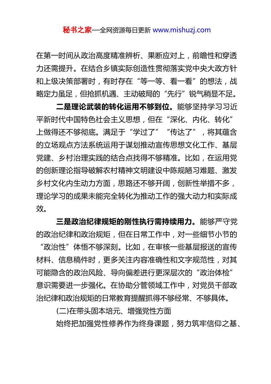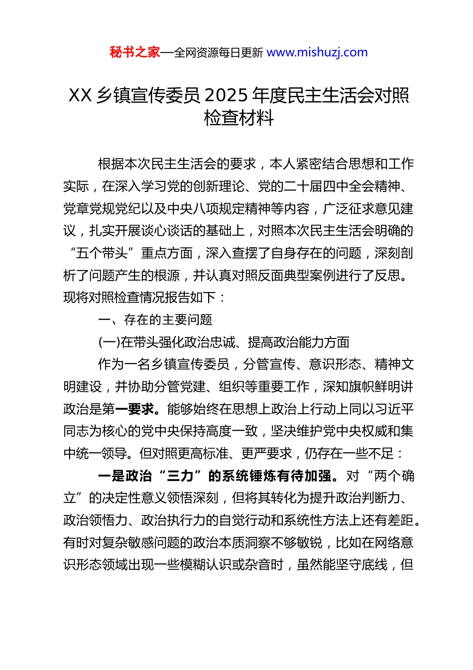 秘书之家—全网资源每日更新 www.mishuzj.comXX 乡镇宣传委员 2025 年度民主生活会对照检查材料根据本次民主生活会的要求,本人紧密结合思想和工作实际,在深入学习党的创新理论、党的二十届四中全会精神、党章党规党纪以及中央八项规定精神等内容,广泛征求意见建议,扎实开展谈心谈话的基础上,对照本次民主生活会明确的“五个带头”重点方面,深入查摆了自身存在的问题,深刻剖析了问题产生的根源,并认真对照反面典型案例进行了反思。现将对照检查情况报告如下:一、存在的主要问题(一)在带头强化政治忠诚、提高政治能力方面作为一名乡镇宣传委员,分管宣传、意识形态、精神文明建设,并协助分管党建、组织等重要工作,深知旗帜鲜明讲政治是第一要求。能够始终在思想上政治上行动上同以习近平同志为核心的党中央保持高度一致,坚决维护党中央权威和集中统一领导。但对照更高标准、更严要求,仍存在一些不足:一是政治“三力”的系统锤炼有待加强。对“两个确立”的决定性意义领悟深刻,但将其转化为提升政治判断力、政治领悟力、政治执行力的自觉行动和系统性方法上还有差距。有时对复杂敏感问题的政治本质洞察不够敏锐,比如在网络意识形态领域出现一些模糊认识或杂音时,虽然能坚守底线,但秘书之家—全网资源每日更新 www.mishuzj.com在第一时间从政治高度精准辨析、果断应对上,前瞻性和穿透力还需提升。在结合乡镇实际创造性贯彻落实党中央大政方针和上级决策部署时,有时存在“等一等、看一看”的想法,战略定力虽足,但抢抓机遇、主动破局的“先行”锐气稍显不足。二是理论武装的转化运用不够到位。能够坚持学习习近平新时代中国特色社会主义思想,但在“深化、内化、转化”上做得还不够彻底。满足于“学过了”“传达了”,将其蕴含的立场观点方法系统运用于谋划推动宣传思想文化工作、基层党建、乡村治理实践的结合点找得不够精准。比如,在运用党的创新理论指导破解农村精神文明建设中陈规陋习难题、激发乡村文化内生动力方面,思路还不够开阔,创新性举措不多,理论学习的成果未能完全转化为推动工作的强大动力和实际成效。三是政治纪律规矩的刚性执行需持续用力。能够严守党的政治纪律和政治规矩,但在日常工作中,对一些细节小节的“政治性”体悟不够深刻。比如,在审核一些基层报送的宣传材料、信息稿件时,更多关注内容准确性和文字规范性,对其可能隐含的政治风险、导向偏差进行更深层次的“政治体检”意识需要进一步强化。在协助分管领域工作中,对党员干部政治纪律和政治规矩的日常教育提醒抓得不够经常、不够具体。(二)在带头固本培元、增强党性方面始终把加强党性修养作为终身课题,努力筑牢信仰之基、秘书之家—全网资源每日更新 www.mishuzj.com补足精神之钙、把稳思想之舵。但对照党性原则的高标准,仍感自身修养存在薄弱环节:一是世界观、人生观、价值观的“总开关”拧得不够时时紧。面对社会思想多元多样多变的新形势,有时会受到一些惯性思维或潜规则的影响,自我净化、自我完善、自我革新、自我提高的主动性、紧迫感有所减弱。在纷繁复杂的工作和人际交往中,偶尔会产生“歇歇脚”“松口气”的想法,艰苦奋斗、无私奉献的精神有所淡化,未能时刻以最高标准检视自己的思想境界和价值追求。二是党性锤炼的实践性、战斗性有待增强。能够参加组织生活,但有时存在“事务化”倾向,将党性锻炼融入日常工作、学习、生活的自觉性不够。特别是在急难险重任务面前、在矛盾冲突关口,挺身而出、冲锋在前的先锋模范作用发挥得还不够充分。对照党章党规党纪进行自我检视的频率和深度不够,运用批评和自我批评武器打扫思想灰尘、祛除不良习气的勇气和锐气尚需加强,有时顾及情面,对分管领域或身边同志存在的小问题提醒不够直接。三是为民情怀的践行深度有待拓展。虽然能够坚持走群众路线,但在“身入”和“心入”上结合不够好。下基层调研有时“走马观花”多,“解剖麻雀”少;听取汇报多,与群众面对面拉家常、掏心窝了解真实想法少。对群众在精神文化需求、参与基层治理等方面的“急难愁盼”问题,掌握得不够全秘书之家—全网资源每日更新 www.mishuzj...