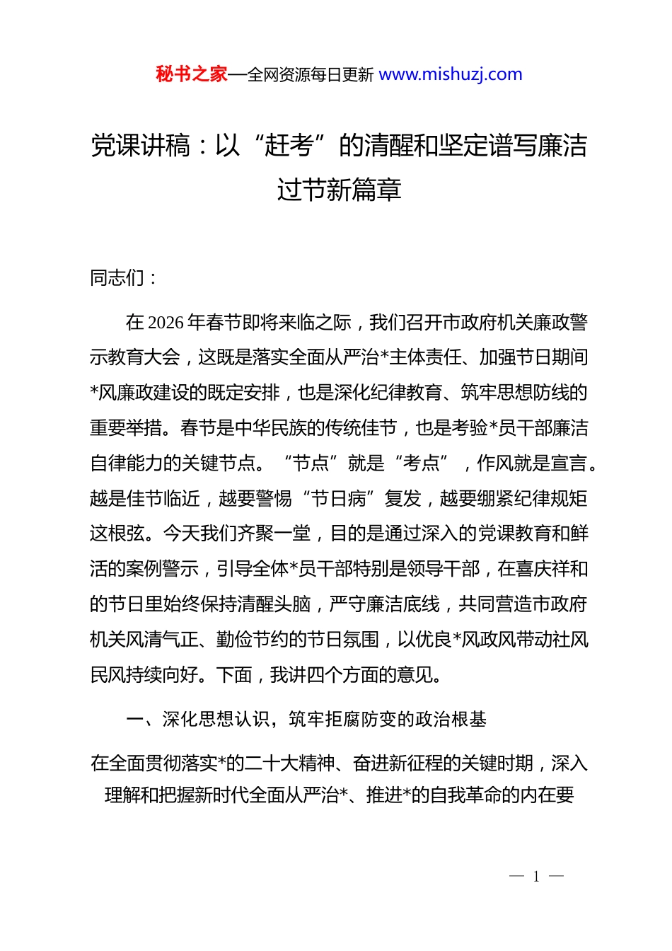 秘书之家—全网资源每日更新 www.mishuzj.com党课讲稿:以“赶考”的清醒和坚定谱写廉洁过节新篇章同志们:在 2026 年春节即将来临之际,我们召开市政府机关廉政警示教育大会,这既是落实全面从严治*主体责任、加强节日期间*风廉政建设的既定安排,也是深化纪律教育、筑牢思想防线的重要举措。春节是中华民族的传统佳节,也是考验*员干部廉洁自律能力的关键节点。“节点”就是“考点”,作风就是宣言。越是佳节临近,越要警惕“节日病”复发,越要绷紧纪律规矩这根弦。今天我们齐聚一堂,目的是通过深入的党课教育和鲜活的案例警示,引导全体*员干部特别是领导干部,在喜庆祥和的节日里始终保持清醒头脑,严守廉洁底线,共同营造市政府机关风清气正、勤俭节约的节日氛围,以优良*风政风带动社风民风持续向好。下面,我讲四个方面的意见。一、深化思想认识,筑牢拒腐防变的政治根基在全面贯彻落实*的二十大精神、奋进新征程的关键时期,深入理解和把握新时代全面从严治*、推进*的自我革命的内在要— 1 —求,是我们每一位市政府机关工作人员必须修炼好的“内功”。唯有理论上清醒,政治上才能坚定,行动上才能自觉。正如习近平***所强调:“全面从严治*是*永葆生机活力、走好新的赶考之路的必由之路秘书之家—全网资源每日更新www.mishuzj.com”我们必须从政治高度深刻认识*风廉政建设和反腐败斗争的极端重要性,将其作为一项长期而艰巨的政治任务抓紧抓实。当前,国际形势波谲云诡,国内改革发展稳定任务艰巨繁重,市政府机关在全市经济社会发展中肩负着谋划、协调、落实的重要职责。我们的作风形象、廉洁状况,直接关系到市委市政府决策部署的落实成效,关系到人民群众的获得感、幸福感、安全感。因此,持续深化思想认识,不断夯实廉洁从政的思想根基,不仅是个人健康成长的需要,更是事业发展的政治保证。我们必须将廉洁要求内化于心、外化于行,使之成为融入血脉的政治自觉。(一)提高政治站位,深刻领悟自我革命的战略意义。勇于自我革命,是我们*最鲜明的品格,也是我们*最大的优势。对于身处关键岗位的市政府机关干部而言,深刻领悟这一战略思想,是确保我们始终沿着正确方向前进的根本前提。一是要从*的百年奋斗史中汲取自我革命的精神力量。我们*之所以能— 2 —秘书之家—全网资源每日更新 www.mishuzj.com够历经百年风雨而永葆青春活力,关键就在于始终坚持真理、修正错误,敢于刀刃向内、刮骨疗毒。市政府机关工作政治性强、涉及面广,更需要我们继承和发扬这种彻底的自我革命精神,时常检视自身在贯彻中央决策部署、服务全市发展大局中是否存在偏差、不足,主动祛除思想上的杂质、行为上的弊病。二是要准确把握自我革命与推动发展的辩证关系。不能将自我革命简单理解为被动整改,而要认识到,以自我革命精神清除侵蚀*的健康肌体的病毒,正是为了增强*的创造力、凝聚力、战斗力,从而更好地引领和保障发展。我们推进行政审批改革、优化营商环境、加强民生保障等各项工作,本身就贯穿着自我革命的要求——革除体制机制弊端,提升治理效能。三是要将自我革命要求融入政治能力建设全过程。*员干部的政治能力,不仅体现在把握方向、把握大势、把握全局上,也体现在保持政治本色、防范政治风险上。要通过持续不断的思想淬炼、政治历练、实践锻炼、专业训练,增强政治敏锐性和政治鉴别力,自觉抵制各种错误思潮和腐败现象的侵蚀,确保在风浪考验面前立得住、稳得住。(二)强化理论武装,夯实清正廉洁的思想基础。思想是行动的先导,理论是实践的指南。只有用科学理论武装头脑,— 3 —才能筑牢信仰之基、补足精神之钙、把稳思想之舵,从根本上增强拒腐防变的免疫力。一是要坚持不懈用*的创新理论凝心铸魂。要持续深入学习领会习近平新时代中国特色社会主义思想的核心要义、精神实质、丰富内涵、实践要求,特别是关于全面从严治*、*风廉政建设和反腐败斗争的重要论述。要读原著、学原文、悟原理,深刻理解其时代意义、理论意义、实践意义,掌握贯穿其中的马克思主义立场观点方法,将其转化为清醒的理论自觉、坚定的政治信念、科学的思维方法。二是要常态化开展*性...