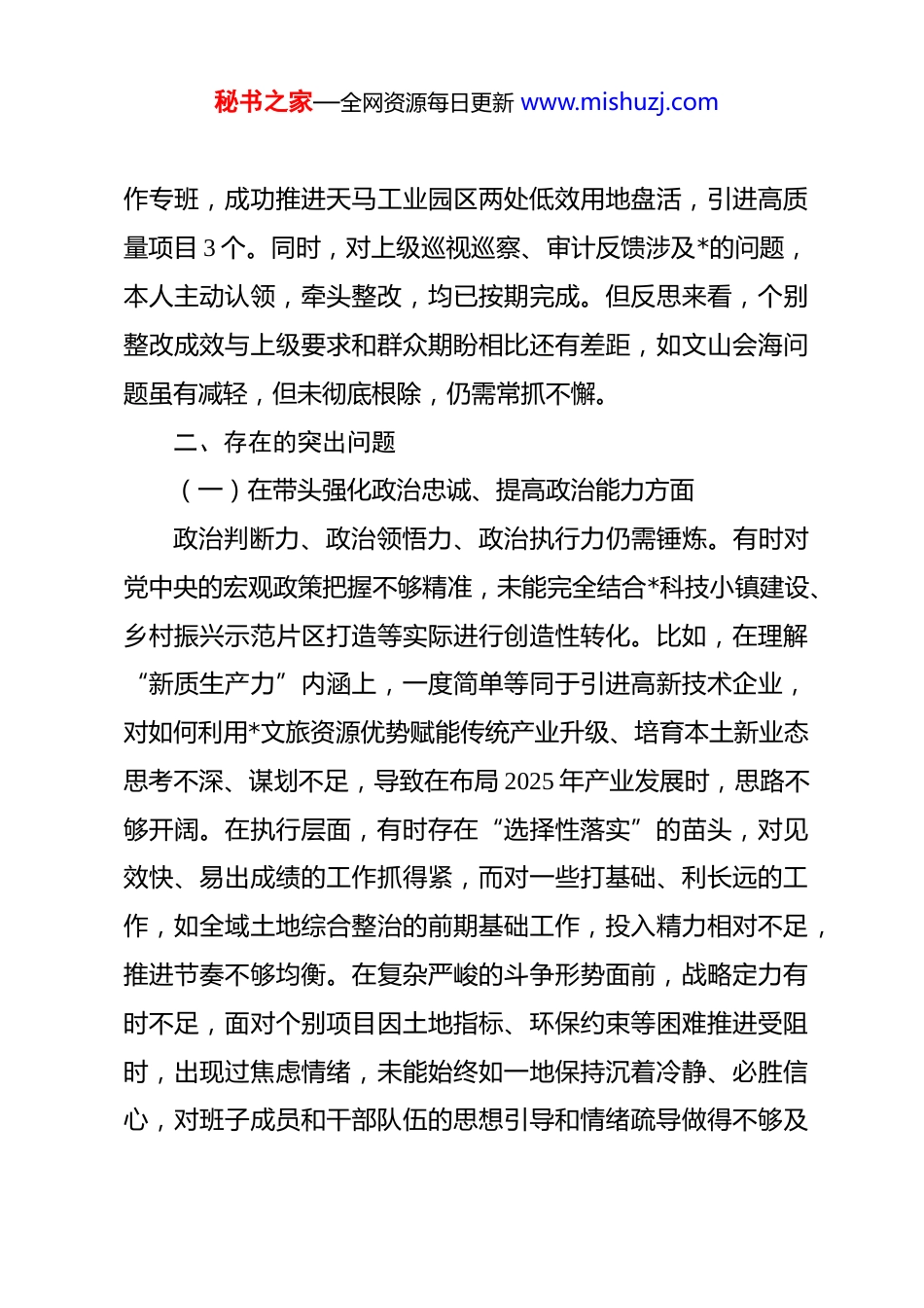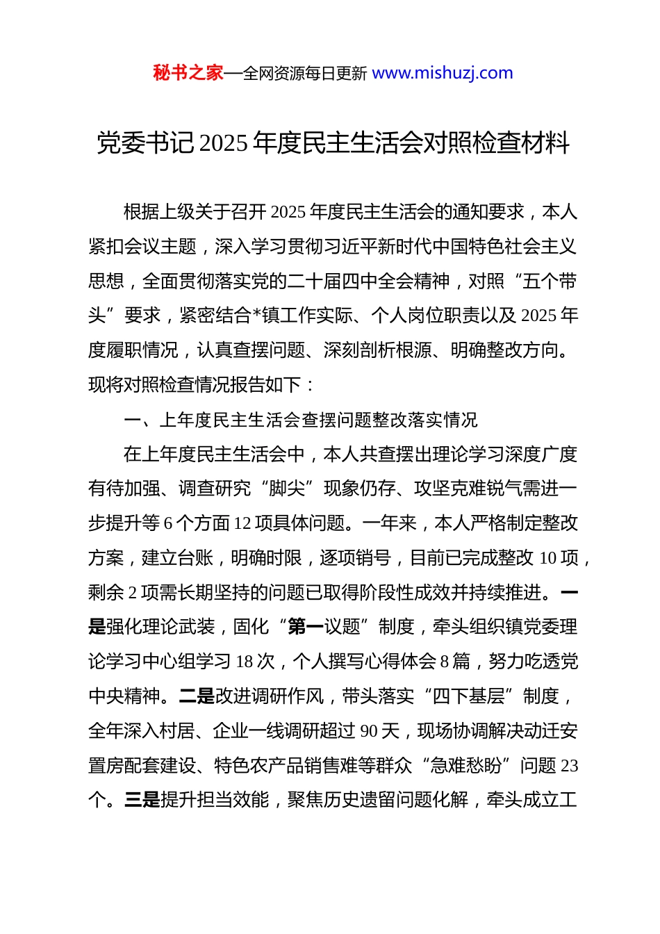 秘书之家—全网资源每日更新 www.mishuzj.com党委书记 2025 年度民主生活会对照检查材料 根据上级关于召开 2025 年度民主生活会的通知要求,本人紧扣会议主题,深入学习贯彻习近平新时代中国特色社会主义思想,全面贯彻落实党的二十届四中全会精神,对照“五个带头”要求,紧密结合*镇工作实际、个人岗位职责以及 2025 年度履职情况,认真查摆问题、深刻剖析根源、明确整改方向。现将对照检查情况报告如下:一、上年度民主生活会查摆问题整改落实情况在上年度民主生活会中,本人共查摆出理论学习深度广度有待加强、调查研究“脚尖”现象仍存、攻坚克难锐气需进一步提升等 6 个方面 12 项具体问题。一年来,本人严格制定整改方案,建立台账,明确时限,逐项销号,目前已完成整改 10 项,剩余 2 项需长期坚持的问题已取得阶段性成效并持续推进。一是强化理论武装,固化“第一议题”制度,牵头组织镇党委理论学习中心组学习 18 次,个人撰写心得体会 8 篇,努力吃透党中央精神。二是改进调研作风,带头落实“四下基层”制度,全年深入村居、企业一线调研超过 90 天,现场协调解决动迁安置房配套建设、特色农产品销售难等群众“急难愁盼”问题 23个。三是提升担当效能,聚焦历史遗留问题化解,牵头成立工秘书之家—全网资源每日更新 www.mishuzj.com作专班,成功推进天马工业园区两处低效用地盘活,引进高质量项目 3 个。同时,对上级巡视巡察、审计反馈涉及*的问题,本人主动认领,牵头整改,均已按期完成。但反思来看,个别整改成效与上级要求和群众期盼相比还有差距,如文山会海问题虽有减轻,但未彻底根除,仍需常抓不懈。二、存在的突出问题(一)在带头强化政治忠诚、提高政治能力方面政治判断力、政治领悟力、政治执行力仍需锤炼。有时对党中央的宏观政策把握不够精准,未能完全结合*科技小镇建设、乡村振兴示范片区打造等实际进行创造性转化。比如,在理解“新质生产力”内涵上,一度简单等同于引进高新技术企业,对如何利用*文旅资源优势赋能传统产业升级、培育本土新业态思考不深、谋划不足,导致在布局 2025 年产业发展时,思路不够开阔。在执行层面,有时存在“选择性落实”的苗头,对见效快、易出成绩的工作抓得紧,而对一些打基础、利长远的工作,如全域土地综合整治的前期基础工作,投入精力相对不足,推进节奏不够均衡。在复杂严峻的斗争形势面前,战略定力有时不足,面对个别项目因土地指标、环保约束等困难推进受阻时,出现过焦虑情绪,未能始终如一地保持沉着冷静、必胜信心,对班子成员和干部队伍的思想引导和情绪疏导做得不够及秘书之家—全网资源每日更新 www.mishuzj.com时到位。(二)在带头固本培元、增强党性方面理论学习的系统性和穿透力有待提升。虽然坚持集体学习但有时满足于“读过了”“学过了”,对习近平新时代中国特色社会主义思想蕴含的立场、观点、方法,特别是关于城乡融合发展、基层治理现代化的精髓要义,钻研得不够透彻,存在“浅层化”现象。运用党的创新理论指导*实践的能力尚有欠缺,比如,在推进“美丽家园”建设时,更多关注硬件设施投入,对如何运用“党建引领”这根绣花针,穿起基层治理千条线,激发村民内生动力,构建长效管护机制,思路办法不多,导致部分村宅后期管理出现反弹。党性锻炼的主动性自觉性不强,有时以事务工作代替党性锤炼,参加所在支部的组织生活有时按部就班,带头开展批评与自我批评时“辣味”不足,对支部党员的思想动态关心了解不够深入。世界观、人生观、价值观这个“总开关”拧得不够紧,面对社会上的一些不良风气和诱惑,虽然能守住底线,但警惕性和自觉抵制的高度还需进一步提升。(三)在带头敬畏人民、敬畏组织、敬畏法纪方面践行群众路线有时不够深入扎实。“四下基层”虽然做到了身入,但“心至”的程度还有差距。比如,在接待信访群众秘书之家—全网资源每日更新 www.mishuzj.com时,有时侧重于程序性办结,对问题背后的深层次原因剖析不够,未能完全做到“事心双解”,2025 年处理的个别重复访案件就反映了这一点。保障和改善民生的力度与群众期盼有落差,对“一老一...