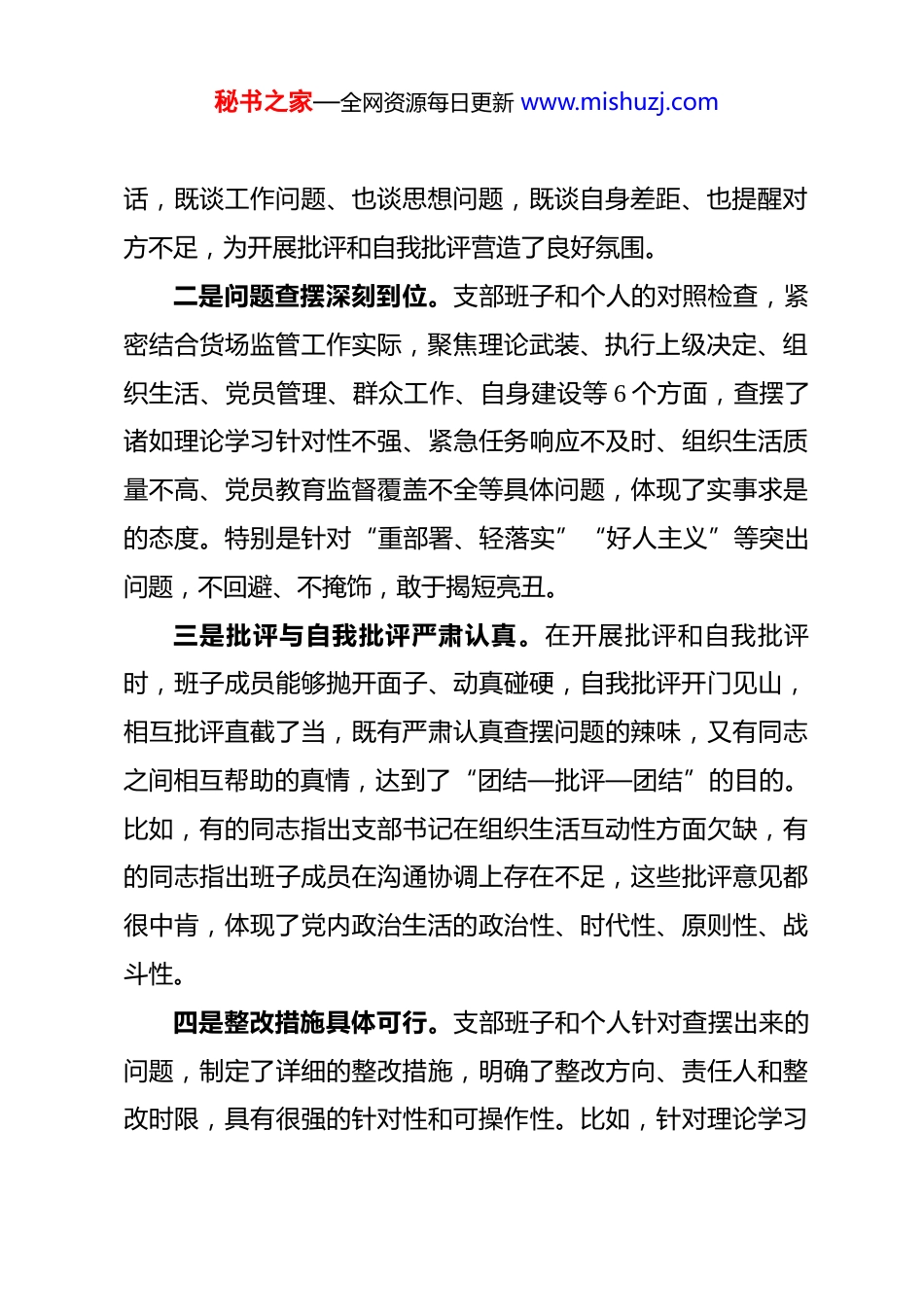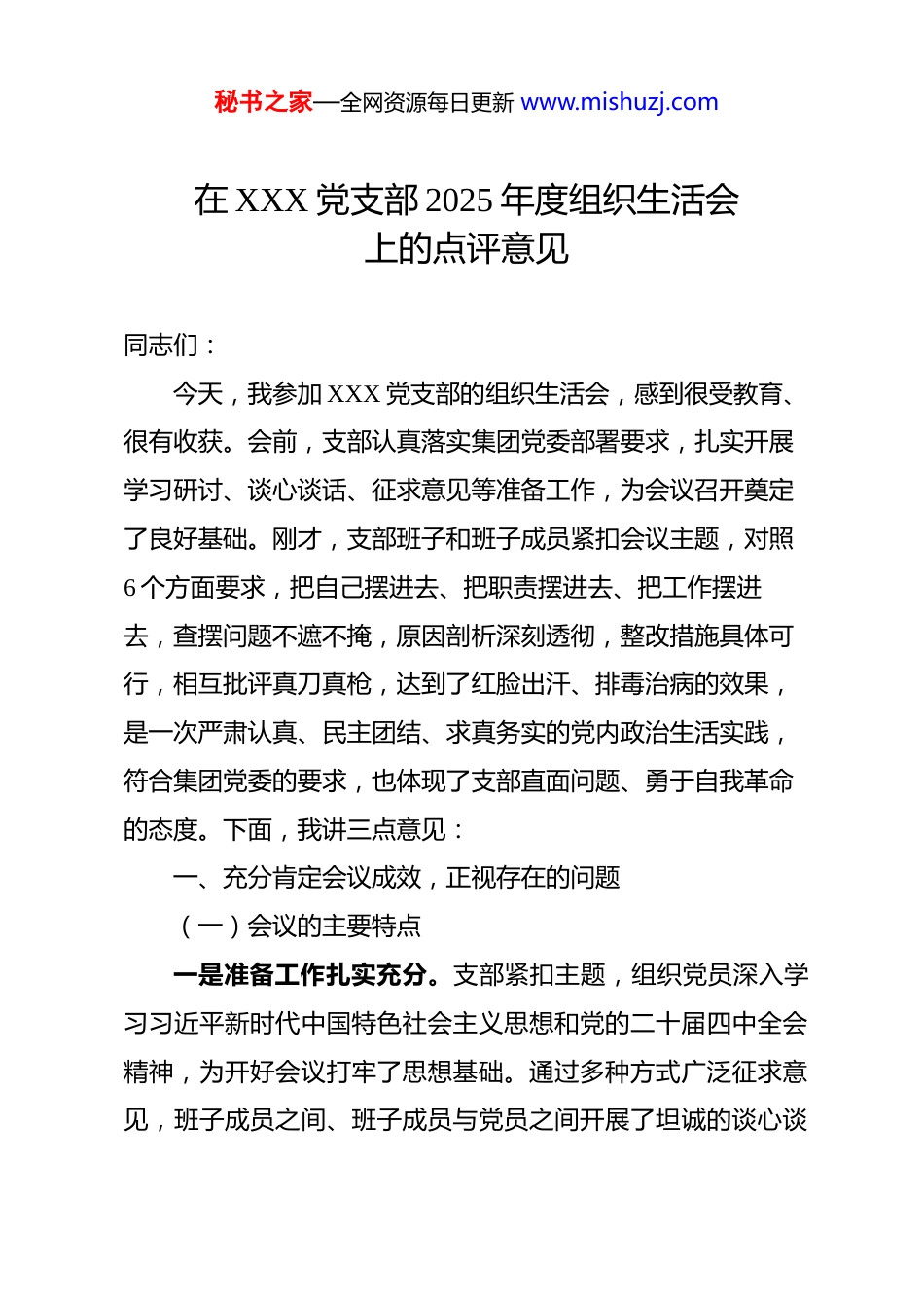 秘书之家—全网资源每日更新 www.mishuzj.com在 XXX 党支部 2025 年度组织生活会上的点评意见同志们:今天,我参加 XXX 党支部的组织生活会,感到很受教育、很有收获。会前,支部认真落实集团党委部署要求,扎实开展学习研讨、谈心谈话、征求意见等准备工作,为会议召开奠定了良好基础。刚才,支部班子和班子成员紧扣会议主题,对照6 个方面要求,把自己摆进去、把职责摆进去、把工作摆进去,查摆问题不遮不掩,原因剖析深刻透彻,整改措施具体可行,相互批评真刀真枪,达到了红脸出汗、排毒治病的效果,是一次严肃认真、民主团结、求真务实的党内政治生活实践,符合集团党委的要求,也体现了支部直面问题、勇于自我革命的态度。下面,我讲三点意见:一、充分肯定会议成效,正视存在的问题(一)会议的主要特点一是准备工作扎实充分。支部紧扣主题,组织党员深入学习习近平新时代中国特色社会主义思想和党的二十届四中全会精神,为开好会议打牢了思想基础。通过多种方式广泛征求意见,班子成员之间、班子成员与党员之间开展了坦诚的谈心谈秘书之家—全网资源每日更新 www.mishuzj.com话,既谈工作问题、也谈思想问题,既谈自身差距、也提醒对方不足,为开展批评和自我批评营造了良好氛围。二是问题查摆深刻到位。支部班子和个人的对照检查,紧密结合货场监管工作实际,聚焦理论武装、执行上级决定、组织生活、党员管理、群众工作、自身建设等 6 个方面,查摆了诸如理论学习针对性不强、紧急任务响应不及时、组织生活质量不高、党员教育监督覆盖不全等具体问题,体现了实事求是的态度。特别是针对“重部署、轻落实”“好人主义”等突出问题,不回避、不掩饰,敢于揭短亮丑。三是批评与自我批评严肃认真。在开展批评和自我批评时,班子成员能够抛开面子、动真碰硬,自我批评开门见山,相互批评直截了当,既有严肃认真查摆问题的辣味,又有同志之间相互帮助的真情,达到了“团结—批评—团结”的目的。比如,有的同志指出支部书记在组织生活互动性方面欠缺,有的同志指出班子成员在沟通协调上存在不足,这些批评意见都很中肯,体现了党内政治生活的政治性、时代性、原则性、战斗性。四是整改措施具体可行。支部班子和个人针对查摆出来的问题,制定了详细的整改措施,明确了整改方向、责任人和整改时限,具有很强的针对性和可操作性。比如,针对理论学习秘书之家—全网资源每日更新 www.mishuzj.com不深入的问题,制定了理论学习规划,明确了学习内容、方式和考核标准;针对组织生活参与率不高的问题,提出了“线上线下相结合”“主题党日+业务研讨”等创新形式;针对联系群众不够紧密的问题,建立了班子成员联系点制度,这些措施都体现了整改的决心和力度。(二)存在的不足在肯定成绩的同时,我们也要清醒地看到,会议还存在一些不足之处:一是部分问题查摆还不够深入。虽然支部班子和个人查摆了不少问题,但在一些问题的根源剖析上还不够深刻,比如对“重业务、轻学习”倾向的思想根源挖掘还不够,对政治站位不高的具体表现分析还不够透彻。二是相互批评的质量还有待提高。有的同志在相互批评时,还存在以提希望代替提问题、以工作建议代替批评意见的情况,批评的辣味还不够浓,思想交锋还不够激烈。三是整改措施的系统性还需加强。整改措施虽然具体,但在系统性和协同性方面还有待加强,比如在解决货场拥堵、通关效率提升等问题上,如何更好地整合各方资源、形成工作合力,还需要进一步研究。二、聚焦问题抓整改,推动支部建设再上新台阶秘书之家—全网资源每日更新 www.mishuzj.com组织生活会的成效,最终要体现在整改落实上。支部班子和全体党员要以这次组织生活会为契机,坚持问题导向,狠抓整改落实,切实把整改成果转化为推动工作的强大动力。(一)强化理论武装,提高政治站位一是深化理论学习。要持续深入学习习近平新时代中国特色社会主义思想和党的二十届四中全会精神,坚持读原著、学原文、悟原理,在学懂弄通做实上下功夫。要结合货场监管工作实际,加强对跨境贸易便利化、国门生物安全等业务相关政策的学习,不断提高理论指导实践的能力。二是提升政治素...