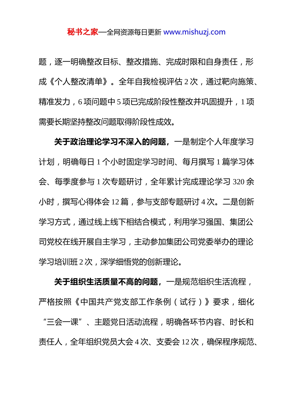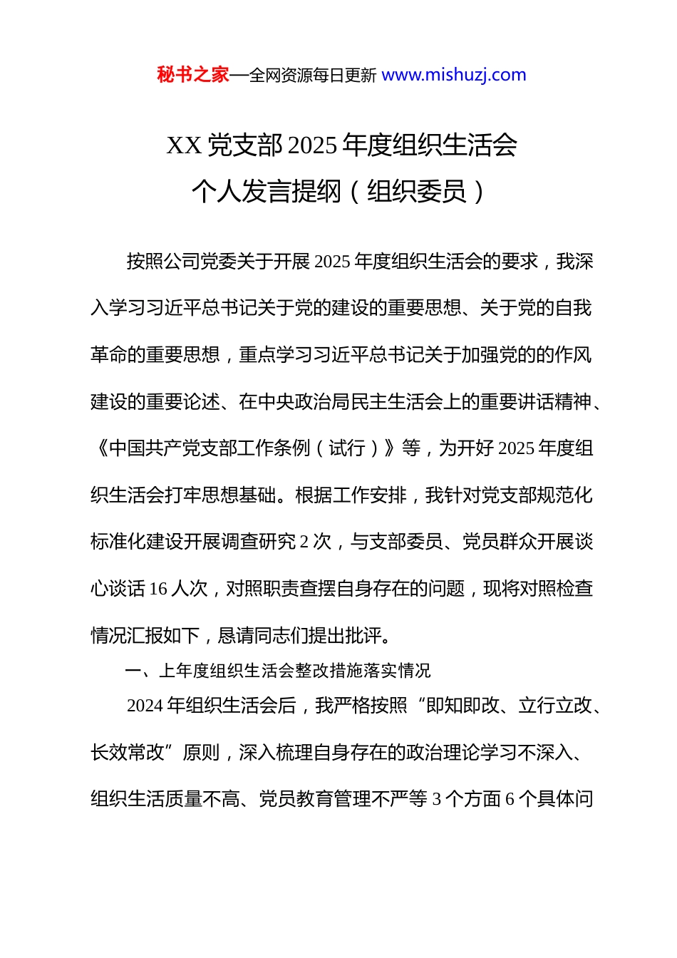 秘书之家—全网资源每日更新 www.mishuzj.comXX 党支部 2025 年度组织生活会个人发言提纲(组织委员)按照公司党委关于开展 2025 年度组织生活会的要求,我深入学习习近平总书记关于党的建设的重要思想、关于党的自我革命的重要思想,重点学习习近平总书记关于加强党的的作风建设的重要论述、在中央政治局民主生活会上的重要讲话精神、《中国共产党支部工作条例(试行)》等,为开好 2025 年度组织生活会打牢思想基础。根据工作安排,我针对党支部规范化标准化建设开展调查研究 2 次,与支部委员、党员群众开展谈心谈话 16 人次,对照职责查摆自身存在的问题,现将对照检查情况汇报如下,恳请同志们提出批评。一、上年度组织生活会整改措施落实情况 2024 年组织生活会后,我严格按照“即知即改、立行立改、长效常改”原则,深入梳理自身存在的政治理论学习不深入、组织生活质量不高、党员教育管理不严等 3 个方面 6 个具体问秘书之家—全网资源每日更新 www.mishuzj.com题,逐一明确整改目标、整改措施、完成时限和自身责任,形成《个人整改清单》。全年自我检视评估 2 次,通过靶向施策、精准发力,6 项问题中 5 项已完成阶段性整改并巩固提升,1 项需要长期坚持整改问题取得阶段性成效。关于政治理论学习不深入的问题,一是制定个人年度学习计划,明确每日 1 个小时固定学习时间、每月撰写 1 篇学习体会、每季度参与 1 次专题研讨,全年累计完成理论学习 320 余小时,撰写心得体会 12 篇,参与支部专题研讨 4 次。二是创新学习方式,通过线上线下相结合模式,利用学习强国、集团公司党校在线开展自主学习,主动参加集团公司党委举办的理论学习培训班 2 次,深学细悟党的创新理论。关于组织生活质量不高的问题,一是规范组织生活流程,严格按照《中国共产党支部工作条例(试行)》要求,细化“三会一课”、主题党日活动流程,明确各环节内容、时长和责任人,全年组织党员大会 4 次、支委会 12 次,确保程序规范、秘书之家—全网资源每日更新 www.mishuzj.com内容充实。二是丰富活动形式内容,结合支部实际策划开展参观监狱警示教育、党建知识竞赛、志愿服务等特色活动 6 次,打破传统学习模式,提升组织生活吸引力。关于党员教育管理不严的问题,一是强化党员日常管理,建立党员教育管理台账,将党员参加组织生活、理论学习、履职尽责等情况纳入台账管理,实行每月登记、季度汇总、年度考核,全年对 3 名缺席组织生活的党员进行提醒谈话,督促整改到位。二是深化谈心谈话制度,坚持“一对一、面对面”谈心谈话,全年与支部党员谈心谈话累计 32 人次,重点了解党员思想动态、工作困难和需求,帮助解决子女上学、老人就医等实际问题 6 件,及时纠正苗头性问题 3 个。二、存在问题及表现(一)学习贯彻党的创新理论方面一是理论学习的主动性、系统性不足。对党的创新理论,特别是新时代党的建设总要求和组织路线的重要论述,有时停留在“已读”“已学”层面,满足于规定动作,对其中蕴含的秘书之家—全网资源每日更新 www.mishuzj.com立场观点方法,把握不精准,未能完全转化为谋划组织工作、推动支部建设的思路举措。二是理论联系实际不够紧密。运用党的创新理论指导组织委员具体工作的能力有待提升,比如,在发展党员、支部组织生活设计等方面,有时候惯性思维较多,如何更好结合上级精神与支部党员思想实际、工作实际相结合,进行创新性落实,思考不深、办法不多。(二)加强党性锤炼方面一是党性修养的自觉性不足,有时把自己等同于普通群众,党员先锋模范作用发挥不充分,批评和自我批评武器运用不充分,在组织生活中自我批评避重就轻、相互批评辣味不足,存在“老好人”思想。二是面对不良风气和问题,斗争精神不够强烈,缺乏敢于较真碰硬的勇气,党性原则坚守不够坚定。(三)联系服务群众方面一是作为组织委员,主动深入党员群众中听取意见、了解秘书之家—全网资源每日更新 www.mishuzj.com诉求、收集建议做的不够。习惯于通过会议、文件了解情况,与党员面对面、心贴心的交流沟通较少,对大家普遍关心的职业规划...