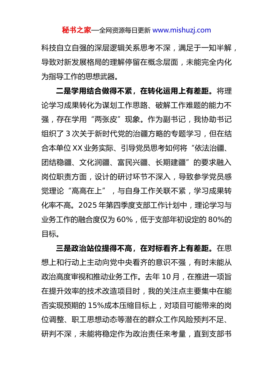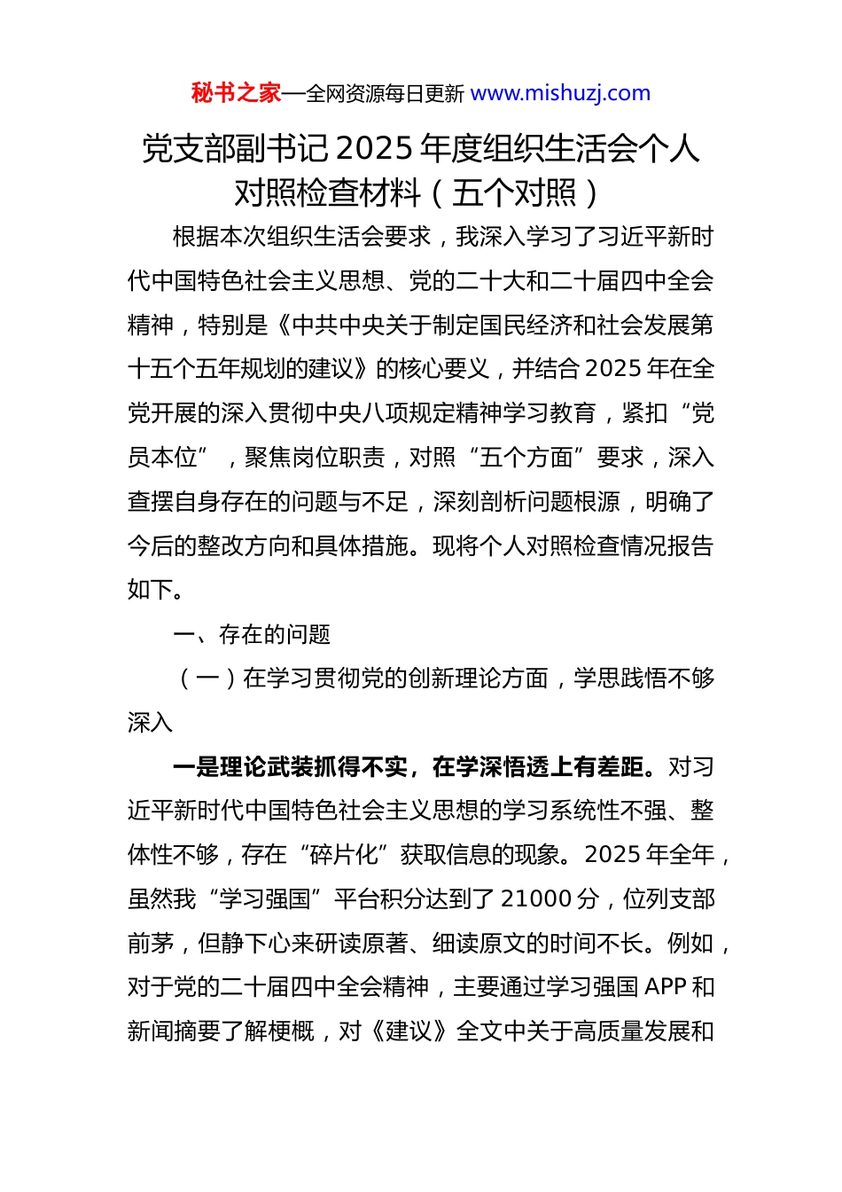 秘书之家—全网资源每日更新 www.mishuzj.com党支部副书记 2025 年度组织生活会个人对照检查材料(五个对照)根据本次组织生活会要求,我深入学习了习近平新时代中国特色社会主义思想、党的二十大和二十届四中全会精神,特别是《中共中央关于制定国民经济和社会发展第十五个五年规划的建议》的核心要义,并结合 2025 年在全党开展的深入贯彻中央八项规定精神学习教育,紧扣“党员本位”,聚焦岗位职责,对照“五个方面”要求,深入查摆自身存在的问题与不足,深刻剖析问题根源,明确了今后的整改方向和具体措施。现将个人对照检查情况报告如下。一、存在的问题(一)在学习贯彻党的创新理论方面,学思践悟不够深入一是理论武装抓得不实,在学深悟透上有差距。对习近平新时代中国特色社会主义思想的学习系统性不强、整体性不够,存在“碎片化”获取信息的现象。2025 年全年,虽然我“学习强国”平台积分达到了 21000 分,位列支部前茅,但静下心来研读原著、细读原文的时间不长。例如,对于党的二十届四中全会精神,主要通过学习强国 APP 和新闻摘要了解梗概,对《建议》全文中关于高质量发展和秘书之家—全网资源每日更新 www.mishuzj.com科技自立自强的深层逻辑关系思考不深,满足于一知半解,导致对新发展格局的理解停留在概念层面,未能完全内化为指导工作的思想武器。二是学用结合做得不紧,在转化运用上有差距。将理论学习成果转化为谋划工作思路、破解工作难题的能力不强,存在学用“两张皮”现象。作为副书记,我协助书记组织了 3 次关于新时代党的治疆方略的专题学习,但在结合本单位 XX 业务实际、引导党员思考如何将“依法治疆、团结稳疆、文化润疆、富民兴疆、长期建疆”的要求融入岗位职责方面,设计的研讨环节不深入,导致参学党员感觉理论“高高在上”,与自身工作关联不紧,学习成果转化率不高。2025 年第四季度支部工作计划中,理论学习与业务工作的融合度仅为 60%,低于支部年初设定的 80%的目标。三是政治站位提得不高,在对标看齐上有差距。在思想上和行动上主动向党中央看齐的意识不强,有时未能从政治高度审视和推动业务工作。去年 10 月,在推进一项旨在提升效率的技术改造项目时,我的关注点主要集中在能否实现预期的 15%成本压缩目标上,对项目可能带来的岗位调整、职工思想动态等潜在的群众工作风险预判不足、研判不深,未能将稳定作为政治责任来考量,直到支部书秘书之家—全网资源每日更新 www.mishuzj.com记在会议上专门点出,我才意识到思考问题的政治站位存在偏差,没有真正做到胸怀“国之大者”。(二)在加强党性锤炼方面,党性修养不够扎实一是政治修养摆位不高,理想信念砥砺不够。在日常工作中,有时会不自觉地将业务工作置于政治学习和党性锻炼之上,认为只要业务过硬就是对党最大的贡献。去年,支部计划在 7 月份组织一次赴 XX 红色教育基地的党性教育活动,我因分管的 XX 项目正处于攻坚阶段,便以“工作离不开”为由向书记请假,事后也仅通过阅读活动纪要的方式进行了“补课”,反映出我在处理具体工作与加强党性修养的关系上存在本末倒置的问题,没有把党性锤炼作为终身课题抓紧抓实。二是纪律规矩执行不严,自我约束要求不够。能够严守党的政治纪律和政治规矩,但在一些工作纪律和生活细节上要求不严。例如,在工作中存在一定的粗心大意现象。2025 年 8 月,我负责草拟支部向上一级党委报送的党建工作总结,因审核把关不细,导致报告中出现了 2 处数据引用错误和 3 处明显错别字,虽然及时发现并作了更正,但暴露出我严谨细致的工作作风有所松懈。同时,偶尔会在家庭聚会中,与同为党员的家人谈论单位内部尚未公开的人事安排,虽然范围极小,但违反了保密纪律。秘书之家—全网资源每日更新 www.mishuzj.com三是斗争精神磨砺不强,在大是大非上交锋不够。在维护民族团结、反对分裂等大是大非问题上,我的立场是坚定的,但在面对一些社会上的错误思潮和模糊认识时,主动亮剑、坚决斗争的勇气不强。去年 11 月,在一个行业交流微信群中,有个别人士发表了含沙射影、抹黑兵团历史贡献的言论,我当时虽...