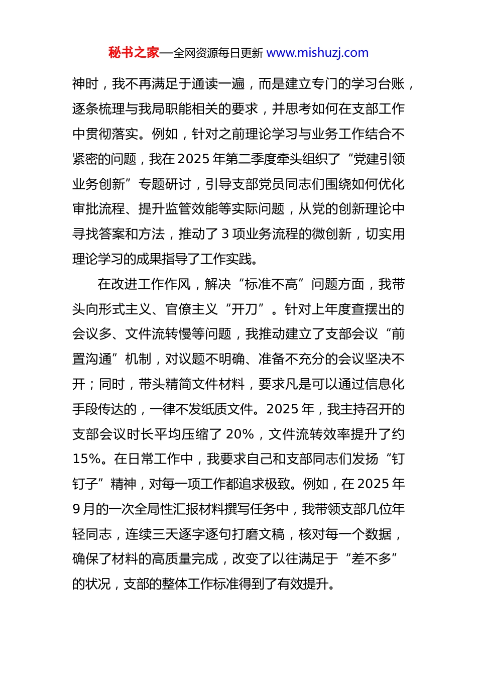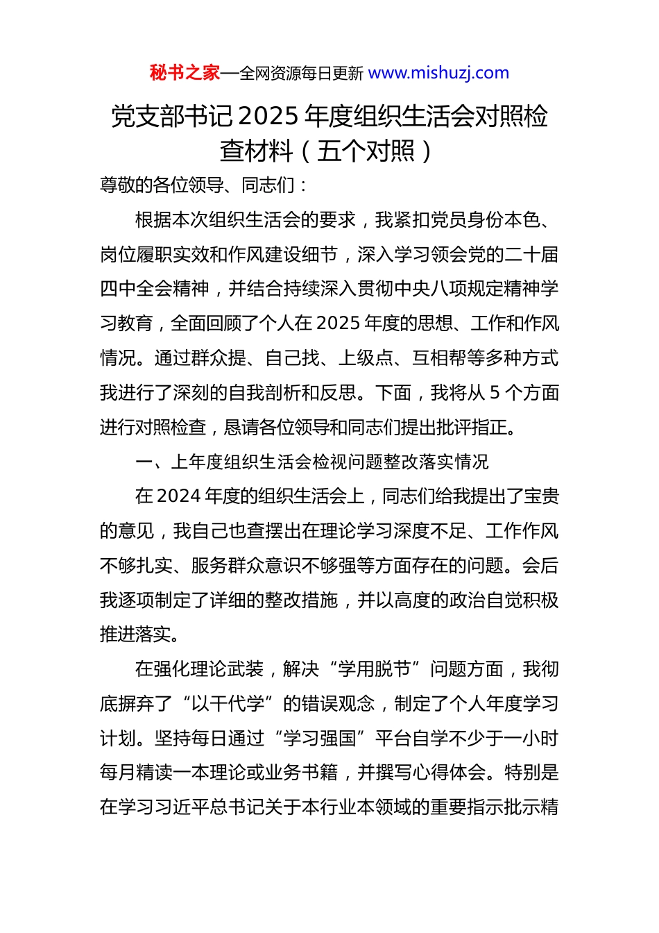 秘书之家—全网资源每日更新 www.mishuzj.com党支部书记 2025 年度组织生活会对照检查材料(五个对照)尊敬的各位领导、同志们:根据本次组织生活会的要求,我紧扣党员身份本色、岗位履职实效和作风建设细节,深入学习领会党的二十届四中全会精神,并结合持续深入贯彻中央八项规定精神学习教育,全面回顾了个人在 2025 年度的思想、工作和作风情况。通过群众提、自己找、上级点、互相帮等多种方式我进行了深刻的自我剖析和反思。下面,我将从 5 个方面进行对照检查,恳请各位领导和同志们提出批评指正。一、上年度组织生活会检视问题整改落实情况在 2024 年度的组织生活会上,同志们给我提出了宝贵的意见,我自己也查摆出在理论学习深度不足、工作作风不够扎实、服务群众意识不够强等方面存在的问题。会后我逐项制定了详细的整改措施,并以高度的政治自觉积极推进落实。在强化理论武装,解决“学用脱节”问题方面,我彻底摒弃了“以干代学”的错误观念,制定了个人年度学习计划。坚持每日通过“学习强国”平台自学不少于一小时每月精读一本理论或业务书籍,并撰写心得体会。特别是在学习习近平总书记关于本行业本领域的重要指示批示精秘书之家—全网资源每日更新 www.mishuzj.com神时,我不再满足于通读一遍,而是建立专门的学习台账,逐条梳理与我局职能相关的要求,并思考如何在支部工作中贯彻落实。例如,针对之前理论学习与业务工作结合不紧密的问题,我在 2025 年第二季度牵头组织了“党建引领业务创新”专题研讨,引导支部党员同志们围绕如何优化审批流程、提升监管效能等实际问题,从党的创新理论中寻找答案和方法,推动了 3 项业务流程的微创新,切实用理论学习的成果指导了工作实践。在改进工作作风,解决“标准不高”问题方面,我带头向形式主义、官僚主义“开刀”。针对上年度查摆出的会议多、文件流转慢等问题,我推动建立了支部会议“前置沟通”机制,对议题不明确、准备不充分的会议坚决不开;同时,带头精简文件材料,要求凡是可以通过信息化手段传达的,一律不发纸质文件。2025 年,我主持召开的支部会议时长平均压缩了 20%,文件流转效率提升了约15%。在日常工作中,我要求自己和支部同志们发扬“钉钉子”精神,对每一项工作都追求极致。例如,在 2025 年9 月的一次全局性汇报材料撰写任务中,我带领支部几位年轻同志,连续三天逐字逐句打磨文稿,核对每一个数据,确保了材料的高质量完成,改变了以往满足于“差不多”的状况,支部的整体工作标准得到了有效提升。秘书之家—全网资源每日更新 www.mishuzj.com在增强宗旨意识,解决“服务不优”问题方面,我将“群众满意不满意”作为检验工作的根本标准。我为自己设立了“基层联系日”,每季度至少利用两个工作日,不打招呼、不定路线,深入企业、社区和基层站所,与一线工作人员和办事群众面对面交流。在 2025 年的一次走访中,我了解到有几家小微企业对某项惠企政策的申报流程不清楚,反复跑了几次都未能成功办理。我立即将此问题带回局里,并协调相关业务科室,在三天内制作了图文并茂、通俗易懂的“申报流程一张图”,并通过我局微信公众号和窗口服务单位精准推送,受到了企业主的一致好评。一年来,我通过走访调研,累计收集群众和企业反映的问题11 个,已协调解决 9 个。截至目前,2024 年度查摆出的 6 个问题已完成整改 5个,整改完成率为 83.3%,尚未完成整改的 1 个问题正在积极推进,并已列入我 2026 年的重点工作任务,计划于2026 年 6 月前取得阶段性成果。通过一年的整改,我个人在思想认识、工作能力和服务水平等方面均取得了进步,但我也清醒地认识到,作风建设永远在路上,必须持续巩固整改成果,不断自我提升。二、当前存在的突出问题对照党员义务和权利,对照新时代合格党员标准,对秘书之家—全网资源每日更新 www.mishuzj.com照党的二十届四中全会精神和中央八项规定精神要求,我感到自身仍存在不少差距和不足,具体表现在以下五个方面。(一)对照贯彻党的创新理论方面。一是将宏大理论转化为微观实践的思路不够开阔。学习党的二十届四中全会精神时,...