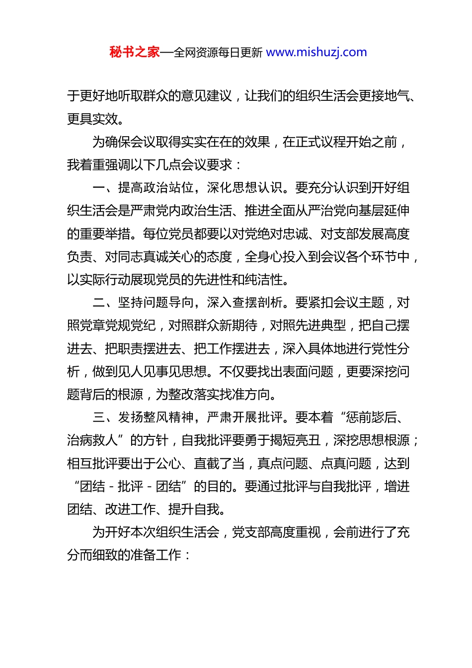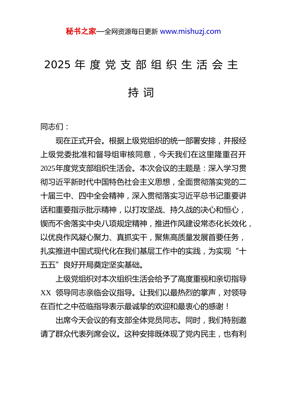 秘书之家—全网资源每日更新 www.mishuzj.com2025 年 度 党 支 部 组 织 生 活 会 主持 词同志们:现在正式开会。根据上级党组织的统一部署安排,并报经上级党委批准和督导组审核同意,今天我们在这里隆重召开2025年度党支部组织生活会。本次会议的主题是:深入学习贯彻习近平新时代中国特色社会主义思想,全面贯彻落实党的二十届三中、四中全会精神,深入贯彻落实习近平总书记重要讲话和重要指示批示精神,以打攻坚战、持久战的决心和恒心,锲而不舍落实中央八项规定精神,推进作风建设常态化长效化,以优良作风凝心聚力、真抓实干,聚焦高质量发展首要任务,扎实推进中国式现代化在我们基层工作中的实践,为实现“十五五”良好开局奠定坚实基础。上级党组织对本次组织生活会给予了高度重视和亲切指导XX 领导同志亲临会议指导。让我们以最热烈的掌声,对领导在百忙之中莅临指导表示最诚挚的欢迎和最衷心的感谢!出席今天会议的有支部全体党员同志。同时,我们特别邀请了群众代表列席会议。这种安排既体现了党内民主,也有利秘书之家—全网资源每日更新 www.mishuzj.com于更好地听取群众的意见建议,让我们的组织生活会更接地气、更具实效。为确保会议取得实实在在的效果,在正式议程开始之前,我着重强调以下几点会议要求:一、提高政治站位,深化思想认识。要充分认识到开好组织生活会是严肃党内政治生活、推进全面从严治党向基层延伸的重要举措。每位党员都要以对党绝对忠诚、对支部发展高度负责、对同志真诚关心的态度,全身心投入到会议各个环节中,以实际行动展现党员的先进性和纯洁性。二、坚持问题导向,深入查摆剖析。要紧扣会议主题,对照党章党规党纪,对照群众新期待,对照先进典型,把自己摆进去、把职责摆进去、把工作摆进去,深入具体地进行党性分析,做到见人见事见思想。不仅要找出表面问题,更要深挖问题背后的根源,为整改落实找准方向。三、发扬整风精神,严肃开展批评。要本着“惩前毖后、治病救人”的方针,自我批评要勇于揭短亮丑,深挖思想根源;相互批评要出于公心、直截了当,真点问题、点真问题,达到“团结-批评-团结”的目的。要通过批评与自我批评,增进团结、改进工作、提升自我。为开好本次组织生活会,党支部高度重视,会前进行了充分而细致的准备工作:秘书之家—全网资源每日更新 www.mishuzj.com一、深化理论学习,筑牢思想根基。支部党员通过个人自学、集中研讨、专题辅导等多种形式,深入学习党的二十大和二十届历次全会精神,认真学习党章、《关于新形势下党内政治生活的若干准则》等党内法规,重点研读习近平总书记在中央政治局民主生活会上的重要讲话精神、习近平总书记在二十届中纪委五次全会重要讲话精神以及关于全面从严治党、加强作风建设的重要论述。同时,结合我们支部的工作实际,学习与我们业务相关的政策文件和工作要求,进一步深化了认识、统一了思想,为开好组织生活会奠定了坚实的思想基础。二、广泛征求意见,倾听群众呼声。我们坚持开门搞活动,通过发放征求意见函、设置意见箱、召开座谈会、个别访谈、线上问卷调查等多种渠道,广泛征求了社区居民、服务对象、共建单位等各方面的意见建议。征集到原始意见建议[X ]条,经梳理归纳,形成对支部的意见建议[X ]条,对党员个人的意见建议[X ]条。所有意见建议均已原汁原味反馈给支部和每位党员。三、深入谈心谈话,增进思想交流。严格落实“四必谈”要求,支部书记与支部委员之间、支部委员相互之间、支部委员与党员之间、党员与党员之间都开展了面对面、一对一的谈心谈话。大家敞开心扉、交流思想,既谈了工作也谈了思想,既肯定了成绩也指出了不足,增进了理解,消除了隔阂,凝聚了共识。秘书之家—全网资源每日更新 www.mishuzj.com四、认真撰写材料,深刻对照检查。在深入学习、广泛征求意见、深入谈心谈话的基础上,支部书记主持起草了支部对照检查材料,党员都认真撰写了个人发言提纲。大家紧扣主题,重点围绕带头强化政治忠诚、提高政治能力,带头固本培元、增强党性,带头敬畏人民、敬畏组织、敬畏法纪,带头干事创业、担当作为,带头坚...