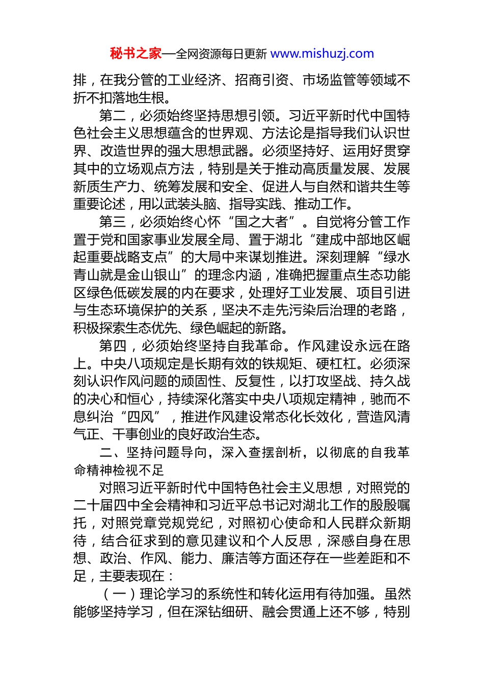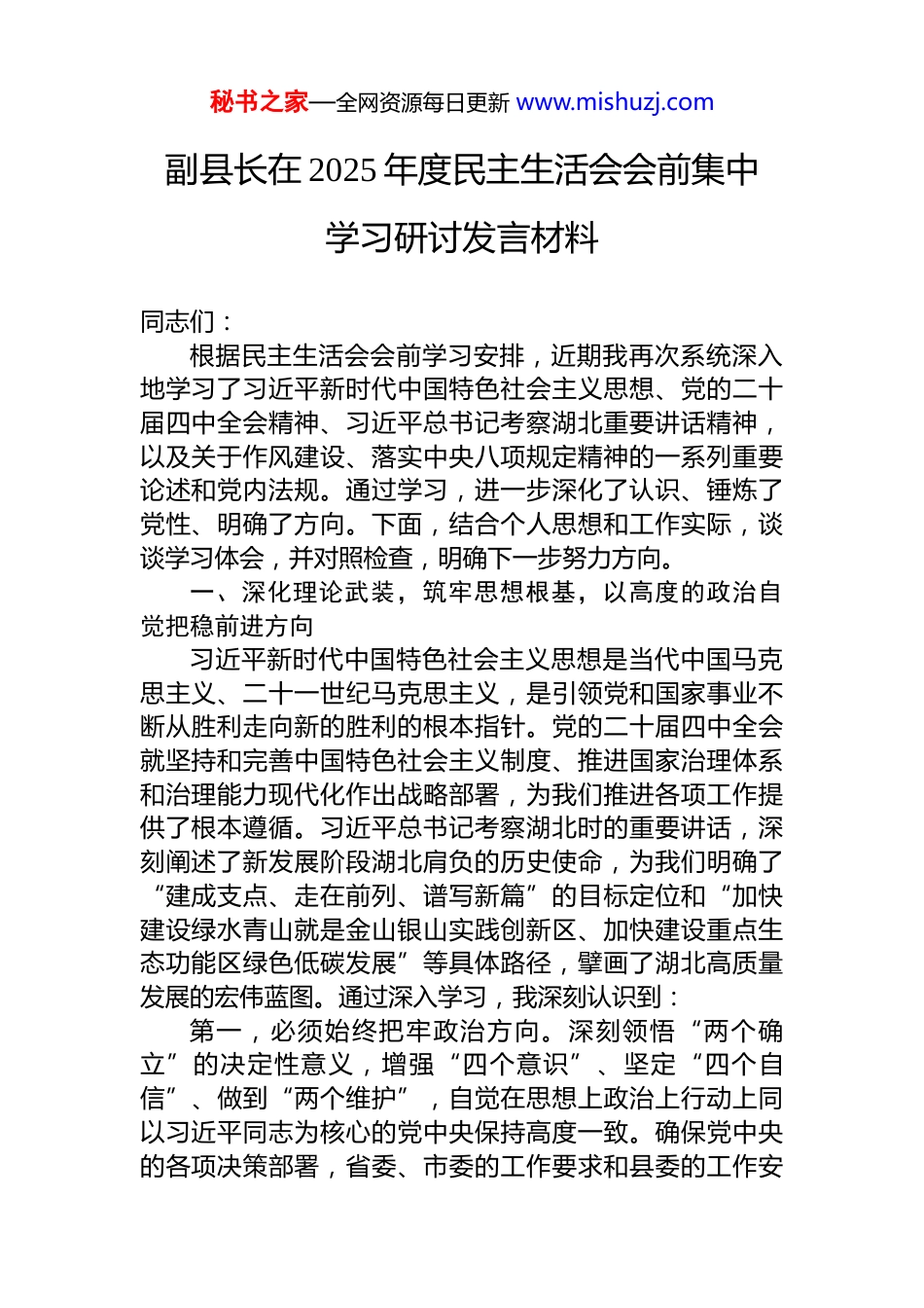 秘书之家—全网资源每日更新 www.mishuzj.com副县长在 2025 年度民主生活会会前集中学习研讨发言材料同志们:根据民主生活会会前学习安排,近期我再次系统深入地学习了习近平新时代中国特色社会主义思想、党的二十届四中全会精神、习近平总书记考察湖北重要讲话精神,以及关于作风建设、落实中央八项规定精神的一系列重要论述和党内法规。通过学习,进一步深化了认识、锤炼了党性、明确了方向。下面,结合个人思想和工作实际,谈谈学习体会,并对照检查,明确下一步努力方向。一、深化理论武装,筑牢思想根基,以高度的政治自觉把稳前进方向习近平新时代中国特色社会主义思想是当代中国马克思主义、二十一世纪马克思主义,是引领党和国家事业不断从胜利走向新的胜利的根本指针。党的二十届四中全会就坚持和完善中国特色社会主义制度、推进国家治理体系和治理能力现代化作出战略部署,为我们推进各项工作提供了根本遵循。习近平总书记考察湖北时的重要讲话,深刻阐述了新发展阶段湖北肩负的历史使命,为我们明确了“建成支点、走在前列、谱写新篇”的目标定位和“加快建设绿水青山就是金山银山实践创新区、加快建设重点生态功能区绿色低碳发展”等具体路径,擘画了湖北高质量发展的宏伟蓝图。通过深入学习,我深刻认识到:第一,必须始终把牢政治方向。深刻领悟“两个确立”的决定性意义,增强“四个意识”、坚定“四个自信”、做到“两个维护”,自觉在思想上政治上行动上同以习近平同志为核心的党中央保持高度一致。确保党中央的各项决策部署,省委、市委的工作要求和县委的工作安秘书之家—全网资源每日更新 www.mishuzj.com排,在我分管的工业经济、招商引资、市场监管等领域不折不扣落地生根。第二,必须始终坚持思想引领。习近平新时代中国特色社会主义思想蕴含的世界观、方法论是指导我们认识世界、改造世界的强大思想武器。必须坚持好、运用好贯穿其中的立场观点方法,特别是关于推动高质量发展、发展新质生产力、统筹发展和安全、促进人与自然和谐共生等重要论述,用以武装头脑、指导实践、推动工作。第三,必须始终心怀“国之大者”。自觉将分管工作置于党和国家事业发展全局、置于湖北“建成中部地区崛起重要战略支点”的大局中来谋划推进。深刻理解“绿水青山就是金山银山”的理念内涵,准确把握重点生态功能区绿色低碳发展的内在要求,处理好工业发展、项目引进与生态环境保护的关系,坚决不走先污染后治理的老路,积极探索生态优先、绿色崛起的新路。第四,必须始终坚持自我革命。作风建设永远在路上。中央八项规定是长期有效的铁规矩、硬杠杠。必须深刻认识作风问题的顽固性、反复性,以打攻坚战、持久战的决心和恒心,持续深化落实中央八项规定精神,驰而不息纠治“四风”,推进作风建设常态化长效化,营造风清气正、干事创业的良好政治生态。二、坚持问题导向,深入查摆剖析,以彻底的自我革命精神检视不足对照习近平新时代中国特色社会主义思想,对照党的二十届四中全会精神和习近平总书记对湖北工作的殷殷嘱托,对照党章党规党纪,对照初心使命和人民群众新期待,结合征求到的意见建议和个人反思,深感自身在思想、政治、作风、能力、廉洁等方面还存在一些差距和不足,主要表现在:(一)理论学习的系统性和转化运用有待加强。虽然能够坚持学习,但在深钻细研、融会贯通上还不够,特别秘书之家—全网资源每日更新 www.mishuzj.com是将党的创新理论中蕴含的立场观点方法,创造性地运用到破解我县工业经济结构不优、产业链韧性不强、科技创新驱动力不足等深层次矛盾上,思路还不够开阔,举措的创新性、针对性有待提升。运用理论指导“绿水青山就是金山银山”实践创新,推动生态工业、绿色招商的具体路径探索还需要深化。(二)贯彻落实的穿透力和精准度有待提升。在推动上级决策部署落实过程中,有时存在“上下一般粗”的现象,结合我县工业基础和资源禀赋进行精细化设计、差异化落实不够。例如,在落实“加快建设重点生态功能区绿色低碳发展”要求方面,虽然强调了环保门槛,但在系统性构建绿色制造体系、推动工业园区循环化改造、引进培育绿色低碳产业项目...